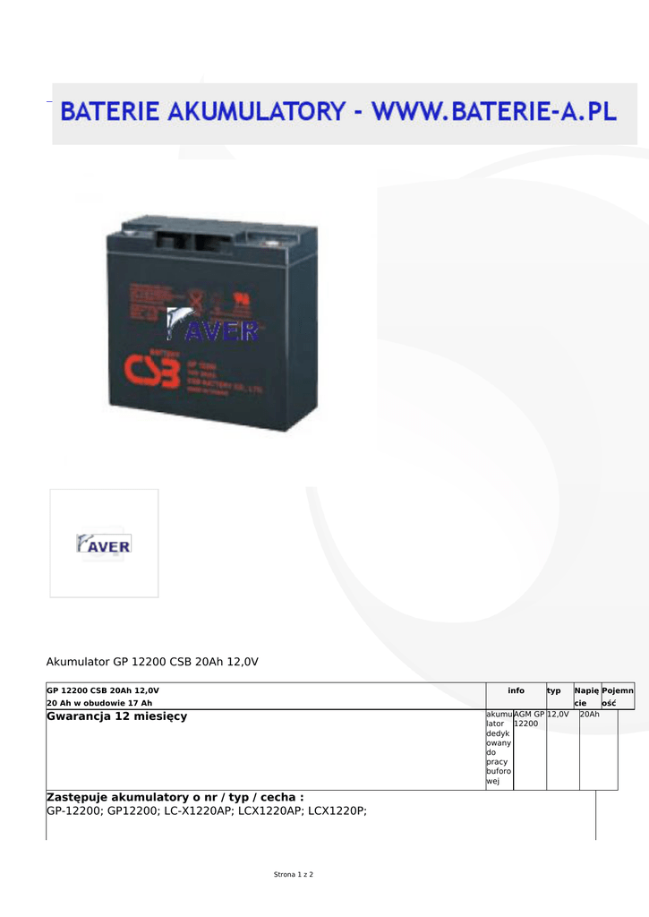 Akumulator GP 12200 CSB 20Ah 12,0V GP 12200 CSB 20Ah 12,0V info typ 20 Ah w obudowie 17 Ah akumu AGM GP 12,0V lator 12200 dedyk owany do pracy buforo wej Gwarancja 12 miesięcy Zastępuje akumulatory o nr / typ / cecha : GP-12200; GP12200; LC-X1220AP; LCX1220AP; LCX1220P; Strona 1 z 2 Napię Pojemn cie ość 20Ah Używany w : Panasonic LC-X1220P / LCX1220AP Injusa High Power IJ20-12 HR Vision CP12200 Zastosowania: Praca buforowa UPS Sprzęt medyczny Telekomunikacja Automatyka Oświetlenie awaryjne Systemy nadzoru Telefonia komórkowa Ochrona katodowa Pomoce nawigacyjne Sprzęt okrętowy Systemy zasilania Wymiary:167x181x76 mm. Waga 6,4 kg. Karta katalogowa akumulatora GP 12200 CSB 20Ah 12,0V Zapytaj o alternatywne wykonanie tego produktu Złóż zapytanie mailem [email protected] Akumulator bezobsługowy serii GP Seria GP to nowoczesne akumulatory bezobsługowe zaprojektowane do pracy buforowej i cyklicznej, produkowane zgodnie z wymaganiami bezpieczeństwa, jakości oraz ochrony środowiska. Główne cechy: powyżej 260 cykli ładowania / 100% rozładowania w pracy cyklicznej 5 lat projektowana żywotność (w 25C) w pracy buforowej Strona 2 z 2