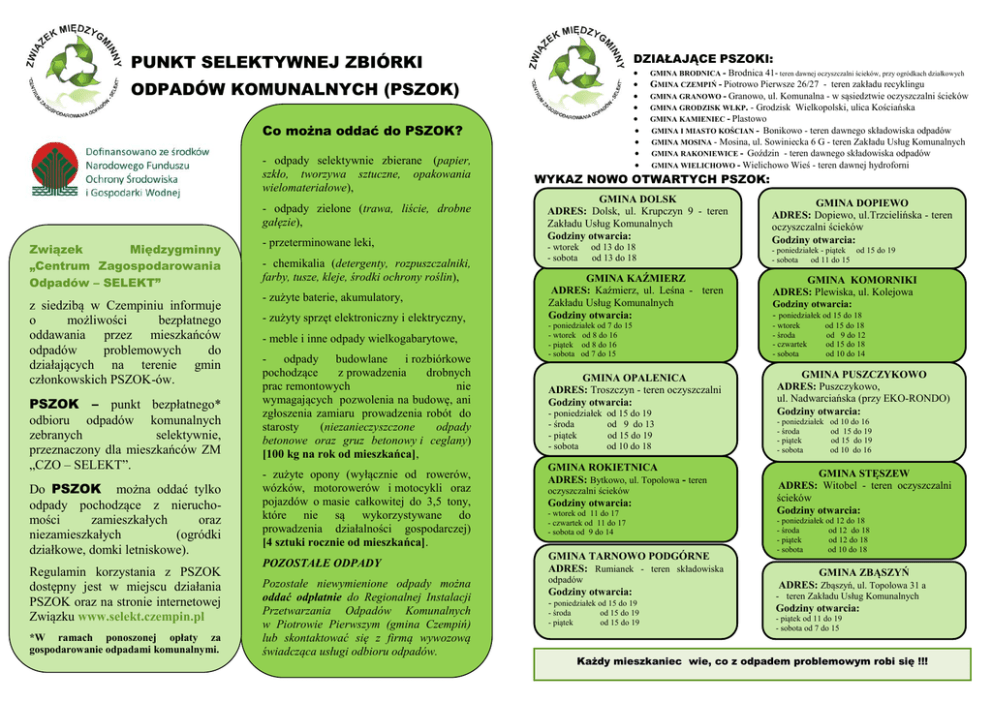 PUNKT SELEKTYWNEJ ZBIÓRKI DZIAŁAJĄCE PSZOKI: ODPADÓW KOMUNALNYCH (PSZOK) Co można oddać do PSZOK? - odpady selektywnie zbierane (papier, szkło, tworzywa sztuczne, opakowania wielomateriałowe), - odpady zielone (trawa, liście, drobne gałęzie), Związek Międzygminny „Centrum Zagospodarowania Odpadów – SELEKT” z siedzibą w Czempiniu informuje o możliwości bezpłatnego oddawania przez mieszkańców odpadów problemowych do działających na terenie gmin członkowskich PSZOK-ów. PSZOK – punkt bezpłatnego* odbioru odpadów komunalnych zebranych selektywnie, przeznaczony dla mieszkańców ZM „CZO – SELEKT”. Do PSZOK można oddać tylko odpady pochodzące z nieruchomości zamieszkałych oraz niezamieszkałych (ogródki działkowe, domki letniskowe). Regulamin korzystania z PSZOK dostępny jest w miejscu działania PSZOK oraz na stronie internetowej Związku www.selekt.czempin.pl *W ramach ponoszonej opłaty za gospodarowanie odpadami komunalnymi. - przeterminowane leki, - chemikalia (detergenty, rozpuszczalniki, farby, tusze, kleje, środki ochrony roślin), - zużyte baterie, akumulatory, - zużyty sprzęt elektroniczny i elektryczny, - meble i inne odpady wielkogabarytowe, - odpady budowlane i rozbiórkowe pochodzące z prowadzenia drobnych prac remontowych nie wymagających pozwolenia na budowę, ani zgłoszenia zamiaru prowadzenia robót do starosty (niezanieczyszczone odpady betonowe oraz gruz betonowy i ceglany) [100 kg na rok od mieszkańca], - zużyte opony (wyłącznie od rowerów, wózków, motorowerów i motocykli oraz pojazdów o masie całkowitej do 3,5 tony, które nie są wykorzystywane do prowadzenia działalności gospodarczej) [4 sztuki rocznie od mieszkańca]. POZOSTAŁE ODPADY Pozostałe niewymienione odpady można oddać odpłatnie do Regionalnej Instalacji Przetwarzania Odpadów Komunalnych w Piotrowie Pierwszym (gmina Czempiń) lub skontaktować się z firmą wywozową świadcząca usługi odbioru odpadów. GMINA BRODNICA - Brodnica 41- teren dawnej oczyszczalni ścieków, przy ogródkach działkowych GMINA CZEMPIŃ - Piotrowo Pierwsze 26/27 - teren zakładu recyklingu GMINA GRANOWO - Granowo, ul. Komunalna - w sąsiedztwie oczyszczalni ścieków GMINA GRODZISK WLKP. - Grodzisk Wielkopolski, ulica Kościańska GMINA KAMIENIEC - Plastowo GMINA I MIASTO KOŚCIAN - Bonikowo - teren dawnego składowiska odpadów GMINA MOSINA - Mosina, ul. Sowiniecka 6 G - teren Zakładu Usług Komunalnych GMINA RAKONIEWICE - Goździn - teren dawnego składowiska odpadów GMINA WIELICHOWO - Wielichowo Wieś - teren dawnej hydroforni WYKAZ NOWO OTWARTYCH PSZOK: GMINA DOLSK ADRES: Dolsk, ul. Krupczyn 9 - teren Zakładu Usług Komunalnych Godziny otwarcia: - wtorek - sobota od 13 do 18 od 13 do 18 GMINA DOPIEWO ADRES: Dopiewo, ul.Trzcielińska - teren oczyszczalni ścieków Godziny otwarcia: - poniedziałek - piątek od 15 do 19 - sobota od 11 do 15 GMINA KAŹMIERZ ADRES: Kaźmierz, ul. Leśna - teren Zakładu Usług Komunalnych Godziny otwarcia: GMINA KOMORNIKI ADRES: Plewiska, ul. Kolejowa - poniedziałek od 7 do 15 - wtorek od 8 do 16 - piątek od 8 do 16 - sobota od 7 do 15 - wtorek - środa - czwartek - sobota GMINA OPALENICA ADRES: Troszczyn - teren oczyszczalni Godziny otwarcia: - poniedziałek - środa - piątek - sobota od 15 do 19 od 9 do 13 od 15 do 19 od 10 do 18 GMINA ROKIETNICA ADRES: Bytkowo, ul. Topolowa - teren oczyszczalni ścieków Godziny otwarcia: - wtorek od 11 do 17 - czwartek od 11 do 17 - sobota od 9 do 14 GMINA TARNOWO PODGÓRNE ADRES: Rumianek - teren składowiska odpadów Godziny otwarcia: - poniedziałek od 15 do 19 - środa - piątek od 15 do 19 od 15 do 19 Godziny otwarcia: - poniedziałek od 15 do 18 od 15 do 18 od 9 do 12 od 15 do 18 od 10 do 14 GMINA PUSZCZYKOWO ADRES: Puszczykowo, ul. Nadwarciańska (przy EKO-RONDO) Godziny otwarcia: - poniedziałek - środa - piątek - sobota od 10 do 16 od 15 do 19 od 15 do 19 od 10 do 16 GMINA STĘSZEW A ADRES: Witobel - teren oczyszczalni ścieków Godziny otwarcia: - poniedziałek od 12 do 18 - środa od 12 do 18 - piątek od 12 do 18 - sobota od 10 do 18 GMINA ZBĄSZYŃ ADRES: Zbąszyń, ul. Topolowa 31 a - teren Zakładu Usług Komunalnych Godziny otwarcia: - piątek od 11 do 19 - sobota od 7 do 15 Każdy mieszkaniec wie, co z odpadem problemowym robi się !!!