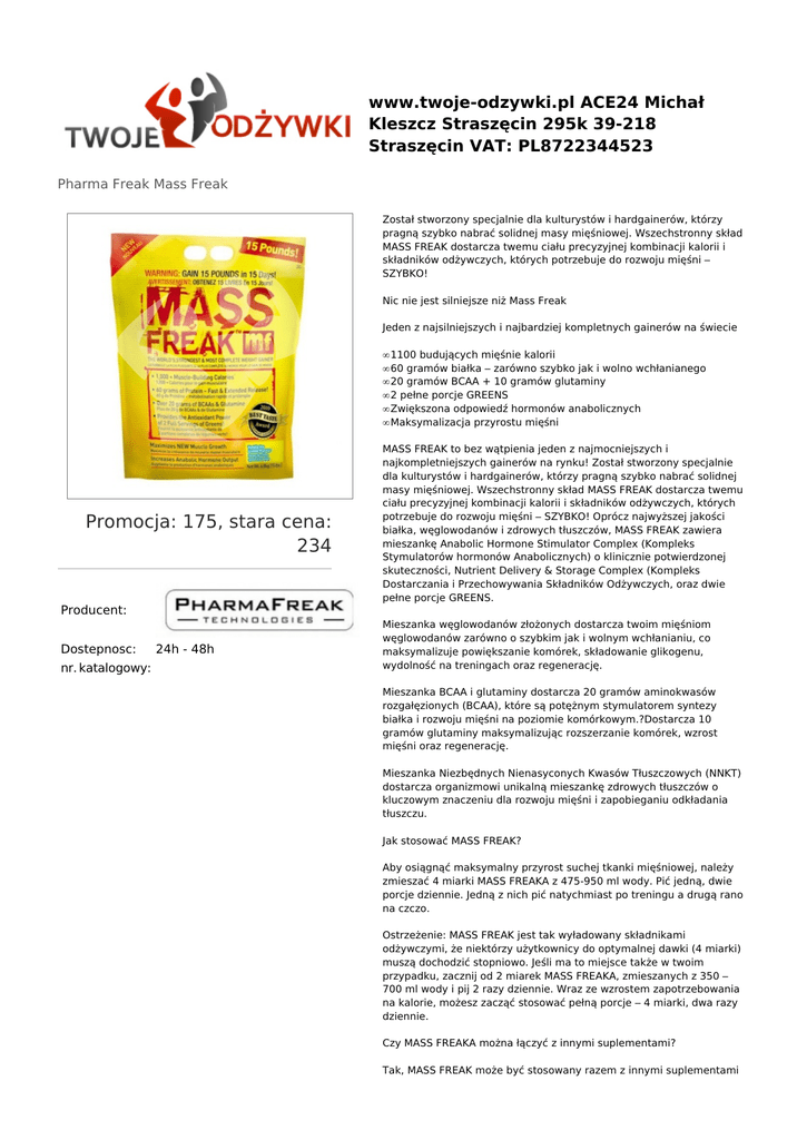 www.twoje-odzywki.pl ACE24 Michał Kleszcz Straszęcin 295k 39-218 Straszęcin VAT: PL8722344523 Pharma Freak Mass Freak Został stworzony specjalnie dla kulturystów i hardgainerów, którzy pragną szybko nabrać solidnej masy mięśniowej. Wszechstronny skład MASS FREAK dostarcza twemu ciału precyzyjnej kombinacji kalorii i składników odżywczych, których potrzebuje do rozwoju mięśni – SZYBKO! Nic nie jest silniejsze niż Mass Freak Jeden z najsilniejszych i najbardziej kompletnych gainerów na świecie • • • • • • Promocja: 175, stara cena: 234 Producent: Dostepnosc: nr. katalogowy: 24h - 48h 1100 budujących mięśnie kalorii 60 gramów białka – zarówno szybko jak i wolno wchłanianego 20 gramów BCAA + 10 gramów glutaminy 2 pełne porcje GREENS Zwiększona odpowiedź hormonów anabolicznych Maksymalizacja przyrostu mięśni MASS FREAK to bez wątpienia jeden z najmocniejszych i najkompletniejszych gainerów na rynku! Został stworzony specjalnie dla kulturystów i hardgainerów, którzy pragną szybko nabrać solidnej masy mięśniowej. Wszechstronny skład MASS FREAK dostarcza twemu ciału precyzyjnej kombinacji kalorii i składników odżywczych, których potrzebuje do rozwoju mięśni – SZYBKO! Oprócz najwyższej jakości białka, węglowodanów i zdrowych tłuszczów, MASS FREAK zawiera mieszankę Anabolic Hormone Stimulator Complex (Kompleks Stymulatorów hormonów Anabolicznych) o klinicznie potwierdzonej skuteczności, Nutrient Delivery & Storage Complex (Kompleks Dostarczania i Przechowywania Składników Odżywczych, oraz dwie pełne porcje GREENS. Mieszanka węglowodanów złożonych dostarcza twoim mięśniom węglowodanów zarówno o szybkim jak i wolnym wchłanianiu, co maksymalizuje powiększanie komórek, składowanie glikogenu, wydolność na treningach oraz regenerację. Mieszanka BCAA i glutaminy dostarcza 20 gramów aminokwasów rozgałęzionych (BCAA), które są potężnym stymulatorem syntezy białka i rozwoju mięśni na poziomie komórkowym.?Dostarcza 10 gramów glutaminy maksymalizując rozszerzanie komórek, wzrost mięśni oraz regenerację. Mieszanka Niezbędnych Nienasyconych Kwasów Tłuszczowych (NNKT) dostarcza organizmowi unikalną mieszankę zdrowych tłuszczów o kluczowym znaczeniu dla rozwoju mięśni i zapobieganiu odkładania tłuszczu. Jak stosować MASS FREAK? Aby osiągnąć maksymalny przyrost suchej tkanki mięśniowej, należy zmieszać 4 miarki MASS FREAKA z 475-950 ml wody. Pić jedną, dwie porcje dziennie. Jedną z nich pić natychmiast po treningu a drugą rano na czczo. Ostrzeżenie: MASS FREAK jest tak wyładowany składnikami odżywczymi, że niektórzy użytkownicy do optymalnej dawki (4 miarki) muszą dochodzić stopniowo. Jeśli ma to miejsce także w twoim przypadku, zacznij od 2 miarek MASS FREAKA, zmieszanych z 350 – 700 ml wody i pij 2 razy dziennie. Wraz ze wzrostem zapotrzebowania na kalorie, możesz zacząć stosować pełną porcje – 4 miarki, dwa razy dziennie. Czy MASS FREAKA można łączyć z innymi suplementami? Tak, MASS FREAK może być stosowany razem z innymi suplementami diety. Aby osiągnąć maksymalne przyrosty, wielu użytkowników łączy MASS FREAKA z TEST FREAKIEM, jednym z najsilniejszych i najlepiej udowodnionych klinicznie boosterze testosteronu! Czy za sprawą MASS FREAK nie zaleję się tłuszczem? Nie! Stosowanie MASS FREAK wywołuje przyrostu masy tłuszczowej. Jeśli ciężko trenujesz, składniki MASS FREAKA pomogą ci zreperować i nadbudować mięśnie. Nutrient Delivery & Storage Complex, który można znaleźć w MASS FREAKU zawiera składnik pozwalający wykorzystać siłę insuliny i dostarczyć zawarte w MASS FREAKU składniki odżywcze bezpośrednio do tkanki mięśniowej, nie pozwalając by gromadziły się w organizmie pod postacią tłuszczu. Czy po zaprzestaniu stosowania MASS FREAKA osiągnie ten na nim postępy zostaną utracone? Nie! Po odstawieniu MASS FREAKA będziesz w stanie zachować przyrosty siły i masy mięśniowej tak długo jak będziesz ciężko trenował i stosował dobry plan dietetyczny. MASS FREAK to JEDYNY gainer, który spełnia następujące warunki: 1. Połowa dostarczanego białka pochodzi z izolatu białka serwatkowego. 2. Podstawowym źródłem węglowodanów jest skrobia woskowa (waxy maize). 3. Nie zawiera żadnego dodatkowego cukru. 4. Nie zawiera tłuszczów o niskiej jakości, a jedynie CLA, MCT (średniołańcuchowe kwasy tłuszczowe) oraz olej słonecznikowy. 5. Zawiera mniej niż gram tłuszczów nasyconych w porcji. 6. Nie zawiera soi ani składników pochodnych. 7. Zawiera ? 24 witaminy i składniki mineralne na poziomie 40% dziennego zapotrzebowania (według amerykańskich norm żywieniowych) lub wyższym oraz 1500 mg wapnia wpływającego na poziom testosteronu. 8. Dostarcza przeciwutleniaczy w ilości odpowiadającej dwóm porcjom Greens. 9. Dostarcza nowo - opracowanego aminokwasu podnoszącego poziom testosteronu: kwas D - asparginowy. 10. Zawiera AminoAbsorb 5000, glikomakropeptydy białka serwatkowego o udowodnionej naukowo skuteczności, które zmniejszają prędkość transportu aminokwasów w miejscach kluczowych dla ich wchłaniania. Przedłużone przebywanie aminokwasów w tych miejscach przekłada się na lepsze ich wchłanianie i pełniejsze wykorzystanie w tkankach mięśniowych. Forma: Proszek Losowy gratis x 2, gratis dostępny przy zamówieniu pow. 99zł Losowy gratis x 3, gratis dostępny przy zamówieniu pow. 299zł Losowy gratis x 4, gratis dostępny przy zamówieniu pow. 399zł www.twoje-odzywki.pl ACE24 Michał Kleszcz Straszęcin 295k 39-218 Straszęcin VAT: PL8722344523