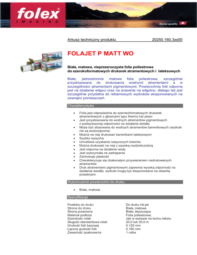 Arkusz techniczny produktu 20250.160.3xx00 FOLAJET P MATT WO Bia a, matowa, nieprzezroczysta folia poliestrowa do szerokoformatowych drukarek atramentowych i lateksowych Bia a, jednostronnie matowa folia poliestrowa, szczególnie przystosowana do drukowania wodnymi atramentami a w szczególno ci atramentami pigmentowymi. Powierzchnia folii odporna jest na dzia anie wilgoci oraz na cieranie na wilgotno, dlatego te jest szczególnie przydatna do reklamowych wydruków eksponowanych na zewn trz pomieszcze . Charakterystyka Folia jest odpowiednia do szerokoformatowych drukarek atramentowych z g owicami typu thermo lub piezo Jest przystosowana do wodnych atramentów pigmentowych o podwy szonej odporno ci na dzia anie wiat a Mo e by stosowana do wodnych atramentów barwnikowych (wydruki nie s wodoodporne) Mo na na niej drukowa barwnikami lateksowymi Szybko wysycha Umo liwia uzyskanie nasyconych kolorów Mo na drukowa na niej z wysok rozdzielczo ci Jest odporna na dzia anie wody Jest wytrzyma a na zadrapania Zachowuje p asko Charakteryzuje si doskona ym przywieraniem nadrukowanych atramentów Druk atramentami pigmentowymi zapewnia wysok odporno na dzia anie wiat a, wydruki mog by eksponowane na otwartej przestrzeni. Wyko czenie powierzchni do druku Bia a, matowa Specyfikacja Pow oka do druku Strona do druku Strona przeciwna Materia pod a Szeroko rolek ugo standardowa rolek Grubo folii bazowej czna grubo folii Zawarto opakowania Do druku ink-jet Bia a, matowa Bia a, b yszcz ca Folia poliestrowa, Jak w wykazie na ko cu tekstu 20,0 lub 30,0 m 0.125 mm 0,160 mm 1 rolka Arkusz techniczny produktu – d.c. 20250.160.3xx00 Kompatybilno Przydatna do wi kszo ci drukarek szerokoformatowych drukuj cych wodnymi atramentami pigmentowymi. Wodne atramenty barwnikowe – po pozytywnych próbach. Jest przystosowana do drukarek drukuj cych barwnikami lateksowymi. Folia nie jest przydatna do atramentów zawieraj cych oleje lub rozpuszczalniki. Obróbka W pomieszczeniach roboczych temperatura powinna wynosi 15 do 300C, wilgotno wzgl. 30 – 70%. Zaleca si 24-godzinne dopasowanie temperatury folii do temperatury pomieszczenia roboczego. Ink-Load: ca. 260-300% (mo e si waha w zale no ci od systemu podaj cego atrament) Ustawienia plotera: jako fotograficzna, papier powlekany, lub podobne. Produkt nale y chroni przed pozostawianiem odcisków palców. Laminowanie: na zimno – mo liwe, na gor co – po wykonaniu prób. Ekspozycja na zewn trz pomieszcze : do 3 miesi cy, powy ej tego czasu - konieczne laminowanie ochronne. Strona do nadruku: matowa. Sk adowanie Sk adowanie w pomieszczeniach o temp. 15-250C i wilgotno ci wzgl dnej od 30 do 60%. Czas sk adowania – 1 rok od daty dostawy (w zamkni tych opakowaniach przy zachowaniu temperatury i wilgotno ci – jak w punkcie poprzednim). Po tym terminie mo e wyst pi pogorszenie jako ci wydruków. Opakowania Role Art.-Nr 20250.160.34200 20250.160.35900 20250.160.36100 20250.160.39000 20250.160.39200 20250.160.30500 20250.160.30700 20250.160.31000 20250.160.31200 20250.160.32000 20250.160.32200 Grubo w mm 0,160 0,160 0,160 0,160 0,160 0,160 0,160 0,160 0,160 0,160 0,160 Szeroko w mm 431 610 610 914 914 1067 1067 1118 1118 1270 1270 ugo wm 30 20 30 20 30 20 30 20 30 20 30 10.2011