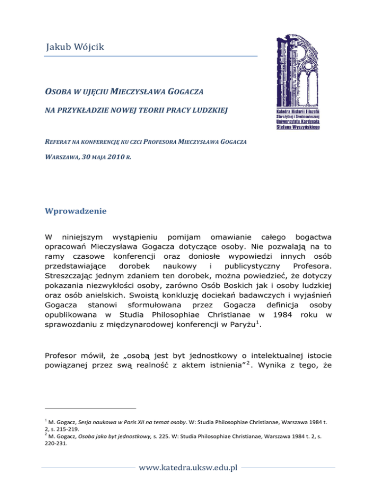 Jakub Wó jcik OSOBA W UJĘCIU MIECZYSŁAWA GOGACZA NA PRZYKŁADZIE NOWEJ TEORII PRACY LUDZKIEJ REFERAT NA KONFERENCJĘ KU CZCI PROFESORA MIECZYSŁAWA GOGACZA WARSZAWA, 30 MAJA 2010 R. Wprowadzenie W niniejszym wystąpieniu pomijam omawianie całego bogactwa opracowań Mieczysława Gogacza dotyczące osoby. Nie pozwalają na to ramy czasowe konferencji oraz doniosłe wypowiedzi innych osób przedstawiające dorobek naukowy i publicystyczny Profesora. Streszczając jednym zdaniem ten dorobek, można powiedzieć, że dotyczy pokazania niezwykłości osoby, zarówno Osób Boskich jak i osoby ludzkiej oraz osób anielskich. Swoistą konkluzję dociekań badawczych i wyjaśnień Gogacza stanowi sformułowana przez Gogacza definicja osoby opublikowana w Studia Philosophiae Christianae w 1984 roku w sprawozdaniu z międzynarodowej konferencji w Paryżu1. Profesor mówił, że „osobą jest byt jednostkowy o intelektualnej istocie powiązanej przez swą realność z aktem istnienia” 2 . Wynika z tego, że 1 M. Gogacz, Sesja naukowa w Paris XII na temat osoby. W: Studia Philosophiae Christianae, Warszawa 1984 t. 2, s. 215-219. 2 M. Gogacz, Osoba jako byt jednostkowy, s. 225. W: Studia Philosophiae Christianae, Warszawa 1984 t. 2, s. 220-231. www.katedra.uksw.edu.pl 2 osoba jest podmiotem relacji i działań, nie zaś jest konstytuowana przez relacje lub działania3. Wydaje się ważne przypomnienie tej kolejności, gdyż obserwujemy propagowanie pierwszeństwa relacji przed osobami, mimo deklarowania podmiotowości osób. Występuje to zjawisko w wyjaśnianiu relacji osobowych miłości, wiary i nadziei oraz relacji życia 4 . Ten sposób wyjaśniania dotyczy też relacji istotowych nazywanych poznaniem i postępowaniem. Chcę to omówić na przykładzie relacji pracy ludzkiej. Uwagi metodologiczne W wyjaśnianiu relacji funkcjonują dwa sposoby wyjaśnień, przy czym dominujące jest błędne. Wiadomo, że relacja pracy – jak każda relacja – ma swój podmiot nadający nazywany krótko podmiotem i podmiot odbierający zwany kresem. Jest też tak zwana racja relacji. Nie będę omawiał szerokiego zagadnienia „ratio”, bo wymagałoby to osobnej konferencji filozoficznej. Mówiąc krótko, racją relacji pracy jest swoisty jej skutek. Takim skutkiem może być – choć nie musi nastąpić – wytwór, zarobek, wymierny sukces, pozycja społeczna itd. W potocznym ujmowaniu pracy ludzkiej i także w dominującej metodologii, czyni się punktem wyjścia wyjaśnień rację tej relacji. W zależności od przyjętej racji pojawiają się różne definicje pracy. Są też specjaliści, którzy twierdzą, że pracy w ogóle nie można zdefiniować.5 Ale najważniejsze w takim ujęciu jest zauważenie błędu metodologicznego. 3 T. Klimski, Trzy etapy w historii definiowania osoby. W: Studia Philosophiae Christianae, Warszawa 1984 t. 2, s. 232-237. 4 Zwłaszcza życie rozważa się samo w sobie i albo utożsamia się je z istnieniem, albo się rozważa jako samodzielny byt dodany do istnienia. 5 Por. P. Ricoeur, Trawail et parole. W: Histoire et verite, Paris 1955 lub R.C. Kwant, Philosophy of labor, Louvain 1960. Podobne postępowanie badawcze występuje w omawianiu np. wychowania. 3 Praca analizowana od strony racji staje się przedmiotem rozważań pracy samej w sobie. Mimo deklarowania o niej, że jest relacją, staje się samodzielnym podmiotem. Człowiek ujmowany jest w pozycji wtórnej do tej relacji. Lapidarnie ujmuje to znane marksistowskie twierdzenie, że „praca tworzy człowieka”. Konsekwencją tego błędu są opracowania – także w środowiskach dalekich od marksizmu – ujmujące pracę ludzką, jako relację człowieka do przyrody. Tak więc nie zauważa się tego błędu. Profesor Gogacz i jego uczniowie wyrażają stanowisko, że podmiotem i kresem pracy są osoby i odróżniają podmioty od racji tej relacji. Przykładem może być praca matki w rodzinie, która nie daje żadnego wynagrodzenia pieniężnego. Św.Tomasz z Akwinu twierdzi, że przykładem na wskroś ludzkiej pracy jest praca kaznodziei, nauczyciela, wychowawcy, mimo że nie powoduje ona wytworów. Praca jako sposób ochrony osób Praca ludzka – jako relacja między osobami – wpisuje się w koncepcję etyki chronienia osób sformułowaną przez Mieczysława Gogacza 6. Etyka, jako nauka o postępowaniu aktualizującym osobową relację nadziei podejmuje także temat pracy ludzkiej. Na temat etyki pracy ludzkiej mamy dostępnych wiele opracowań. Większość z nich podejmuje ten temat jednak z pozycji racji relacji pracy i często utożsamiając ją z kresem. Praca ujęta z pozycji osób odsłania szersze wyjaśnienia etyki pracy. Przede wszystkim wymaga wykrycia, co w osobie jest podmiotem pracy, a co jest jej kresem. Analiza korzystająca z metafizyki bytu naprowadza nas do odkrycia, że podmiotem nadającym relację pracy jest subsystencja osoby, a kresem są przypadłości człowieka. 6 M. Gogacz, Ku etyce chronienia osób, Warszawa 1991 lub M. Gogacz, Wprowadzenie do etyki chronienia osób, Warszawa 1998. 4 Przypomnijmy, że subsystencja – tak to nazwał św. Tomasz – jest istotą powiązaną z istnieniem i przypadłościami. Akwinata odróżnił więc istotę (quidditas) jako tylko treściowe ujęcie bytu od realnej istoty mającej w sobie ślady istnienia i przypadłości. Od razu powiedzmy, że gdy podmiotem nadającym jest moja subsystencja, to mówimy o tzw. pracy nad sobą. Gdy mówimy o pracy jako relacji między osobami, to podmiotem nadającym jest subsystencja drugiej osoby. Kresem są przypadłości osoby odbierającej tę relację, co owocuje doskonaleniem tych przypadłości. Trzeba zauważyć, że w takim zakorzenieniu tematu pracy zagadnienie wykracza poza obszar nadziei, jako relacji osobowej budującej się na dobru. Nadzieja jest relacją komplementarną z miłością i wiarą. Praca jest więc sposobem chronienia istnienia przejawiającego się nie tylko dobrem, ale także rea