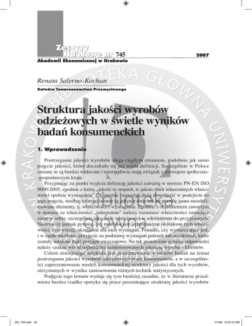 Zeszyty Naukowe nr 745 Akademii Ekonomicznej w Krakowie 2007 Renata Salerno-Kochan Katedra Towaroznawstwa Przemysłowego Struktura jakości wyrobów odzieżowych w świetle wyników badań konsumenckich 1. Wprowadzenie Postrzeganie jakości wyrobów ulega ciągłym zmianom, podobnie jak samo pojęcie jakości, które doczekało się już wielu definicji. Szczególnie w Polsce zmiany te są bardzo widoczne i niewątpliwie mają związek z rozwojem społeczno-gospodarczym kraju. Przyjmując za punkt wyjścia definicję jakości zawartą w normie PN-EN ISO 9000:2005, zgodnie z którą „jakość to stopień, w jakim zbiór inherentnych właściwości spełnia wymagania” [3], można zauważyć dużą dowolność w podejściu do tego pojęcia, według którego istotne są jedynie dwa, tak na prawdę jasno niezdefiniowane elementy, tj. właściwości i wymagania. Zgodnie z objaśnieniem zawartym w normie za właściwości „inherentne” należy rozumieć właściwości istniejące same w sobie, szczególnie jako stałe właściwości w odróżnieniu do przypisanych. Nasuwa się jednak pytanie, czy możliwe jest jednoznaczne określenie tych właściwości, i co więcej, określenie dla nich wymagań. Ponadto, czy wystarczające jest, i w ogóle możliwe, przyjęcie za podstawę wymagań potrzeb lub oczekiwań, które zostały ustalone bądź przyjęte zwyczajowo. Na tak postawione pytania odpowiedzi należy szukać wśród najbardziej zainteresowanych jakością wyrobu – klientów. Celem niniejszego artykułu jest przedstawienie wyników badań na temat postrzegania jakości wyrobów odzieżowych przez konsumentów, a w szczególności zaprezentowanie modeli konsumenckiej struktury jakości dla tych wyrobów, otrzymanych w wyniku zastosowania różnych technik statystycznych. Podjęcie tego tematu wydaje się tym bardziej zasadne, że w literaturze przedmiotu bardzo rzadko spotyka się prace prezentujące strukturę jakości wyrobów ZN_745.indb 45 7/7/08 9:10:12 AM Renata Salerno-Kochan 46 odzieżowych od strony konsumenta. A nawet jeżeli zagadnienia te były przedmiotem opracowań [9, 10], to nie uwzględniają najnowszych trendów zachowania się konsumentów na rynku wyrobów odzieżowych. 2. Zakres i metodyka badań 2.1. Zakres badań Badania na temat postrzegania jakości wyrobów tekstylnych przez konsumentów zostały przeprowadzone na przełomie lat 2005 i 2006 metodą bezpośredniego wywiadu oraz metodą wywiadu pośredniego za pomocą poczty e-mailowej. Obszarem objęły one całą Polskę, a w szczególności rejon Małopolski (ok. 60%), a także takie miasta, jak Warszawa, Toruń i Ostrów Wielkopolski. W badaniach wzięło udział 151 respondentów w wieku od 19 do 65 lat. Szczegółową strukturę ankietowanych przedstawia rys. 1. 40 30 20 10 20 0 40 Płeć 0 powyżej 60; 1% mężczyźni 31% 50 50–60; 9% 60 60 40–50; 9% 80 70 20–30; 45% kobiety 69% Struktura respondentów według wieku 30–40; 19% 100 80 poniżej 20; 19% Liczba respondentów 120 Struktura respondentów według płci Liczba respondentów 140 Wiek Rys. 1. Struktura respondentów uczestniczących w badaniach ankietowych Źródło: badania własne. Zdecydowaną przewagę wśród ankietowanych stanowiły kobiety (69%). Mężczyźni często rezygnowali z udziału w badaniach, argumentując, że zakupy odzieży dokonują przede wszystkim ich żony lub partnerki, które lepiej, według ich opinii, znają się na tych wyrobach. Również znacznie chętniej w badaniach uczestniczyli ludzie młodzi (do 30 lat), dlatego też oni stanowią znaczący udział w strukturze respondentów. ZN_745.indb 46 7/7/08 9:10:13 AM Struktura jakości wyrobów odzieżowych… 47 Osoby uczestniczące w badaniach poproszono o przyporządkowanie ocen w 7-stopniowej skali Likerta do 19 charakterystyk związanych z pojmowaniem jakości wyrobów odzieżowych. Zaproponowano te właściwości wyrobu, które są najczęściej przedmiotem zainteresowań badań towaroznawczych [6, 7, 9, 10], jak również takie atrybuty, jak marka wyrobu, moda i cena, które zajmują szczególne miejsce w badaniach marketingowych [1]. Celem poznania struktury jakości z punktu widzenia konsumenta dokonano hierarchizacji badanych charakterystyk oraz poddano analizie relacje występujące między nimi. 2.2. Metody analizy danych Uzyskane wyniki badań ankietowych poddano analizie statystycznej. W pierwszym etapie wyznaczono podstawowe statystyki opisowe: średnią arytmetyczną, niepewność standardową (odpowiadającą odchyleniu standardowemu średniej), medianę oraz kwartyle dla uzyskanych ocen. Posłużyły one do uporządkowania analizowanych charakterystyk według ich istotności w postrzeganiu jakości wyrobów odzieżowych. Szczególną uwagę zwrócono na wartości median, które z punktu widzenia teorii pomiaru uważane są za najbardziej trafne wskaźniki. Wskazują one na wartość środkową wśród uporządkowanych kategorii odpowiedzi, tj. wartość, powyżej której znajduje się ponad 50% odpowiedzi i poniżej której znajduje się 50% odpowiedzi [4]. Interesującym wskaźnikiem są również kwartyle (górny i dolny). Identyfikują one „skrajne wskazania” respondentów, czyli 25% ocen z przedziałów górnych lub dolnych. Wewnętrzne relacje występujące w uzyskanym zbiorze danych badano metodą głównych składowych PCA (Principal Component Analyses), dzięki której wyłoniono ortogonalne segmenty jakości wyrobów odzieżowych. Liczbę głównych składowych ustalono zgodnie z kryterium Kaislera, według którego każdy czynnik główny powinien wyjaśniać zmienność co najmniej jednej zmiennej pierwotnej. Wariancja tej nowej zmiennej jest określana mianem wartości własnej, a jej wartość graniczna jest większa od 1. W celu umożliwienia nazwania nowych zmiennych określono ładunki czynnikowe, które wyrażają stopień nasycenia zmiennej danym czynnikiem i stanowią dla nieskorelowanych czynników współczynniki kore