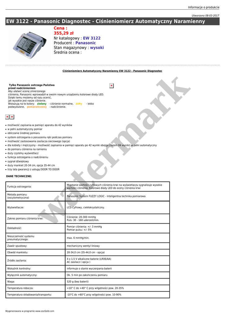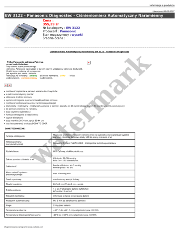 Informacje o produkcie Utworzono 08-03-2017 EW 3122 - Panasonic Diagnostec - Ciśnieniomierz Automatyczny Naramienny Cena : 355,29 zł Nr katalogowy : EW 3122 Producent : Panasonic Stan magazynowy : wysoki Średnia ocena : Ciśnieniomierz Automatyczny Naramienny EW 3122 - Panasonic Diagnostec er m ar k Tylko Panasonic ostrzega Państwa przed nadciśnieniem Aby ułatwić ocenę zmierzonego ciśnienia, Panasonic wprowadził w swoim nowym urządzeniu kolorowe diody LED. Dzięki temu możemy od razu ocenić, jak wysokie jest nasze ciśnienie. Wskazują na to kolory: zielony - ciśnienie normalne, żółty - lekko podwyższone, pomarańczowy - nadciśnienie. ● możliwość zapisania w pamięci aparatu do 42 wyników ● w pełni automatyczny pomiar ● obliczanie średniej pomiaru ● system ostrzegania o poruszeniu ręki podczas pomiaru ● możliwość zastosowania zasilacza sieciowego (opcja) ● dla kobiety i mężczyzny - możliwość zapisania w pamięci aparatu po 42 wyniki obojga (razem 84 wyniki) w pełni automatyczny ● do pomiaru ciśnienia na ramieniu ● duży czytelny wyświetlacz ● funkcja ostrzegania o nadciśnieniu ● sygnał dźwiękowy ● duży mankiet 20-34 cm, opcja 35-44 cm ● trzy lata gwarancji z usługą DOOR TO DOOR Funkcja ostrzegania: Metoda pomiaru: (oscylometryczna) w Wyświetlacze: at DANE TECHNICZNE: Migotanie wartości cyfrowych ciśnienia krwi na wyświetlaczu sygnalizuje wysokie wartości ciśnienia. Kolorowe diody LED do oceny ciśnienia krwi Panasonic System FUZZY LOGIC - Inteligentna technika pomiarowa LCD Cyfrowy, ciekłokrystaliczny. Zakres pomiaru ciśnienia krwi: Ciśnienie: 20-300 mmHg Puls: 30 - 160 uderzeń/min. Dokładność: Pomiar ciśnienia: +/- 3 mmHg Pomiar pulsu: +/- 5% Nieszczelność systemu pneumatycznego: max. 6 mmHg/min. Zawór spustowy: mechaniczny wentyl liniowy Obwód mankietu: 20-34,0 cm (35-44,0 cm - opcja) Źródło zasilania: 4 x 1,5 V alkaliczne baterie (LR06/AA) AC zasilacz ( opcja ) Wskaźnik kontrolny: informuje o stanie wyczerpania baterii Wyłącznik automatyczny: Ok. 5 min po zakończeniu pomiaru Waga: 520 g (bez baterii) Temperatura robocza: +10° C do +40° C przy wilgotności pow. 20-35% Temperatura składowania/transportu: -10°C do +60°C przy wilgotności pow. 10-90% Wygenerowano w programie www.oscGold.com er m ar k at w