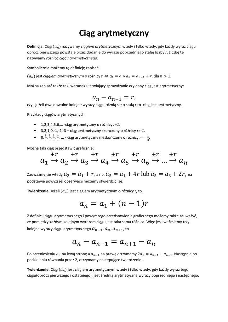 Ciąg arytmetyczny Definicja. Ciąg ( ) nazywamy ciągiem arytmetycznym wtedy i tylko wtedy, gdy każdy wyraz ciągu oprócz pierwszego powstaje przez dodanie do wyrazu poprzedniego stałej liczby r. Liczbę tę nazywamy różnicą ciągu arytmetycznego. Symbolicznie możemy tę definicję zapisać: ( ) jest ciągiem arytmetycznym o różnicy = ∧ = + , dla > 1. Można zapisać także taki warunek ułatwiający sprawdzanie czy dany ciąg jest arytmetyczny: − = , czyli jeżeli dwa dowolne kolejne wyrazy ciągu różnią się o stałą r to ciąg jest arytmetyczny. Przykłady ciągów arytmetycznych: • • 1,2,3,4,5,6,… -ciąg arytmetyczny o różnicy r=1, 3,2,1,0,-1,-2,-3 – ciąg arytmetyczny skończony o różnicy r=-1, • 0, , , , , … - ciąg arytmetyczny nieskończony o różnicy = . Można taki ciąg przedstawić graficznie: … Zauważmy, że wtedy = + , a np. = + 4 lub = + 2, na podstawie powyższej obserwacji możemy stwierdzić, że: Twierdzenie. Jeżeli ( ) jest ciągiem arytmetycznym o różnicy r, to = + ( − 1) Z definicji ciągu arytmetycznego i powyższego przedstawienia graficznego możemy także zauważyć, że pomiędzy każdym kolejnym wyrazem ciągu jest taka sama różnica. Więc jeśli weźmiemy trzy kolejne wyrazy ciągu arytmetycznego , , , to − = − Po przeniesieniu na lewą stronę a na prawą otrzymamy 2 = + . Następnie po podzieleniu równania przez 2, otrzymamy następujące twierdzenie: Twierdzenie. Ciąg ( ) jest ciągiem arytmetycznym wtedy i tylko wtedy, gdy każdy wyraz tego ciągu(oprócz pierwszego i ostatniego), jest średnią arytmetyczną wyrazy poprzedniego i następnego. + = 2 Można także mówić o sumie n-początkowych wyrazów ciągu ( ). Wyraża się ona wzorem: + % = + + + ⋯ + = ⋅ 2 Zastępując we wzorze wyrażeniem + ( − 1) otrzymujemy: 2 + ( − 1) % = ⋅ 2 Ciąg arytmetyczny – zadania wstępne Zad1. Które z podanych ciągów są arytmetycznymi? a) = 3 + 1; b) = 2; c) = 5 − 7; d) = e) = , , ; . Zad2. Znajdź k-ty wyraz ciągu. a) b) c) d) = −1, = 3, . = 10; = 0,75; = 0,5; . = 14; = 0; = −1,5; . = 13/ − = −1; 0 = 9; . = 12. Zad3. Wyznacz pierwszy wyraz ciągu arytmetycznego. a) = −92; = −3; b) - = 15,4; = 0,4; - - c) 0 = 100 ; = 5 . Zad4. Wyznacz różnicę r ciągu arytmecztycznego. a) = −12; = 65; b) = 3√3; = −42√3; c) = −9,1; 0 = −47,5. Zad5. Wyznacz wzór na n-ty wyraz ciągu, którego suma n początkowych wyrazów wyraża się wzorem: a) % = 3 − ; b) % = 5 − ; c) % = − .