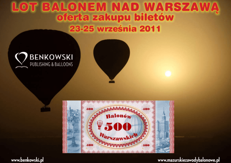 Lot Balonem nad Warszawą oferta zakupu biletów 23-25 września 2011 www.benkowski.pl www.mazurskiezawodybalonowe.pl www.benkowski.pl www.mazurskiezawodybalonowe.pl • Niniejszy banknot upoważnia do odbycia Jedyna lotu balonem około 1 godziny dla jednej osoby okazja odbycia • Ilość biletów ograniczona – 40 szt. lotu balonem • Wystawiamy fakturę VAT nad Warszawą • W cenie szampan + certyfikat I-szego lotu balonem 23-25.09. 2011 r. „500 Balonów Warszawskich” = wartość 500 zł netto/osobolot logo kupującego Rezerwacja biletów: 609 72 72 72 603 70 23 23 ISTNIEJE MOŻLIWOŚĆ UMIESZCZENIA REKLAMY NA NASZYCH BALONACH www.benkowski.pl www.mazurskiezawodybalonowe.pl