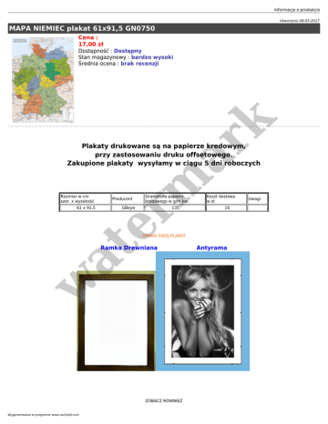 Informacje o produkcie Utworzono 08-03-2017 MAPA NIEMIEC plakat 61x91,5 GN0750 Cena : 17,00 zł er m ar k Dostępność : Dostępny Stan magazynowy : bardzo wysoki Średnia ocena : brak recenzji Plakaty drukowane są na papierze kredowym, przy zastosowaniu druku offsetowego. Zakupione plakaty wysyłamy w ciągu 5 dni roboczych Rozmiar w cm szer. x wysokość 61 x 91,5 Producent Gramatura papieru kredowego w g/m kw. GBeye 135 Koszt dostawy w zł 10 OPRAW SWÓJ PLAKAT w at Ramka Drewniana ZOBACZ RÓWNIEŻ Wygenerowano w programie www.oscGold.com Antyrama Uwagi RAMY DREWNIANE er m ar k ANTYRAMY w at TABLICE KORKOWE PLAKATY