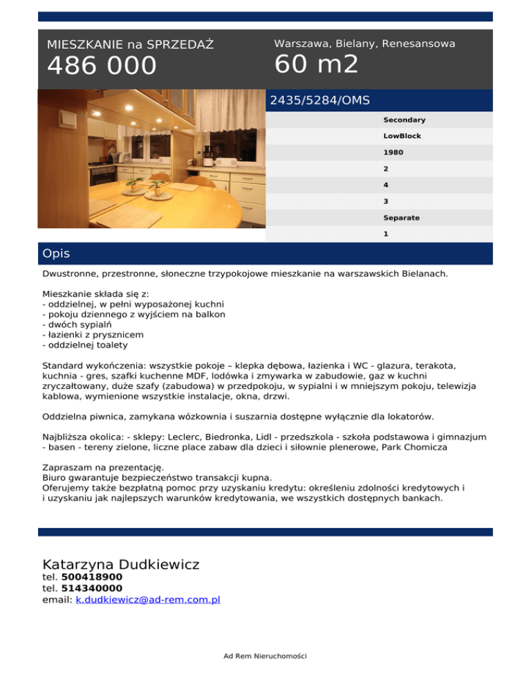 Warszawa, Bielany, Renesansowa MIESZKANIE na SPRZEDAŻ 60 m2 486 000 2435/5284/OMS Secondary LowBlock 1980 2 4 3 Separate 1 Opis Dwustronne, przestronne, słoneczne trzypokojowe mieszkanie na warszawskich Bielanach. Mieszkanie składa się z: - oddzielnej, w pełni wyposażonej kuchni - pokoju dziennego z wyjściem na balkon - dwóch sypialń - łazienki z prysznicem - oddzielnej toalety Standard wykończenia: wszystkie pokoje – klepka dębowa, łazienka i WC - glazura, terakota, kuchnia - gres, szafki kuchenne MDF, lodówka i zmywarka w zabudowie, gaz w kuchni zryczałtowany, duże szafy (zabudowa) w przedpokoju, w sypialni i w mniejszym pokoju, telewizja kablowa, wymienione wszystkie instalacje, okna, drzwi. Oddzielna piwnica, zamykana wózkownia i suszarnia dostępne wyłącznie dla lokatorów. Najbliższa okolica: - sklepy: Leclerc, Biedronka, Lidl - przedszkola - szkoła podstawowa i gimnazjum - basen - tereny zielone, liczne place zabaw dla dzieci i siłownie plenerowe, Park Chomicza Zapraszam na prezentację. Biuro gwarantuje bezpieczeństwo transakcji kupna. Oferujemy także bezpłatną pomoc przy uzyskaniu kredytu: określeniu zdolności kredytowych i i uzyskaniu jak najlepszych warunków kredytowania, we wszystkich dostępnych bankach. Katarzyna Dudkiewicz tel. 500418900 tel. 514340000 email: [email protected] Ad Rem Nieruchomości Powered by TCPDF (www.tcpdf.org)