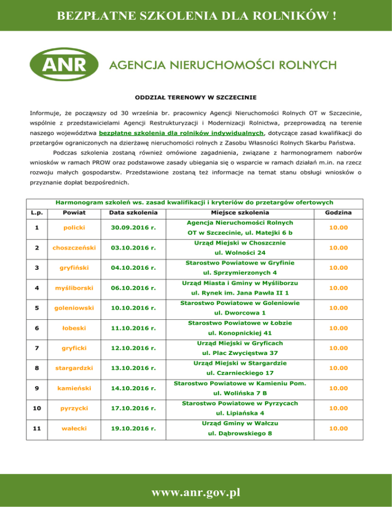 BEZPŁATNE SZKOLENIA DLA ROLNIKÓW ! ODDZIAŁ TERENOWY W SZCZECINIE Informuje, że począwszy od 30 września br. pracownicy Agencji Nieruchomości Rolnych OT w Szczecinie, wspólnie z przedstawicielami Agencji Restrukturyzacji i Modernizacji Rolnictwa, przeprowadzą na terenie naszego województwa bezpłatne szkolenia dla rolników indywidualnych, dotyczące zasad kwalifikacji do przetargów ograniczonych na dzierżawę nieruchomości rolnych z Zasobu Własności Rolnych Skarbu Państwa. Podczas szkolenia zostaną również omówione zagadnienia, związane z harmonogramem naborów wniosków w ramach PROW oraz podstawowe zasady ubiegania się o wsparcie w ramach działań m.in. na rzecz rozwoju małych gospodarstw. Przedstawione zostaną też informacje na temat stanu obsługi wniosków o przyznanie dopłat bezpośrednich. Harmonogram szkoleń ws. zasad kwalifikacji i kryteriów do przetargów ofertowych L.p. Powiat Data szkolenia 1 policki 30.09.2016 r. 2 choszczeński 03.10.2016 r. 3 gryfiński 04.10.2016 r. 4 myśliborski 06.10.2016 r. 5 goleniowski 10.10.2016 r. 6 łobeski 11.10.2016 r. 7 gryficki 12.10.2016 r. 8 stargardzki 13.10.2016 r. 9 kamieński 14.10.2016 r. 10 pyrzycki 17.10.2016 r. 11 wałecki 19.10.2016 r. Miejsce szkolenia Agencja Nieruchomości Rolnych OT w Szczecinie, ul. Matejki 6 b Urząd Miejski w Choszcznie ul. Wolności 24 Starostwo Powiatowe w Gryfinie ul. Sprzymierzonych 4 Urząd Miasta i Gminy w Myśliborzu ul. Rynek im. Jana Pawła II 1 Starostwo Powiatowe w Goleniowie ul. Dworcowa 1 Starostwo Powiatowe w Łobzie ul. Konopnickiej 41 Urząd Miejski w Gryficach ul. Plac Zwycięstwa 37 Urząd Miejski w Stargardzie ul. Czarnieckiego 17 Starostwo Powiatowe w Kamieniu Pom. ul. Wolińska 7 B Starostwo Powiatowe w Pyrzycach ul. Lipiańska 4 Urząd Gminy w Wałczu ul. Dąbrowskiego 8 www.anr.gov.pl Godzina 10.00 10.00 10.00 10.00 10.00 10.00 10.00 10.00 10.00 10.00 10.00