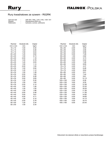 Rury Rury kwadratowe ze szwem R02RK Gatunek stali Długość Wykonanie Wymiar mm x mm 10 x 10 15 x 15 15 x 15 20 x 20 20 x 20 20 x 20 25 x 25 25 x 25 25 x 25 25 x 25 30 x 30 30 x 30 30 x 30 30 x 30 30 x 30 30 x 30 35 x 35 35 x 35 35 x 35 40 x 40 40 x 40 40 x 40 40 x 40 40 x 40 40 x 40 45 x 45 45 x 45 50 x 50 50 x 50 AISI 304 / 304L / 316 / 316L / 439 / 441 Standardowa 6000 mm lustrzane, surowe, szlifowane Grubość (S) mm 1.00 1.00 1.50 1.20 1.50 2.00 1.00 1.20 1.50 2.00 1.00 1.20 1.50 2.00 2.50 3.00 1.20 1.50 2.00 1.00 1.20 1.50 2.00 3.00 4.00 1.50 2.00 1.20 1.50 Ciężar kg/m 0.30 0.46 0.54 0.62 0.73 1.18 0.78 0.93 1.14 1.50 0.94 1.12 1.38 1.82 2.28 2.65 0.30 1.62 2.14 1.26 1.50 1.86 2.46 3.61 4.71 2.10 2.78 2.34 2.34 Wymiar mm x mm 50 x 50 50 x 50 50 x 50 50 x 50 60 x 60 60 x 60 60 x 60 60 x 60 60 x 60 70 x 70 70 x 70 70 x 70 80 x 80 80 x 80 80 x 80 80 x 80 100 x 100 100 x 100 100 x 100 100 x 100 100 x 100 120 x 120 120 x 120 120 x 120 120 x 120 150 x 150 150 x 150 150 x 150 Grubość (S) mm 2.00 3.00 4.00 5.00 1.50 2.00 3.00 4.00 5.00 2.00 3.00 4.00 2.00 3.00 4.00 5.00 2.00 3.00 4.00 5.00 6.00 2.00 3.00 4.00 5.00 3.00 4.00 5.00 Ciężar kg/m 3.09 4.56 5.98 7.48 2.82 3.73 5.52 7.26 8.95 4.37 6.48 8.64 5.01 7.44 9.81 12.13 6.28 9.35 12.36 15.32 18.24 11.26 11.26 14.92 18.65 14.13 18.74 23.43 Dokument nie stanowi oferty w rozumieniu prawa handlowego