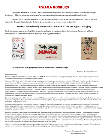 Uwaga konkurs Zapraszam wszystkich uczniów i nauczycieli Medycznej Szkoły Policealnej do wzięcia udziału w szkolnym konkursie – 25 lecie pierwszych „wolnych” wyborów parlamentarnych w powojennej historii Polski. Konkurs ma za zadanie przybliżyć uczniom i nauczycielom historię najnowszą – wiedzę o czasie przełomu i ostatnim dwudziestopięcioleciu. Zostanie przeprowadzony w formie pytań testowych. Konkurs odbędzie się w czwartek 27 marca 2014 r. na 5 godz. lekcyjnej Poniżej przedstawiam materiały i literaturę niezbędną do przygotowania się do konkursu. Zachęcam także do skorzystania ze stron internetowych poświęconych tej problematyce. 1. List Prezydenta Rzeczpospolitej Polskiej Bronisława Komorowskiego Warszawa, 31 sierpnia 2013 roku Szanowni Państwo, 4 czerwca 1989 roku pokonaliśmy komunizm. 4 Czerwca 2014 roku minie ćwierć wieku od tamtego niezwykłego dnia. Już dziś zacznijmy przygotowania do uroczystego, jubileuszowego, obywatelskiego Święta Wolności. 4 czerwca 1989 roku to tryumf solidarności i odwagi nad zwątpieniem i politycznym osamotnieniem. 4 czerwca 1989 roku to początek udanej, wielkiej zmiany ustroju. 4 czerwca 1989 roku to powrót nadziei na suwerenność państw Europy Środkowej i Wschodniej, to początek drogi ku jedności Europy. Byliśmy wtedy razem. Życie obywatelskie i patriotyczne w Polsce nie ustało – mimo cenzury, represji i żelaznej kurtyny. Ludzie Solidarności wspierali się. Wspólnie opłakiwali ofiary masakry w kopalni „Wujek”. Razem szli za trumnami księdza Jerzego Popiełuszki i Grzegorza Przemyka. Postulaty sierpniowe wyrażały potrzebę przywrócenia godności ludzkiej pracy – potrzebę, którą czuły miliony Polaków. 4 Czerwca 1989 roku razem zaufaliśmy pragnieniu wolności. Wybory 4 czerwca, choć tylko częściowo demokratyczne, były wolne naprawdę: niesfałszowane, nieokupione represjami. Ich wynik ujawnił realny układ sił w społeczeństwie. Doprowadził do głębokich zmian. Zwyciężyła solidarna decyzja milionów Polaków. Zwyciężyła wspólnota. Dlatego bądźmy razem także w przyszłym roku. Zorganizujmy święto razem! Do wspólnego świętowania polskiej wolności 4 czerwca 1989 roku zapraszam Polaków na całym świecie i wszystkich naszych przyjaciół. Zachęcam już dziś do rozpoczęcia przygotowań, by wydarzenie to miało charakter wielkiej, wspólnej, obywatelskiej uroczystości. Wolności nie ma granic. Nasze Święto Wolności jest też świętem całego wolnego świata. Do zorganizowania wspólnych przedsięwzięć zapraszam wszystkich. Zapraszam osoby prywatne, instytucje, urzędy państwowe i organizacje pozarządowe, środowiska przedsiębiorców, instytucje publiczne i samorządy. Zapraszam mieszkańców wsi, małych miast i wielkich metropolii – również za oceanem – w których żyją Polacy. Chciałbym, by świat miał szansę poznać nas tego dnia jako naród ludzi wolnych, ceniących wolność własną i wspierających innych będących na niełatwej drodze ku wolności. Zachęcam ludzi kultury i sportowców, ludzi mediów i nauki, przedsiębiorców i urzędników. Mam nadzieję na wspólne inicjatywy z przedstawicielami Kościoła. Chciałbym, by rola kapłanów we wspieraniu opozycji, w podtrzymywaniu nadziei i duchowym umacnianiu Polaków walczących o wolne państwo została uwzględniona i doceniona. Zapraszam zarówno tych, którzy pamiętają 4 czerwca 1989 roku, jak i tych, którzy się właśnie wtedy lub później urodzili. Zapraszam tych, którzy przyłączyli się do Komitetów Obywatelskich „Solidarności”, by podzielili się swoim doświadczeniem. Zapraszam artystów wielkich scen narodowych, estrady i artystów offowych – wszystkich, którzy tworzą w wolności i dzięki wolności. Proszę o zaangażowanie ludzi nauki i kultury. Wolność wymaga, by mówić o niej na nowo, by wyjaśniać jej znaczenie, by rzetelnie wskazywać, co jej dziś zagraża. Wspólnym wysiłkiem zbudujmy jak najambitniejszy program obchodów. Wspólnie wypełnijmy ten projekt jak najatrakcyjniejszymi pomysłami. Potwierdźmy raz jeszcze , że nie ma wolności bez solidarności. Że wolność i dzisiaj wymaga solidarności pomiędzy nami. Prezydent Rzeczypospolitej Polskiej Bronisław Komorowski 2. Wybory 4 czerwca 1989 r. Wybory parlamentarne w Polsce w 1989 r. - odbyły się 4 i 18 czerwca. Były to pierwsze częściowo wolne wybory w powojennej historii Polski. W ich wyniku Polska stała się pierwszym państwem bloku wschodniego, w którym wyłonieni w wyborach przedstawiciele społeczeństwa uzyskali realny wpływ na sprawowanie władzy. W wyniku niezadowolenia społeczeństwa w 1988 r. w całym kraju doszło do serii strajków. Władze komunistyczne pod ich wpływem zaczęły rozmawiać z opozycją. Do ostatecznego porozumienia władz z „Solidarnością” doszło podczas obrad tzw. „Okrągłego Stołu” w dniach od 6 lutego do 5 kwietnia 1989 r. W ich wyniku podjęto szereg postanowień w poszczególnych dziedzinach, w tym o zmianie ordynacji, kompetencjach prezydenta oraz utworzeniu Senatu. Ustalono, że 65% mandatów w Sejmie przypadnie przedstawicielom Polskiej Zjednoczonej Partii Robotniczej, Zjednoczonego Stronnictwa Ludowego i Stronnictwa Demokratycznego oraz stronnictw prorządowych, natomiast o pozostałe 35% ubiegać się będą mogli kandydaci bezpartyjni. Całkowicie wolne miały być natomiast wybory do Senatu. W wyniku głosowania w 1 turze doszło do zdecydowanego zwycięstwa kandydatów „Solidarności”, którzy zdobyli 160 spośród 161 mandatów w Sejmie oraz 92 spośród 100 w Senacie. Koalicja rządowa do Sejmu (PZPR, ZSL. SD) wprowadziła zaledwie 3 reprezentantów. Frekwencja wyborcza wyniosła 62%. W drugiej turze opozycja uzyskała 1 brakujący mandat w Sejmie oraz 7 w Senacie. Frekwencja wyniosła jedynie 25%. Ogółem kandydaci opozycji uzyskali wszystkie możliwe do zdobycia mandaty w sejmie – 161 z 460 (35%) i 99 