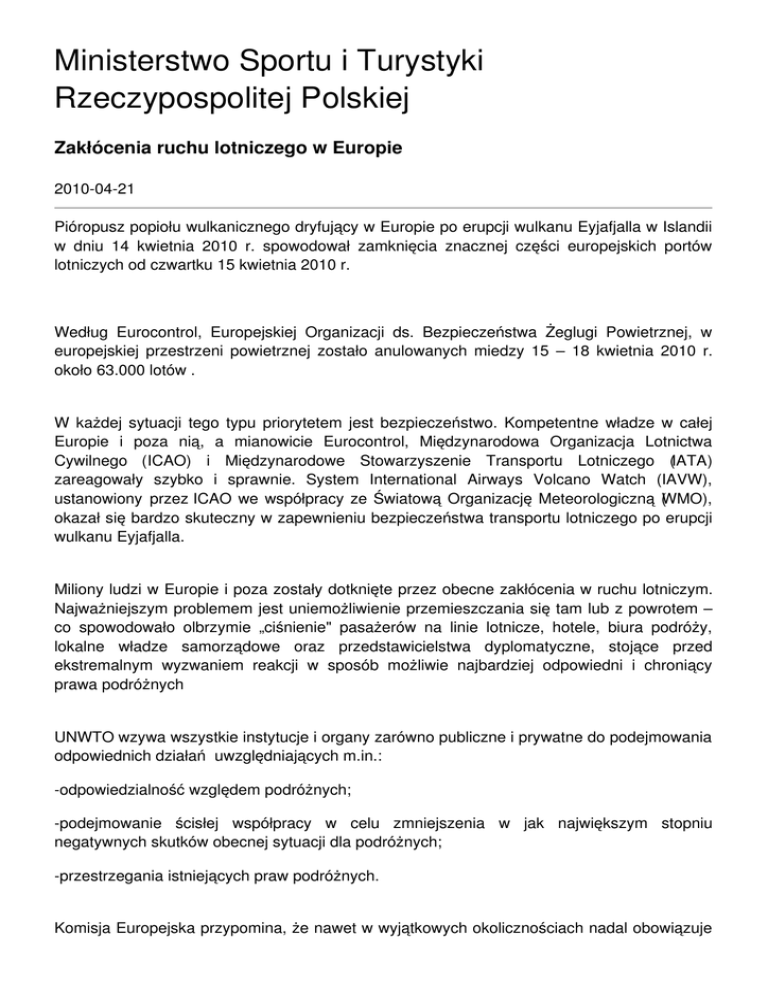 Ministerstwo Sportu i Turystyki Rzeczypospolitej Polskiej Zakłócenia ruchu lotniczego w Europie 2010-04-21 Pióropusz popiołu wulkanicznego dryfujący w Europie po erupcji wulkanu Eyjafjalla w Islandii w dniu 14 kwietnia 2010 r. spowodował zamknięcia znacznej części europejskich portów lotniczych od czwartku 15 kwietnia 2010 r. Według Eurocontrol, Europejskiej Organizacji ds. Bezpieczeństwa Żeglugi Powietrznej, w europejskiej przestrzeni powietrznej zostało anulowanych miedzy 15 – 18 kwietnia 2010 r. około 63.000 lotów . W każdej sytuacji tego typu priorytetem jest bezpieczeństwo. Kompetentne władze w całej Europie i poza nią, a mianowicie Eurocontrol, Międzynarodowa Organizacja Lotnictwa Cywilnego (ICAO) i Międzynarodowe Stowarzyszenie Transportu Lotniczego (IATA) zareagowały szybko i sprawnie. System International Airways Volcano Watch (IAVW), ustanowiony przez ICAO we współpracy ze Światową Organizację Meteorologiczną (WMO), okazał się bardzo skuteczny w zapewnieniu bezpieczeństwa transportu lotniczego po erupcji wulkanu Eyjafjalla. Miliony ludzi w Europie i poza zostały dotknięte przez obecne zakłócenia w ruchu lotniczym. Najważniejszym problemem jest uniemożliwienie przemieszczania się tam lub z powrotem – co spowodowało olbrzymie „ciśnienie" pasażerów na linie lotnicze, hotele, biura podróży, lokalne władze samorządowe oraz przedstawicielstwa dyplomatyczne, stojące przed ekstremalnym wyzwaniem reakcji w sposób możliwie najbardziej odpowiedni i chroniący prawa podróżnych UNWTO wzywa wszystkie instytucje i organy zarówno publiczne i prywatne do podejmowania odpowiednich działań uwzględniających m.in.: -odpowiedzialność względem podróżnych; -podejmowanie ścisłej współpracy w celu zmniejszenia w jak największym stopniu negatywnych skutków obecnej sytuacji dla podróżnych; -przestrzegania istniejących praw podróżnych. Komisja Europejska przypomina, że nawet w wyjątkowych okolicznościach nadal obowiązuje przestrzeganie prawa pasażerów w UE, a mianowicie: -prawo do uzyskiwania informacji od linii lotniczych (np. w zakresie praw, w sprawie sytuacji w jej rozwoju, odwołania i długość opóźnień); -prawo do opieki (wyżywienie i zakwaterowanie w razie potrzeby); -prawo wyboru między zwrotem opłat lub lotu do miejsca przeznaczenia. Z punktu widzenia znaczenia transportu lotniczego dla turystyki europejskiej, trzeba zdawać sobie sprawę z faktu, że obecne zakłócenia ruchu lotniczego będą miały istotny wpływ na gospodarkę. Corocznie w Europie odbywa się 240 mln międzynarodowych przyjazdów turystycznych z powietrza (700 tys. dziennie), co generuje roczny dochód w wysokości 200 mld USD/148 mld EURO/576 mld PLN. Skutki strat zależeć będą od czasu trwania obecnej sytuacji i ilości odwołanych lotów, ale z pewnością będą stanowić dodatkowe obciążenie dla sektora turystyki, a w szczególności dla przemysłu lotniczego, który zmaga się jeszcze ze skutkami światowego kryzysu ekonomiczno-finansowego. UNWTO pozostaje w ścisłym kontakcie z właściwymi organami i instytucjami, kluczowymi podmiotami sektora turystycznego, jak również z krajami członkowskimi w celu efektywnego monitorowania sytuacji. Sytuację monitoruje także na bieżąco Tourism Emergency Response Network (TERN), obejmujący 27 wiodących stowarzyszeń turystycznych podejmujących działania w celu zarządzania wymianą informacji i spójnego jej podawania do publicznej wiadomości. UNWTO oczekuje, że Komitet ds. Etyki podejmie działania w celu monitorowania bieżącej sytuacji w kontekście Światowego Kodeks Etyki oraz rozważy potrzebę spójnych zasad wspierania konsumentów. Linki: UNWTO Global Code of Ethics for Tourism Eurocontrol European Commission Bliższe informacje: T: +34 91-567-8178 / +34 91-567-8100 / F: +34 91-567-8218 [email protected] – www.UNWTO.org