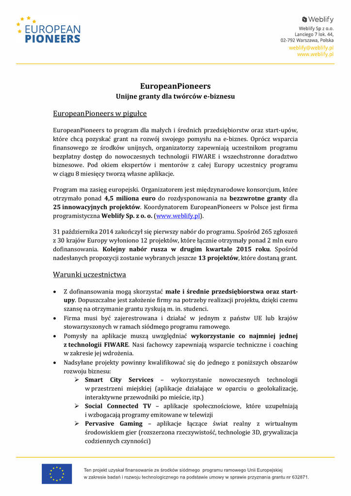 EuropeanPioneers Unijne granty dla twórców e-biznesu EuropeanPioneers w pigułce EuropeanPioneers to program dla małych i średnich przedsiębiorstw oraz start-upów, które chcą pozyskać grant na rozwój swojego pomysłu na e-biznes. Oprócz wsparcia finansowego ze środków unijnych, organizatorzy zapewniają uczestnikom programu bezpłatny dostęp do nowoczesnych technologii FIWARE i wszechstronne doradztwo biznesowe. Pod okiem ekspertów i mentorów z całej Europy uczestnicy programu w ciągu 8 miesięcy tworzą własne aplikacje. Program ma zasięg europejski. Organizatorem jest międzynarodowe konsorcjum, które otrzymało ponad 4,5 miliona euro do rozdysponowania na bezzwrotne granty dla 25 innowacyjnych projektów. Koordynatorem EuropeanPioneers w Polsce jest firma programistyczna Weblify Sp. z o. o. (www.weblify.pl). 31 października 2014 zakończył się pierwszy nabór do programu. Spośród 265 zgłoszeń z 30 krajów Europy wyłoniono 12 projektów, które łącznie otrzymały ponad 2 mln euro dofinansowania. Kolejny nabór rusza w drugim kwartale 2015 roku. Spośród nadesłanych propozycji zostanie wybranych jeszcze 13 projektów, które dostaną grant. Warunki uczestnictwa Z dofinansowania mogą skorzystać małe i średnie przedsiębiorstwa oraz startupy. Dopuszczalne jest założenie firmy na potrzeby realizacji projektu, dzięki czemu szansę na otrzymanie grantu zyskują m. in. studenci. Firma musi być zajerestrowana i działać w jednym z państw UE lub krajów stowarzyszonych w ramach siódmego programu ramowego. Pomysły na aplikacje muszą uwzględniać wykorzystanie co najmniej jednej z technologii FIWARE. Nasi fachowcy zapewniają wsparcie techniczne i coaching w zakresie jej wdrożenia. Nadsyłane projekty powinny kwalifikować się do jednego z poniższych obszarów rozwoju biznesu: Smart City Services – wykorzystanie nowoczesnych technologii w przestrzeni miejskiej (aplikacje działające w oparciu o geolokalizację, interaktywne przewodniki po mieście, itp.) Social Connected TV – aplikacje społecznościowe, które uzupełniają i wzbogacają programy emitowane w telewizji Pervasive Gaming – aplikacje łączące świat realny z wirtualnym środowiskiem gier (rozszerzona rzeczywistość, technologie 3D, grywalizacja codziennych czynności) E-learning – aplikacje edukacyjne, wykorzystujące m.in. nauczanie mieszane, naukę zdalną poprzez masowe otwarte kursy online, itp. Swoją kandydaturę do programu należy zgłosić w czasie otwartego naboru, który rozpoczyna się w drugim kwartale 2015 roku. W tym czasie należy wypełnić formularz zgłoszeniowy na stronie EuropeanPioneers. Zgłoszenia składane są wyłącznie w języku angielskim! Zgłoszenia do programu Etap 1: Wypełnienie formularza online W pierwszej kolejności należy wypełnić formularz zgłoszeniowy na stronie EuropeanPioneers. Nie trzeba przygotowywać skomplikowanego wniosku. Potencjalni uczestnicy programu muszą po prostu odpowiedzieć na szereg krótkich pytań, dotyczacych ich pomysłu na e-biznes. Nadesłane projekty oceniane są m. in. pod kątem innowacyjności, kreatywności, skalowalności, gotowości rynkowej, zdolności wykorzystania technologii FIWARE i zaawansowania technologicznego proponowanych aplikacji oraz umiejętności zarządczych jej twórców. Zgłoszenia online można składać w trakcie otwartego naboru do programu, który planowany jest na drugi kwartał 2015 roku. Etap 2: Prezentacja propozycji na e-biznes Twórcy najlepszych projektów zostaną zaproszeni do Berlina. Będą mieli 15 minut, aby zaprezentować swoje pomysły przed niezależnym jury, w skład którego wchodzą specjaliści od budowy start-upów, przedstawiciele środowiska Venture Capital oraz mediów, a także ekspert w dziedzinie FIWARE. Projekty zostaną oceniane zarówno pod kątem technologicznym, jak i biznesowym. Etap 3: Wyłonienie zwycięzców W drugim naborze programu EuropeanPioneers dofinansowanie otrzyma 13 projektów. Laureaci przyjadą do Berlina, gdzie podpiszą umowę o przyznanie grantu i wezmą udział w warsztatach prowadzonych przez mentorów. Kolejne 8 miesięcy spędzą na tworzeniu aplikacji. Eksperci z konsorcjum będą na bieżąco monitorowali postępy prac uczestników programu, odpowiadali na ich pytania i dzielili się z nimi swoją wiedzą oraz doświadczeniem. Konsorcjum przekaże autorom projektów bezzwrotne granty w wysokości od 50 000 do 250 000 euro. Korzyści dla uczestników Dofinansowanie ze środków UE W zależności od potrzeb, uczestnicy programu otrzymają granty w wysokości od 50 000 do 250 000 euro, dzięki którym sfinansują realizację swoich projektów. Dofinansowanie jest bezzwrotne. Coaching i mentoring Organizowane w ramach programy warsztaty, seminaria online, a także wsparcie mentorów z całej Europy pozwolą uczestnikom udoskonalić swoje umiejętności biznesowe. Eksperci będą na bieżąco oceniać postępy ich prac, udzielając im wskazówek dotyczących kwestii technicznych, finansowych czy marketingowych. Uczestnicy będą mogli ponadto przetestować stworzone aplikacje na co najmniej 1000 użytkownikach. Kontakty biznesowe Realizując projekt w ramach programu EuropeanPioneers uczestnicy wejdą do grona europejskich e-przedsiębiorców. Otrzymają szansę nawiązania kontaktu z inwestorami i osobami ze środowiska funduszy Venture Capital. Dzięki temu będą mogli pozyskać środki na dalszy rozwój swojego e-biznesu. Dostęp do najnowocześniejszych technologii Uczestnicy programu EuropeanPioneers zyskają bezpłatny dostęp do technologii FIWARE, skorzystają też z coachingu i wsparcia technicznego w zakresie ich wdrożenia. W ich ręce trafią gotowe moduły, które będą mogli wykorzystać, tworząc własne aplikacje. Przyspieszy to w znaczny sposób realizację projektu i zmniejszy jego koszty. Harmonogram Harmonogram programu EuropeanPioneers http://weblify.pl/europeanpioneers/. dostępny jest na stronie Ko