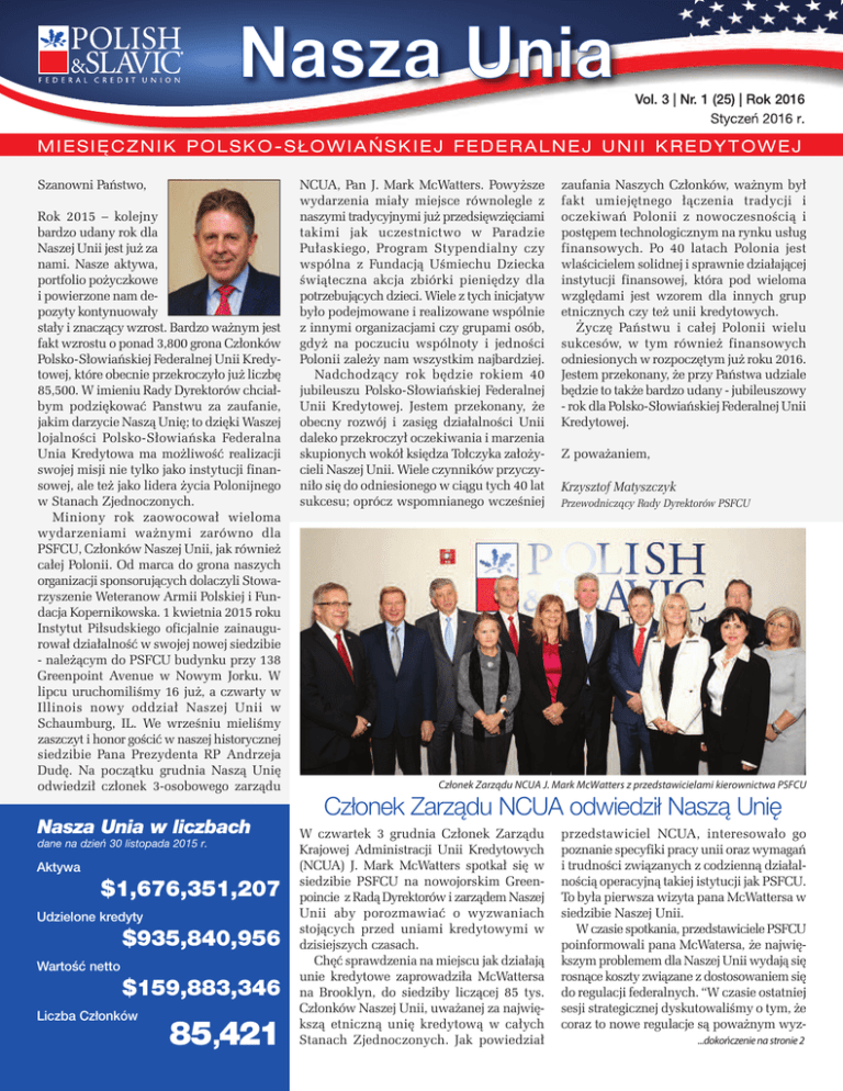 Nasza Unia Vol. 3 | Nr. 1 (25) | Rok 2016 Styczeń 2016 r. MIESIĘCZNIK POLSKO-SŁOWIAŃSKIEJ FEDERALNEJ UNII KREDYTOWEJ Szanowni Państwo, Rok 2015 – kolejny bardzo udany rok dla Naszej Unii jest już za nami. Nasze aktywa, portfolio pożyczkowe i powierzone nam depozyty kontynuowały stały i znaczący wzrost. Bardzo ważnym jest fakt wzrostu o ponad 3,800 grona Członków Polsko-Słowiańskiej Federalnej Unii Kredytowej, które obecnie przekroczyło już liczbę 85,500. W imieniu Rady Dyrektorów chciałbym podziękować Panstwu za zaufanie, jakim darzycie Naszą Unię; to dzięki Waszej lojalności Polsko-Słowiańska Federalna Unia Kredytowa ma możliwość realizacji swojej misji nie tylko jako instytucji finansowej, ale też jako lidera życia Polonijnego w Stanach Zjednoczonych. Miniony rok zaowocował wieloma wydarzeniami ważnymi zarówno dla PSFCU, Członków Naszej Unii, jak również całej Polonii. Od marca do grona naszych organizacji sponsorujących dolaczyli Stowarzyszenie Weteranow Armii Polskiej i Fundacja Kopernikowska. 1 kwietnia 2015 roku Instytut Piłsudskiego oficjalnie zainaugurował działalność w swojej nowej siedzibie - należącym do PSFCU budynku przy 138 Greenpoint Avenue w Nowym Jorku. W lipcu uruchomiliśmy 16 już, a czwarty w Illinois nowy oddział Naszej Unii w Schaumburg, IL. We wrześniu mieliśmy zaszczyt i honor gościć w naszej historycznej siedzibie Pana Prezydenta RP Andrzeja Dudę. Na początku grudnia Naszą Unię odwiedził członek 3-osobowego zarządu NCUA, Pan J. Mark McWatters. Powyższe wydarzenia miały miejsce równolegle z naszymi tradycyjnymi już przedsięwzięciami takimi jak uczestnic two w Paradzie Pułaskiego, Program Stypen dialny czy wspólna z Fundacją Uśmiechu Dziecka świąteczna akcja zbiórki pieniędzy dla potrzebujących dzieci. Wiele z tych inicjatyw było podejmowane i realizowane wspólnie z innymi organizacjami czy grupami osób, gdyż na poczuciu wspólnoty i jedności Polonii zależy nam wszystkim najbardziej. Nadchodzący rok będzie rokiem 40 jubileuszu Polsko-Słowiańskiej Federalnej Unii Kredytowej. Jestem przekonany, że obecny rozwój i zasięg działalności Unii daleko przekroczył oczekiwania i marzenia skupionych wokół księdza Tołczyka założycieli Naszej Unii. Wiele czynników przyczyniło się do odniesionego w ciągu tych 40 lat sukcesu; oprócz wspomnianego wcześniej zaufania Naszych Członków, ważnym był fakt umiejętnego łączenia tradycji i oczekiwań Polonii z nowoczesnością i postępem technologicznym na rynku usług finansowych. Po 40 latach Polonia jest wlaścicielem solidnej i sprawnie działającej instytucji finansowej, która pod wieloma względami jest wzorem dla innych grup etnicznych czy też unii kredytowych. Życzę Państwu i całej Polonii wielu sukcesów, w tym również finansowych odniesionych w rozpoczętym już roku 2016. Jestem przekonany, że przy Państwa udziale będzie to także bardzo udany - jubileuszowy - rok dla Polsko-Słowiańskiej Federalnej Unii Kredytowej. Z poważaniem, Krzysztof Matyszczyk Przewodniczący Rady Dyrektorów PSFCU Członek Zarządu NCUA J. Mark McWatters z przedstawicielami kierownictwa PSFCU Członek Zarządu NCUA odwiedził Naszą Unię Nasza Unia w liczbach dane na dzień 30 listopada 2015 r. Aktywa $1,676,351,207 Udzielone kredyty $935,840,956 Wartość netto $159,883,346 Liczba Członków 85,421 W czwartek 3 grudnia Członek Zarządu Krajowej Administracji Unii Kredytowych (NCUA) J. Mark McWatters spotkał się w siedzibie PSFCU na nowojorskim Greenpoincie z Radą Dyrektorów i zarządem Naszej Unii aby porozmawiać o wyzwaniach stojących przed uniami kredytowymi w dzisiejszych czasach. Chęć sprawdzenia na miejscu jak działają unie kredytowe zaprowadziła McWattersa na Brooklyn, do siedziby liczącej 85 tys. Członków Naszej Unii, uważanej za największą etniczną unię kredytową w całych Stanach Zjednoczonych. Jak powiedział przedstawiciel NCUA, interesowało go poznanie specyfiki pracy unii oraz wymagań i trudności związanych z codzienną działalnością operacyjną takiej istytucji jak PSFCU. To była pierwsza wizyta pana McWattersa w siedzibie Naszej Unii. W czasie spotkania, przedstawiciele PSFCU poinformowali pana McWatersa, że największym problemem dla Naszej Unii wydają się rosnące koszty związane z dostosowaniem się do regulacji federalnych. “W czasie ostatniej sesji strategicznej dyskutowaliśmy o tym, że coraz to nowe regulacje są poważnym wyz...dokończenie na stronie 2 Nasza Unia | Styczeń 2016 r. | 1.855.PSFCU.4U (1.855.773.2848) | www.Na szaU nia.com Członek Zarządu NCUA... ... dokończenie ze strony 1 waniem dla Naszej Unii, znacząco zwiększając koszty operacyjne” powiedział dyrektor wykonwaczy PSFCU Bogdan Chmielewski. “Apelujemy do NCUA aby w kwestii nowych regulacji kierowała się rozsądkiem. Tworzenie coraz to nowych przeszkód oraz zwiększanie kosztów znacząco wpływa na naszą wspólną misję służenia naszym Członkom oraz społecznościom, w których działamy.” “Takie spotkania pomagają mi w podejmowaniu właściwych decyzji dlatego wyjeżdżam z Waszyngtonu, aby spotykać się z przedstawicielami unii kredytowych” powiedział McWatters. “Słucham na miejscu o codziennych doświadczeniach, otrzymuję informacje od pracowników NCUA a następnie - używając mojego 30-letniego doświadczenia jako prawnik, mogę wyrobić sobie właściwą opinię, aby działać na rzecz zwiększewnia efektywności i skuteczności działania unii kredytowych”. Przy okazji dyskusji o kwestiach regulacyjnych, przedstawiciele PSFCU zapoznali McWattersa z historią i osiągnięciami Polsko-Słowiańskiej Federalnej Unii Kredytowej, która w przyszłym roku będzie świętować 40-lecie istnienia. Powstała na Brooklynie w 1976 r., Nasza Unia rozrosła się w instytucję z 16 oddziałami w trzech stanach (Nowy Jork, New Jersey i Illinois), posiada 85 tysięcy Członkó