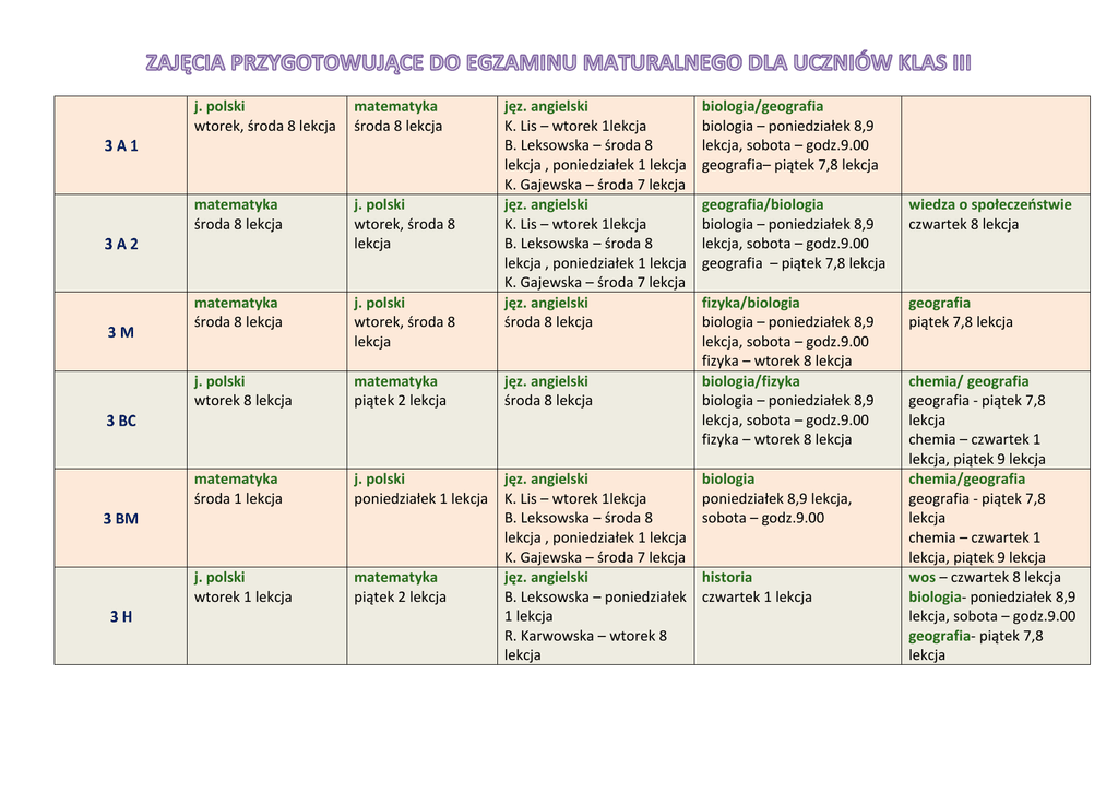 j. polski wtorek, środa 8 lekcja matematyka środa 8 lekcja jęz. angielski K. Lis – wtorek 1lekcja B. Leksowska – środa 8 lekcja , poniedziałek 1 lekcja K. Gajewska – środa 7 lekcja jęz. angielski K. Lis – wtorek 1lekcja B. Leksowska – środa 8 lekcja , poniedziałek 1 lekcja K. Gajewska – środa 7 lekcja jęz. angielski środa 8 lekcja matematyka środa 8 lekcja j. polski wtorek, środa 8 lekcja matematyka środa 8 lekcja j. polski wtorek, środa 8 lekcja j. polski wtorek 8 lekcja matematyka piątek 2 lekcja jęz. angielski środa 8 lekcja matematyka środa 1 lekcja j. polski poniedziałek 1 lekcja j. polski wtorek 1 lekcja matematyka piątek 2 lekcja jęz. angielski K. Lis – wtorek 1lekcja B. Leksowska – środa 8 lekcja , poniedziałek 1 lekcja K. Gajewska – środa 7 lekcja jęz. angielski B. Leksowska – poniedziałek 1 lekcja R. Karwowska – wtorek 8 lekcja biologia/geografia biologia – poniedziałek 8,9 lekcja, sobota – godz.9.00 geografia– piątek 7,8 lekcja geografia/biologia biologia – poniedziałek 8,9 lekcja, sobota – godz.9.00 geografia – piątek 7,8 lekcja wiedza o społeczeństwie czwartek 8 lekcja fizyka/biologia biologia – poniedziałek 8,9 lekcja, sobota – godz.9.00 fizyka – wtorek 8 lekcja biologia/fizyka biologia – poniedziałek 8,9 lekcja, sobota – godz.9.00 fizyka – wtorek 8 lekcja geografia piątek 7,8 lekcja biologia poniedziałek 8,9 lekcja, sobota – godz.9.00 historia czwartek 1 lekcja chemia/ geografia geografia - piątek 7,8 lekcja chemia – czwartek 1 lekcja, piątek 9 lekcja chemia/geografia geografia - piątek 7,8 lekcja chemia – czwartek 1 lekcja, piątek 9 lekcja wos – czwartek 8 lekcja biologia- poniedziałek 8,9 lekcja, sobota – godz.9.00 geografia- piątek 7,8 lekcja