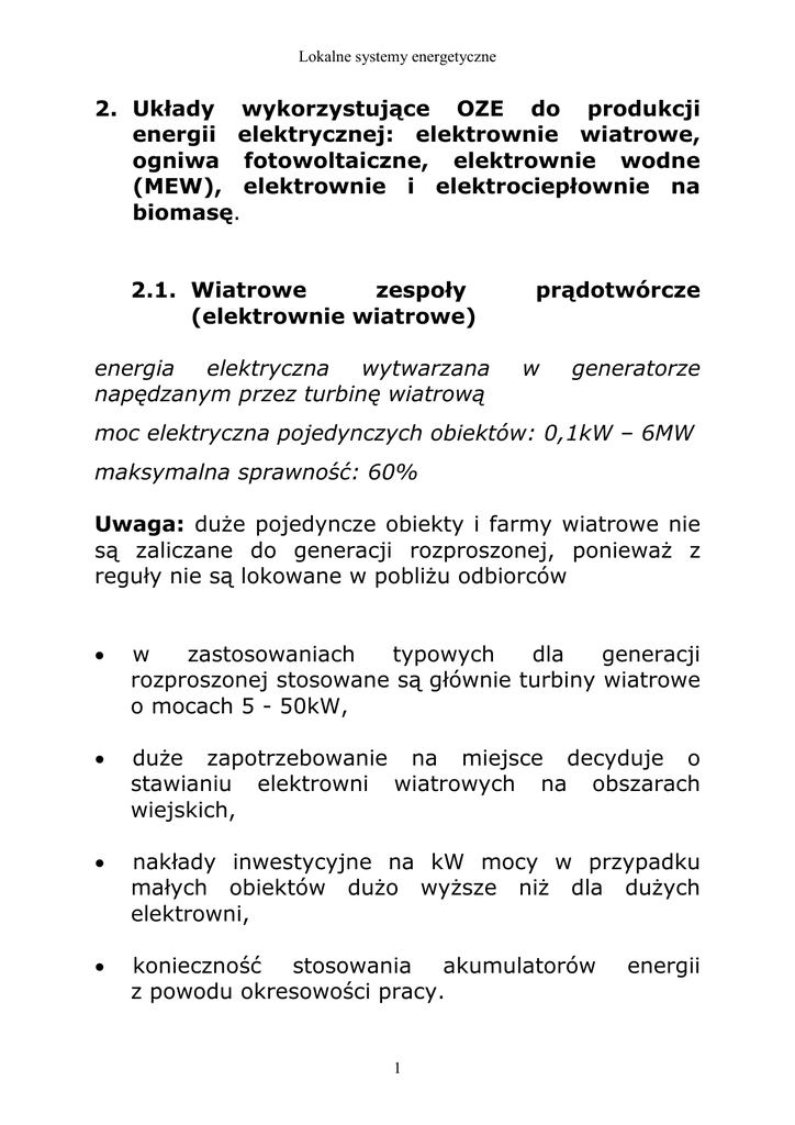 Lokalne systemy energetyczne 2. Układy wykorzystujące OZE do produkcji energii elektrycznej: elektrownie wiatrowe, ogniwa fotowoltaiczne, elektrownie wodne (MEW), elektrownie i elektrociepłownie na biomasę. 2.1. Wiatrowe zespoły (elektrownie wiatrowe) energia elektryczna wytwarzana napędzanym przez turbinę wiatrową prądotwórcze w generatorze moc elektryczna pojedynczych obiektów: 0,1kW – 6MW maksymalna sprawność: 60% Uwaga: duŜe pojedyncze obiekty i farmy wiatrowe nie są zaliczane do generacji rozproszonej, poniewaŜ z reguły nie są lokowane w pobliŜu odbiorców • w zastosowaniach typowych dla generacji rozproszonej stosowane są głównie turbiny wiatrowe o mocach 5 - 50kW, • duŜe zapotrzebowanie na miejsce decyduje o stawianiu elektrowni wiatrowych na obszarach wiejskich, • nakłady inwestycyjne na kW mocy w przypadku małych obiektów duŜo wyŜsze niŜ dla duŜych elektrowni, • konieczność stosowania akumulatorów z powodu okresowości pracy. 1 energii Lokalne systemy energetyczne Rys.IV.7 Uproszczony schemat budowy siłowni wiatrowej [11] Rys.IV.7 Schemat układu pracy systemu autonomicznego z prądnicą prądu stałego i obwodem odbiorczym prądu stałego oraz przemiennego [11] Rys.IV.7 Schemat układu współpracującego elektroenergetyczną [11] 2 z siecią Lokalne systemy energetyczne 2.2. Ogniwa fotowoltaiczne bezpośrednie przetwarzanie energii słonecznego na energię elektryczną promieniowania mała moc pojedynczych ogniw - moŜliwość rozbudowy sprawność: 7 – 17% Zalety: • cicha praca (brak części mechanicznych), • brak oddziaływania na środowisko, • moŜliwość zabudowy w konstrukcjach budowlanych. Wady: • duŜe koszty, • sprawność zaleŜna od warunków okresowość pracy (przerwa nocna), atmosferycznych, • konieczność stosowania akumulatorów energii. Rys.IV.8. Schemat budowy ogniwa fotowoltaicznego [12] 3 Lokalne systemy energetyczne Układ fotowoltaiczny: ogniwo + urządzenia dodatkowe dostosowujące wytwarzany w ogniwach prąd stały do potrzeb zasilanych urządzeń (akumulatory, falowniki, kontrolery napięcia) 2.3. Wykorzystanie energii celów energetycznych geotermalnej do Sposoby wykorzystania energii geotermalnej do bezpośredniego ogrzewania do ogrzewania pośredniego jako dolne źródło pompy ciepła do produkcji energii elektrycznej Odbiór energii cieplnej z wód geotermalnych odbywa się poprzez eksploatację gorącej wody ze studni głębinowej, schładzanie jej na wymiennikach ciepła i ponowne zatłoczenie, przez drugi otwór studzienny, do tej samej warstwy, z której została pobrana. Rys.IV.9. Schemat wykorzystania ogrzewania [13] 4 energii geotermalnej do Lokalne systemy energetyczne Zalety ciepłowni geotermalnych: • źródło ciepła o stałych parametrach, niezaleŜnych od warunków zewnętrznych, • mały wpływ na środowisko, • na wzrost cen energii otrzymywanej z wód geotermalnych nie ma wpływu wzrost cen konwencjonalnych nośników energii lub wpływ ten jest minimalny. Wady energetyki geotermalnej: • konieczność stosowania wymienników w przypadku wysokiej mineralizacji wód, • wysokie koszty wykonania wydobywcze i zatłaczające). odwiertów (otwory 2.4. Inne obiekty i urządzenia: małe elektrownie wodne – MEW; energia elektryczna wytwarzana w generatorze napędzanym przez turbinę wodną, moc elektryczna – do 5 MW elektrownie, ciepłownie i elektrociepłownie na biomasę; kolektory słoneczne). 5 Lokalne systemy energetyczne 3. Rozproszone źródła energii i ich współpraca w lokalnych systemach energetycznych Rys.IV.10. Schemat lokalnego systemu energetycznego [1] Elementy składowe energetycznego: zdecentralizowanego systemu • małe jednostki wytwórcze (energia elektryczna i cieplna z gazu ziemnego i OZE): mogą pracować indywidualnie lub w sieci, do której mogą być takŜe podłączone inne źródła wytwórcze – zasilane tradycyjnymi paliwami, • akumulatory energii, • odbiorcy przemysłowi i indywidualni, • centrum zarządzania pracą sytemu 6 Lokalne systemy energetyczne 4.Podsumowanie Podstawowe cechy odróŜniające generację rozproszoną od tradycyjnych metod wytwarzania energii elektrycznej: lokalizacja: - w miejscu lub w pobliŜu miejsca uŜytkowania energii; często właścicielem i operatorem jednostki wytwórczej jest bezpośredni uŜytkownik energii, - tego typu urzadzenia wykorzystywane są często do „odciąŜania” systemu elektroenergetycznego w szczytach obciąŜenia; moc: - najczęściej od kilku do kilkuset kW, - jednostki wytwórcze o takich mocach nadają się zwykle do zaspokajania potrzeb energetycznych domów jednorodzinnych i biur, a takŜe małych grup odbiorców; podłączenie do sieci elektroenergetycznej: - większość jednostek tego typu jest podłączana do sieci na poziomie dystrybucji. 7