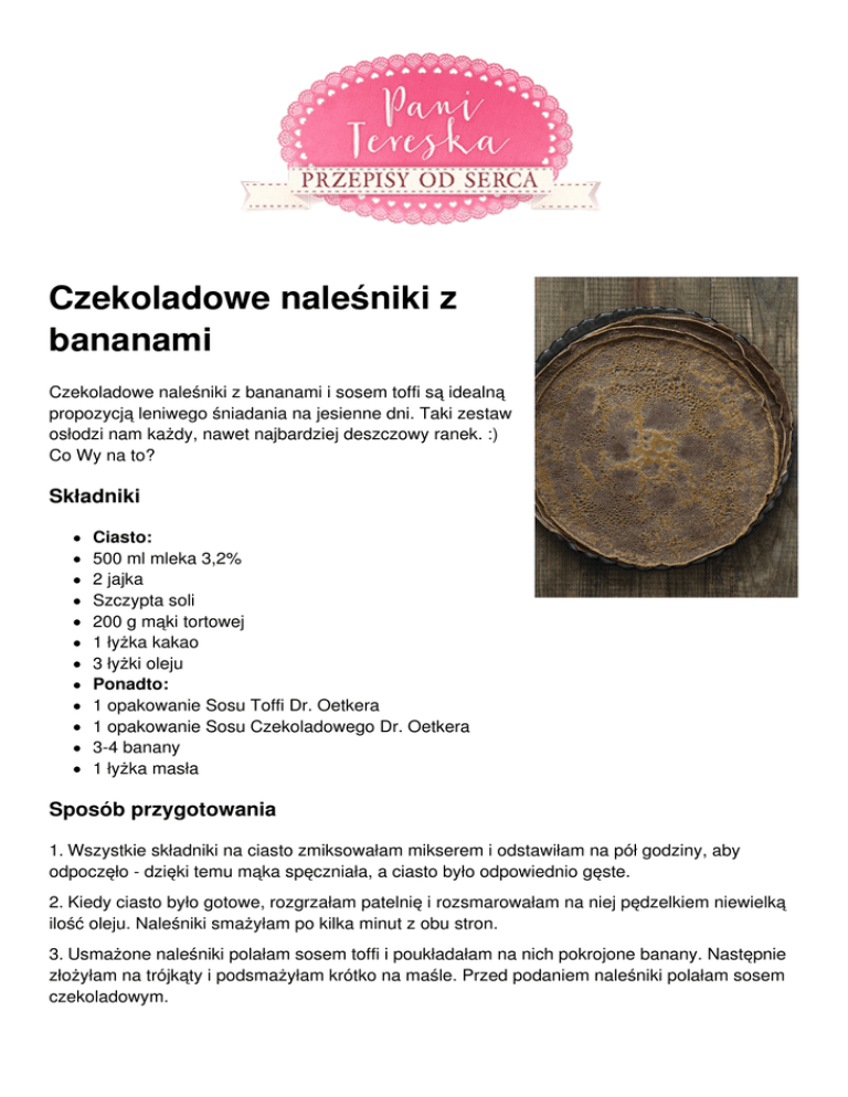 Czekoladowe naleśniki z bananami Czekoladowe naleśniki z bananami i sosem toffi są idealną propozycją leniwego śniadania na jesienne dni. Taki zestaw osłodzi nam każdy, nawet najbardziej deszczowy ranek. :) Co Wy na to? Składniki Ciasto: 500 ml mleka 3,2% 2 jajka Szczypta soli 200 g mąki tortowej 1 łyżka kakao 3 łyżki oleju Ponadto: 1 opakowanie Sosu Toffi Dr. Oetkera 1 opakowanie Sosu Czekoladowego Dr. Oetkera 3-4 banany 1 łyżka masła Sposób przygotowania 1. Wszystkie składniki na ciasto zmiksowałam mikserem i odstawiłam na pół godziny, aby odpoczęło - dzięki temu mąka spęczniała, a ciasto było odpowiednio gęste. 2. Kiedy ciasto było gotowe, rozgrzałam patelnię i rozsmarowałam na niej pędzelkiem niewielką ilość oleju. Naleśniki smażyłam po kilka minut z obu stron. 3. Usmażone naleśniki polałam sosem toffi i poukładałam na nich pokrojone banany. Następnie złożyłam na trójkąty i podsmażyłam krótko na maśle. Przed podaniem naleśniki polałam sosem czekoladowym.