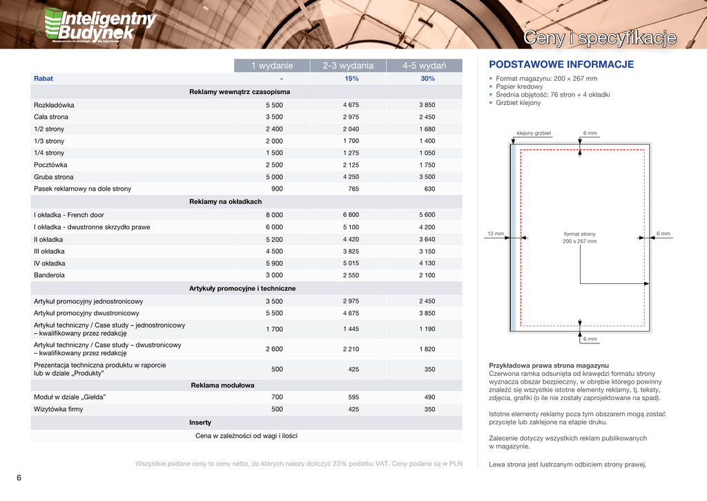 Ceny i specyfikacje 1 wydanie Rabat - 2-3 wydania 4-5 wydań 15% 30% Reklamy wewnątrz czasopisma Rozkładówka 5 500 4 675 3 850 Cała strona 3 500 2 975 2 450 1/2 strony 2 400 2 040 1 680 1/3 strony 2 000 1 700 1 400 1/4 strony 1 500 1 275 1 050 Pocztówka 2 500 2 125 1 750 Gruba strona 5 000 4 250 3 500 900 765 630 I okładka - French door 8 000 6 800 5 600 I okładka - dwustronne skrzydło prawe 6 000 5 100 4 200 II okładka 5 200 4 420 3 640 III okładka 4 500 3 825 3 150 IV okładka 5 900 5 015 4 130 Banderola 3 000 2 550 2 100 Pasek reklamowy na dole strony PODSTAWOWE INFORMACJE • • • • F ormat magazynu: 200 × 267 mm P apier kredowy Średnia objętość: 76 stron + 4 okładki Grzbiet klejony klejony grzbiet 6 mm Reklamy na okładkach 12 mm format strony 200 x 267 mm 6 mm Artykuły promocyjne i techniczne Artykuł promocyjny jednostronicowy 3 500 2 975 2 450 Artykuł promocyjny dwustronicowy 5 500 4 675 3 850 Artykuł techniczny / Case study – jednostronicowy – kwalifikowany przez redakcję 1 700 1 445 1 190 Artykuł techniczny / Case study – dwustronicowy – kwalifikowany przez redakcję 2 600 2 210 1 820 500 425 350 Moduł w dziale „Giełda” 700 595 490 Wizytówka firmy 500 425 350 6 mm Prezentacja techniczna produktu w raporcie lub w dziale „Produkty” Reklama modułowa Inserty Cena w zależności od wagi i ilości Wszystkie podane ceny to ceny netto, do których należy doliczyć 23% podatku VAT. Ceny podane są w PLN 6 Przykładowa prawa strona magazynu Czerwona ramka odsunięta od krawędzi formatu strony wyznacza obszar bezpieczny, w obrębie którego powinny znaleźć się wszystkie istotne elementy reklamy, tj. teksty, zdjęcia, grafiki (o ile nie zostały zaprojektowane na spad). Istotne elementy reklamy poza tym obszarem mogą zostać przycięte lub zaklejone na etapie druku. Zalecenie dotyczy wszystkich reklam publikowanych w magazynie. Lewa strona jest lustrzanym odbiciem strony prawej. Specyfikacja techniczna FORMATY REKLAM ARTYKUŁY PROMOCYJNE/ TECHNICZNE Składowe: elementy stałe – żywa pagina i pagina, tytuł, lead, tekst główny, grafika, logo, stopka teleadresowa. I Okładka – French door (198 × 267 mm) + skrzydło lewe (100 × 267 mm) + skrzydło prawe (115 × 267 mm) 1/2 strony pion (100 × 267 mm) 1/3 strony poziom (200 × 89 mm) Rozkładówka - 2 strony (200 x 267 mm) I Okładka - dwustronne skrzydło prawe (60 x 267 mm) 1/3 strony pion (67 × 267 mm) 1/4 strony (113 × 153 mm) Pasek reklamowy (200 × 20 mm) Pełna strona (200 × 267 mm) Moduł (56 × 244 mm) SPECYFIKACJA TECHNICZNA • akceptowane formaty: wektorowy EPS, PDF, TIF, JPG (reklamy przygotowane w Corelu należy • • • • • • • • • • wyeksportować do jednego z akceptowanych formatów) przestrzeń kolorów: CMYK kolory PANTONE będą separowane rozdzielczość: 300 dpi składowe czarnego tekstu to C:0 M:0 Y:0 K:100 i odpowiedni udział K dla tekstu szarego w formatach wektorowych tekst zamieniony na krzywe minimalny stopień pisma to 6 pkt. dla krojów jednoelementowych, a 7 pkt. dla krojów dwuelementowych, najmniejsza dopuszczalna grubość linii to 0,1 pkt. cienkie linie i inne cienkie elementy graficzne powinny być zdefiniowane w 1 kolorze spad po 3 mm z każdej strony reklamy wzorcowe odbitki próbne: wymagana jest jedna odbitka próbna dla każdej przesłanej reklamy Materiały reklamowe są przechowywane tylko przez rok. 1/2 strony poziom (200 × 134 mm) Logo Dane teleadresowe Opis Logo Dane teleadresowe Opis Logo Dane teleadresowe Opis Wzytówka firmy (ok. 200 × 22 mm) opis do 450 znaków ze spacjami, 10 wizytówek na stronie Ilość tekstu na stronie przy zadanej ilości grafik można w sposób przybliżony obliczyć, wiedząc że: • Strona podzielona jest na moduły (2 × 3 = 6 modułów). • Moduł to grafika lub tekst o objętości 1000 znaków. • Tytuł i lead zajmują 1 moduł. • Logo i stopka teleadresowa zajmują 1 moduł. Przykład. Artykuł dwustronicowy z tytułem, leadem, stopką teleadresową i trzema ilustracjami. Dwie strony to 12 modułów: 1 moduł przypada na tytuł i lead, 1 moduł na logo i stopkę teleadresową, 3 moduły na ilustracje. Pozostało 7 modułów na tekst główny czyli: 7 modułów * 1000 znaków = 7000 znaków ze spacjami. PREZENTACJA TECHNICZNA PRODUKTU W RAPORCIE LUB W DZIALE „PRODUKTY” Składowe: nazwa producenta/dystrybutora, tytuł/ nazwa produktu, zdjęcie produktu, tekst o objętości 1300 znaków ze spacjami, adres WWW. POCZTÓWKA Składowe: perforacja, znaczek pocztowy, miejsce na logo, adres oraz formularz zamówienia. Gruba strona. Pocztówka - 2 stronna (200 × 93 mm) 7