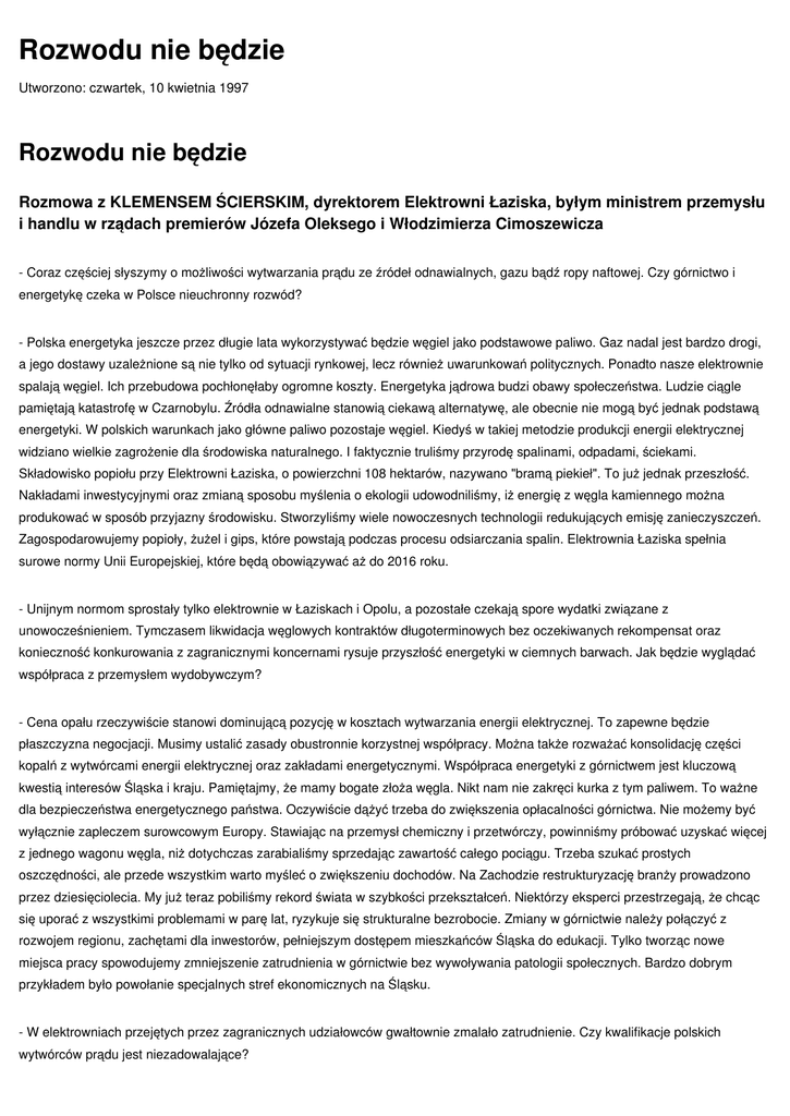 Rozwodu nie będzie Utworzono: czwartek, 10 kwietnia 1997 Rozwodu nie będzie Rozmowa z KLEMENSEM ŚCIERSKIM, dyrektorem Elektrowni Łaziska, byłym ministrem przemysłu i handlu w rządach premierów Józefa Oleksego i Włodzimierza Cimoszewicza - Coraz częściej słyszymy o możliwości wytwarzania prądu ze źródeł odnawialnych, gazu bądź ropy naftowej. Czy górnictwo i energetykę czeka w Polsce nieuchronny rozwód? - Polska energetyka jeszcze przez długie lata wykorzystywać będzie węgiel jako podstawowe paliwo. Gaz nadal jest bardzo drogi, a jego dostawy uzależnione są nie tylko od sytuacji rynkowej, lecz również uwarunkowań politycznych. Ponadto nasze elektrownie spalają węgiel. Ich przebudowa pochłonęłaby ogromne koszty. Energetyka jądrowa budzi obawy społeczeństwa. Ludzie ciągle pamiętają katastrofę w Czarnobylu. Źródła odnawialne stanowią ciekawą alternatywę, ale obecnie nie mogą być jednak podstawą energetyki. W polskich warunkach jako główne paliwo pozostaje węgiel. Kiedyś w takiej metodzie produkcji energii elektrycznej widziano wielkie zagrożenie dla środowiska naturalnego. I faktycznie truliśmy przyrodę spalinami, odpadami, ściekami. Składowisko popiołu przy Elektrowni Łaziska, o powierzchni 108 hektarów, nazywano "bramą piekieł". To już jednak przeszłość. Nakładami inwestycyjnymi oraz zmianą sposobu myślenia o ekologii udowodniliśmy, iż energię z węgla kamiennego można produkować w sposób przyjazny środowisku. Stworzyliśmy wiele nowoczesnych technologii redukujących emisję zanieczyszczeń. Zagospodarowujemy popioły, żużel i gips, które powstają podczas procesu odsiarczania spalin. Elektrownia Łaziska spełnia surowe normy Unii Europejskiej, które będą obowiązywać aż do 2016 roku. - Unijnym normom sprostały tylko elektrownie w Łaziskach i Opolu, a pozostałe czekają spore wydatki związane z unowocześnieniem. Tymczasem likwidacja węglowych kontraktów długoterminowych bez oczekiwanych rekompensat oraz konieczność konkurowania z zagranicznymi koncernami rysuje przyszłość energetyki w ciemnych barwach. Jak będzie wyglądać współpraca z przemysłem wydobywczym? - Cena opału rzeczywiście stanowi dominującą pozycję w kosztach wytwarzania energii elektrycznej. To zapewne będzie płaszczyzna negocjacji. Musimy ustalić zasady obustronnie korzystnej współpracy. Można także rozważać konsolidację części kopalń z wytwórcami energii elektrycznej oraz zakładami energetycznymi. Współpraca energetyki z górnictwem jest kluczową kwestią interesów Śląska i kraju. Pamiętajmy, że mamy bogate złoża węgla. Nikt nam nie zakręci kurka z tym paliwem. To ważne dla bezpieczeństwa energetycznego państwa. Oczywiście dążyć trzeba do zwiększenia opłacalności górnictwa. Nie możemy być wyłącznie zapleczem surowcowym Europy. Stawiając na przemysł chemiczny i przetwórczy, powinniśmy próbować uzyskać więcej z jednego wagonu węgla, niż dotychczas zarabialiśmy sprzedając zawartość całego pociągu. Trzeba szukać prostych oszczędności, ale przede wszystkim warto myśleć o zwiększeniu dochodów. Na Zachodzie restrukturyzację branży prowadzono przez dziesięciolecia. My już teraz pobiliśmy rekord świata w szybkości przekształceń. Niektórzy eksperci przestrzegają, że chcąc się uporać z wszystkimi problemami w parę lat, ryzykuje się strukturalne bezrobocie. Zmiany w górnictwie należy połączyć z rozwojem regionu, zachętami dla inwestorów, pełniejszym dostępem mieszkańców Śląska do edukacji. Tylko tworząc nowe miejsca pracy spowodujemy zmniejszenie zatrudnienia w górnictwie bez wywoływania patologii społecznych. Bardzo dobrym przykładem było powołanie specjalnych stref ekonomicznych na Śląsku. - W elektrowniach przejętych przez zagranicznych udziałowców gwałtownie zmalało zatrudnienie. Czy kwalifikacje polskich wytwórców prądu jest niezadowalające? - Naszym atutem jest doskonale wykwalifikowana kadra, a szczególnie ludzie potrafiący myśleć innowacyjnie. Wspólnie z naukowcami oraz kooperantami wdrażają oni najnowsze rozwiązania technologiczne. Stałe zmiany oraz ciągłe poszukiwanie ulepszeń są wyzwaniem przyszłości. I to niezależnie od wahań koniunktury na węgiel czy energię elektryczną. Energetyka oparta na węglu może być niezawodna i tania. Żeby tak się stało, muszą istnieć zarówno nowoczesne kopalnie, jak też elektrownie. W obu sektorach gwałtownie poszukując oszczędności musimy uważać, aby nie wylać dziecka z kąpielą. Samobójczym zagraniem jest na przykład zamykanie pracownikom dostępu do szkoleń podnoszących poziom wiedzy i zawodowych umiejętności. Zagraniczne koncerny zawsze mogą sprowadzić menedżerów, specjalistów, czy doskonale przygotowanych fachowców ze swoich krajów. Tylko jaki w tym będzie interes mieszkańców Śląska? Rozmawiała: JOLANTA TALARCZYK