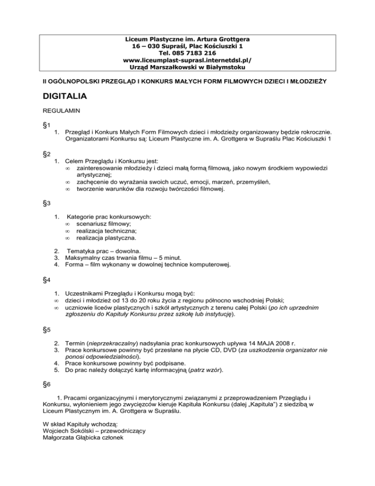 Liceum Plastyczne im. Artura Grottgera 16 – 030 Supraśl, Plac Kościuszki 1 Tel. 085 7183 216 www.liceumplast-suprasl.internetdsl.pl/ Urząd Marszałkowski w Białymstoku II OGÓLNOPOLSKI PRZEGLĄD I KONKURS MAŁYCH FORM FILMOWYCH DZIECI I MŁODZIEśY DIGITALIA REGULAMIN §1 1. Przegląd i Konkurs Małych Form Filmowych dzieci i młodzieŜy organizowany będzie rokrocznie. Organizatorami Konkursu są: Liceum Plastyczne im. A. Grottgera w Supraślu Plac Kościuszki 1 §2 1. Celem Przeglądu i Konkursu jest: • zainteresowanie młodzieŜy i dzieci małą formą filmową, jako nowym środkiem wypowiedzi artystycznej; • zachęcenie do wyraŜania swoich uczuć, emocji, marzeń, przemyśleń, • tworzenie warunków dla rozwoju twórczości filmowej. §3 1. Kategorie prac konkursowych: • scenariusz filmowy; • realizacja techniczna; • realizacja plastyczna. 2. Tematyka prac – dowolna. 3. Maksymalny czas trwania filmu – 5 minut. 4. Forma – film wykonany w dowolnej technice komputerowej. §4 1. Uczestnikami Przeglądu i Konkursu mogą być: • dzieci i młodzieŜ od 13 do 20 roku Ŝycia z regionu północno wschodniej Polski; • uczniowie liceów plastycznych i szkół artystycznych z terenu całej Polski (po ich uprzednim zgłoszeniu do Kapituły Konkursu przez szkołę lub instytucję). §5 2. Termin (nieprzekraczalny) nadsyłania prac konkursowych upływa 14 MAJA 2008 r. 3. Prace konkursowe powinny być przesłane na płycie CD, DVD (za uszkodzenia organizator nie ponosi odpowiedzialności). 4. Prace konkursowe powinny być podpisane. 5. Do prac naleŜy dołączyć kartę informacyjną (patrz wzór). §6 1. Pracami organizacyjnymi i merytorycznymi związanymi z przeprowadzeniem Przeglądu i Konkursu, wyłonieniem jego zwycięzców kieruje Kapituła Konkursu (dalej „Kapituła”) z siedzibą w Liceum Plastycznym im. A. Grottgera w Supraślu. W skład Kapituły wchodzą: Wojciech Sokólski – przewodniczący Małgorzata Głąbicka członek Sławomir Salmanowicz – członek Katarzyna Zabłocka – sekretarz §7 1. Przegląd i Konkurs przeprowadzony będzie w dwóch etapach: I etap wyłonienie najlepszych prac dopuszczonych do przeglądu i finału konkursu II etap – przegląd i finał konkursu, wyłonienie 3 zwycięzców. §8 1. Kapituła organizuje uroczyste zakończenie Przeglądu i Konkursu w dniu 02 CZERWCA 2008 roku połączone z ogłoszeniem wyników i wręczeniem uczestnikom dyplomów, nagród. §9 1. Finanse na organizację Przeglądu i Konkursu oraz nagrody pochodzą od organizatorów, sponsorów i dotacji. §10 Decyzja Komisji Konkursowej jest ostateczna i nieodwołalna. Prace konkursowe przechodzą na własność organizatorów. Kapituła Konkursu DIGITALIA
