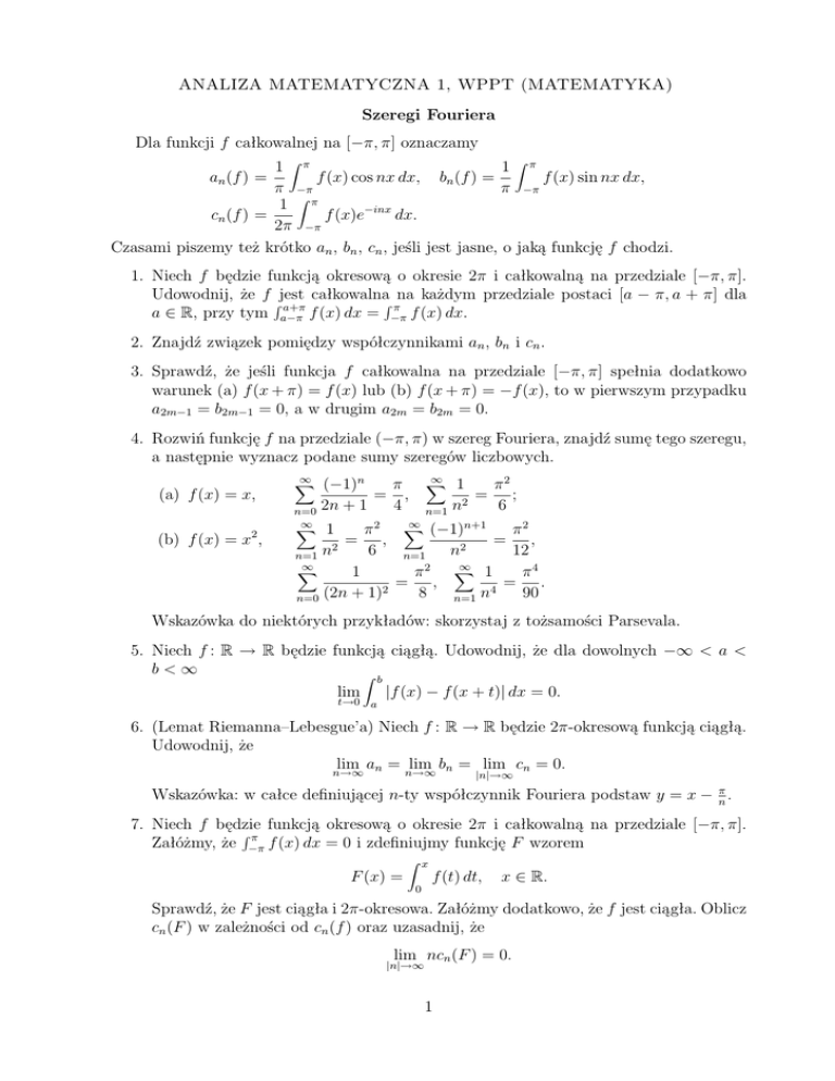 ANALIZA MATEMATYCZNA 1, WPPT (MATEMATYKA) Szeregi Fouriera Dla funkcji f całkowalnej na [−π, π] oznaczamy 1Zπ 1Zπ an (f ) = f (x) cos nx dx, bn (f ) = f (x) sin nx dx, π −π π −π 1 Zπ f (x)e−inx dx. cn (f ) = 2π −π Czasami piszemy też krótko an , bn , cn , jeśli jest jasne, o jaką funkcję f chodzi. 1. Niech f będzie funkcją okresową o okresie 2π i całkowalną na przedziale [−π, π]. Udowodnij, że f Rjest całkowalnaR na każdym przedziale postaci [a − π, a + π] dla a+π π a ∈ R, przy tym a−π f (x) dx = −π f (x) dx. 2. Znajdź związek pomiędzy współczynnikami an , bn i cn . 3. Sprawdź, że jeśli funkcja f całkowalna na przedziale [−π, π] spełnia dodatkowo warunek (a) f (x + π) = f (x) lub (b) f (x + π) = −f (x), to w pierwszym przypadku a2m−1 = b2m−1 = 0, a w drugim a2m = b2m = 0. 4. Rozwiń funkcję f na przedziale (−π, π) w szereg Fouriera, znajdź sumę tego szeregu, a następnie wyznacz podane sumy szeregów liczbowych. (a) f (x) = x, (b) f (x) = x2 , ∞ X (−1)n n=0 ∞ X 2n + 1 = ∞ X 1 π , 4 n=1 n2 = π2 ; 6 ∞ 1 (−1)n+1 π2 X π2 = , = , 2 6 n2 12 n=1 n n=1 ∞ ∞ X 1 π2 X 1 π4 = , = . 2 4 8 90 n=0 (2n + 1) n=1 n Wskazówka do niektórych przykładów: skorzystaj z tożsamości Parsevala. 5. Niech f : R → R będzie funkcją ciągłą. Udowodnij, że dla dowolnych −∞ < a < b<∞ Z b |f (x) − f (x + t)| dx = 0. lim t→0 a 6. (Lemat Riemanna–Lebesgue’a) Niech f : R → R będzie 2π-okresową funkcją ciągłą. Udowodnij, że lim an = lim bn = lim cn = 0. n→∞ n→∞ |n|→∞ Wskazówka: w całce definiującej n-ty współczynnik Fouriera podstaw y = x − πn . 7. Niech f będzie funkcją okresową o okresie 2π i całkowalną na przedziale [−π, π]. Rπ Załóżmy, że −π f (x) dx = 0 i zdefiniujmy funkcję F wzorem F (x) = Z x f (t) dt, 0 x ∈ R. Sprawdź, że F jest ciągła i 2π-okresowa. Załóżmy dodatkowo, że f jest ciągła. Oblicz cn (F ) w zależności od cn (f ) oraz uzasadnij, że lim ncn (F ) = 0. |n|→∞ 1 8. Podaj przepis na rozwijanie funkcji f całkowalnej na przedziale [0, π] w szereg Fouriera złożony z samych (a) kosinusów; (b) sinusów. Rozwiń funkcję sinus na przedziale [0, π] w szereg Fouriera złożony z samych kosinusów. Następnie wykaż, że ∞ X (−1)n+1 n=1 π−2 = , 2 4n − 1 4 ∞ X ∞ X 1 π2 − 8 . = 2 2 16 n=1 (4n − 1) 1 1 = , 2 2 n=1 4n − 1 Jak rozwinąć funkcję f (x) = x2 , 0 ¬ x < π, w szereg Fouriera złożony z samych sinusów? 9. Udowodnij równości ∞ sin(2n − 1)x 4X , (a) sgn x = π n=1 2n − 1 (b) dla −π < x < π, ∞ X 3x2 − 6πx + 2π 2 cos nx = , 12 n2 n=1 dla 0 ¬ x ¬ π. 10. Załóżmy, że funkcja f ma postać f (x) = W (cos x, sin x), gdzie W jest pewnym wielomianem dwóch zmiennych. Opisz procedurę wyznaczania szeregu Fouriera funkcji f bez obliczania współczynników Fouriera. (Wskazówka: użyj m.in. wzorów Eulera). Napisz szereg Fouriera funkcji f , jeśli: (a) f (x) = sin2 x; (b) f (x) = sin3 x cos2 x; (c) f (x) = cos4 x. Czy można uogólnić tą procedurę na przypadek, gdy W jest funkcją wymierną dwóch zmiennych? Znajdź poniższe rozwinięcie funkcji f w szereg Fouriera (d) f (x) = ∞ X 1 − a2 an cos nx, = 1 + 2 1 − 2a cos x + a2 n=1 |a| < 1. 11. Wyznacz podane sumy szeregów trygonometrycznych ∞ X sin nx n=1 n! = ecos x sin(sin x); ∞ X cos nx n=0 2 n! = ecos x cos(sin x).