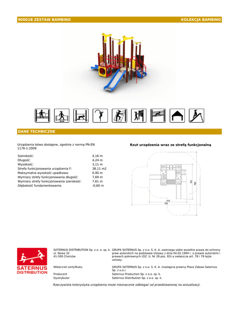 90001B ZESTAW BAMBINO KOLEKCJA BAMBINO DANE TECHNICZNE Urządzenia łatwo dostępne, zgodnie z normą PN-EN 1176-1:2009 Szerokość: Długość: Wysokość: Strefa funkcjonowania urządzenia F: Maksymalna wysokość upadkowa: Wymiary strefy funkcjonowania długość: Wymiary strefy funkcjonowania szerokość: Głębokość fundamentowania: Rzut urządzenia wraz ze strefą funkcjonalną 4,16 m 4,24 m 3,11 m 38,11 m2 0,90 m 7,69 m 7,61 m -0,60 m SATERNUS DISTRIBUTION Sp. z o. o. sp. k. GRUPA SATERNUS Sp. z o.o. S. K. A. zastrzega sobie wszelkie prawa do ochrony ul. Nowa 32 praw autorskich na podstawie Ustawy z dnia 04.02.1994 r. o prawie autorskim i 41-500 Chorzów prawach pokrewnych (DZ. U. Nr 28 poz. 83) a zwłaszcza art. 78 i 79 tejże ustawy. Właściciel certyfikatu Producent Dystrybutor GRUPA SATERNUS Sp. z o.o. S. K. A. (następna prawny Place Zabaw Saternus Sp. z o.o.) Saternus Production Sp. z o.o. sp. k. Saternus Distribution Sp. z o.o. sp. k. Rzeczywista kolorystyka urządzenia może nieznacznie odbiegać od przedstawionej na wizualizacji. Widok urządzenia Urządzenie wykonane zgodnie z PN-EN 1176:1-2009 Wyposażenie placów zabaw. Ogólne wymagania bezpieczeństwa i metody badań. Nawierzchnie amoryzujące: trawa, piasek, żwir, kora, nawierzchnia synetyczna (grubość minimalna dla wszystkich nawierzchni sypkich 200mm) SATERNUS DISTRIBUTION Sp. z o. o. sp. k. GRUPA SATERNUS Sp. z o.o. S. K. A. zastrzega sobie wszelkie prawa do ochrony ul. Nowa 32 praw autorskich na podstawie Ustawy z dnia 04.02.1994 r. o prawie autorskim i 41-500 Chorzów prawach pokrewnych (DZ. U. Nr 28 poz. 83) a zwłaszcza art. 78 i 79 tejże ustawy. Właściciel certyfikatu Producent Dystrybutor GRUPA SATERNUS Sp. z o.o. S. K. A. (następna prawny Place Zabaw Saternus Sp. z o.o.) Saternus Production Sp. z o.o. sp. k. Saternus Distribution Sp. z o.o. sp. k. Rzeczywista kolorystyka urządzenia może nieznacznie odbiegać od przedstawionej na wizualizacji. SKŁAD URZĄDZENIA Balkonik: Mostek z lin: Pomost ruchomy: Przejście tunelowe: Rura strażacka wys. 90 cm: Ścianka wspinaczkowa ukośna: Sklepik: Tablica rysunkowa: Wieża bez dachu, podest wys. 55 cm: Wieża z dachem, podest wys. 30cm: Wieża z dachem, podest wys. 90cm: Zjeżdżalnia wys. 55 cm: Zjeżdżalnia wys. 90 cm: MATERIAŁY 1 1 1 2 1 1 1 1 2 2 2 1 1 Elementy połaciowe: Elementy stalowe: Fundamenty: Kotwy: Liny: Nogi konstrukcyjne: Podesty, schody: Ścianka wspinaczkowa: Ślizg: Tablica rysunkowa: Zaślepki: Łańcuch: płyty HDPE stal cynkowana cynkoprimem, malowana proszkowo beton klasy min. C12/15 stal ocynkowana kąpielowo polipropylenowe, wielooplotowe o grubości min. 16 mm, z rdzeniem stalowym, niepalne połączone ze sobą poprzez plastikowe łączniki wykonane z drewna klejonego trójwarstwowo, malowanego lakierobejcą na kolor ciemny orzech, zaokrąglonego na krawędziach, o przekroju 90 x 90 mm. wykonane z drewna impregnowanego, frezowanego w celu zabezpieczenia przed poślizgiem, o grubości min. 30 mm sklejka wodoodporna szalunkowa, uchwyty alpinistyczne z tworzywa opartego na żywicach stal nierdzewna sklejka wodoodporna szalunkowa gr. 15mm, malowana farbą tablicową tworzywo sztuczne stal ocynkowana kąpielowo SATERNUS DISTRIBUTION Sp. z o. o. sp. k. GRUPA SATERNUS Sp. z o.o. S. K. A. zastrzega sobie wszelkie prawa do ochrony ul. Nowa 32 praw autorskich na podstawie Ustawy z dnia 04.02.1994 r. o prawie autorskim i 41-500 Chorzów prawach pokrewnych (DZ. U. Nr 28 poz. 83) a zwłaszcza art. 78 i 79 tejże ustawy. Właściciel certyfikatu Producent Dystrybutor GRUPA SATERNUS Sp. z o.o. S. K. A. (następna prawny Place Zabaw Saternus Sp. z o.o.) Saternus Production Sp. z o.o. sp. k. Saternus Distribution Sp. z o.o. sp. k. Rzeczywista kolorystyka urządzenia może nieznacznie odbiegać od przedstawionej na wizualizacji.