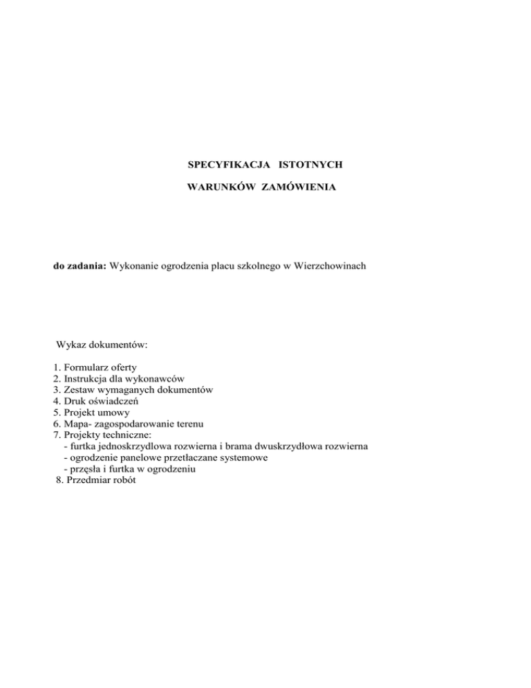 SPECYFIKACJA ISTOTNYCH WARUNKÓW ZAMÓWIENIA do zadania: Wykonanie ogrodzenia placu szkolnego w Wierzchowinach Wykaz dokumentów: 1. Formularz oferty 2. Instrukcja dla wykonawców 3. Zestaw wymaganych dokumentów 4. Druk oświadczeń 5. Projekt umowy 6. Mapa- zagospodarowanie terenu 7. Projekty techniczne: - furtka jednoskrzydlowa rozwierna i brama dwuskrzydłowa rozwierna - ogrodzenie panelowe przetłaczane systemowe - przęsła i furtka w ogrodzeniu 8. Przedmiar robót Dnia............................................. OFERTA ...................................................... ...................................................... ...................................................... Dane oferenta nazwa i adres Do................................................... /Zamawiaj ącego/ ....................................................... ....................................................... 1.Oferujemy wykonanie.......................................................................................................... .......................................................................................................................................................... ..................................................................................................... objętych przetargiem nieograniczonym za cenę netto ................................ PLN Słownie:.................................................................................................................... plus podatek VAT ............. % tj. brutto.....................................................PLN 2.Oświadczamy, Ŝe zapoznaliśmy się ze specyfikacją istotnych warunków zamówienia i nie wnosimy do niej zastrzeŜeń oraz zdobyliśmy konieczne informacje do przygotowania oferty. 3. Oświadczamy, Ŝe uwaŜamy się za związanych niniejszą ofertą na czas wskazany w specyfikacji istotnych warunków zamówienia. 4. Oświadczamy, Ŝe zawarte w specyfikacji istotnych warunków zamówienia warunki zostały przez nas zaakceptowane i zobowiązujemy się w przypadku wyboru naszej oferty do zawarcia umowy na wyŜej wymienionych warunkach w miejscu i terminie wyznaczonym przez zamawiającego. 5. Załącznikami do niniejszej oferty są: ......................................................... ......................................................... ......................................................... ......................................................... ......................................................... ....................... Podpisano .................................................... .................................................... /upełnomocniony przedstawiciel/ .................................................... /adres/ dnia............................................. Instrukcja dla wykonawcy Stosownie do ustaleń art. 36 ust.1 ustawy z dnia 29.01.2004 r Prawo zamówień publicznych (Dz.U.Nr 19,poz.177 z późn. zmianami) ustala się dla oferentów przystępujących do przetargu nieograniczonego na wykonanie robót następujące warunki: 1.Opis sposobu przygotowania oferty: Oferta na wykonanie zadania objętego przetargiem winna być sporządzona w formie pisemnej i w sposób czytelny. Koperta zawierająca ofertę powinna być zaklejona, opieczętowana i posiadać napis: „Przetarg nieograniczony – Wykonanie ogrodzenia placu szkolnego w Wierzchowinach” 2. Opis kryteriów i sposobu dokonania oceny spełnienia warunków wymaganych od wykonawców : O udzielenie zamówienia ubiegać się mogą wykonawcy: - którzy, nie podlegają wykluczeniu na podstawie art. 24 ust. 1 i 2 ustawy, - którzy, spełniają warunki zawarte w art. 22 ust. 1, oraz specyfikacji istotnych warunków zamówienia, 3. Informacja o dokumentach jakie muszą dostarczyć wykonawcy w celu potwierdzenia spełnienia wymaganych warunków wymienionych w pkt.2. Wykonawca winien przedłoŜyć dokumenty w formie pisemnej: 1) formularz oferty na załączonym druku, 2) kosztorys ofertowy, 3) aktualny odpis z właściwego rejestru lub zaświadczenie o wpisie do ewidencji działalności gospodarczej wystawione nie wcześniej niŜ 6 miesięcy przed upływem terminu składania ofert, 4) aktualne zaświadczenia z Zakładu Ubezpieczeń Społecznych lub Kasy Rolniczego Ubezpieczenia Społecznego oraz Urzędu Skarbowego o nie zaleganiu w składkach podatkowych i ubezpieczeniowych – wystawionych nie wcześniej niŜ 3 miesiące przed upływem składania ofert lub oświadczenia o nie zaleganiu w opłatach, 5) podpisane oświadczenie na załączonym druku, 6)wykaz wykonanych robót budowlanych w ciągu ostatnich pięciu lat, a jeŜeli okres prowadzenia działalności jest krótszy - w tym okresie, 7)parafowany projekt umowy. Wykonawca, który nie spełni chociaŜby jednego wymaganego od niego warunku zostanie wykluczony z postępowania przetargowego. 4. Opis przedmiotu zamówienia: Wspólny Słownik Zamówień (CPV) – 45.34.00.00-2 Przedmiotem zamówienia są roboty budowlane: Wykonanie ogrodzenia placu szkolnego w Wierzchowinach. Nie dopuszcza się składania ofert częściowych. 5. Wymagany termin wykonania zamówienia: 14.08.2009 r. Nie uwzględnia się wniosków o zmianę terminu realizacji zadania. 6. Istotne postanowienia, które zostaną wprowadzone do treści zawartej umowy: Realizacja wypłaty nastąpi na rachunek bankowy Wykonawcy w terminie do 14 dni od daty otrzymania faktury. 7. Opis sposobu obliczenia oferty: Ustala się następującą wartość poszczególnych kryteriów: - cena - 100%, 8. Okres związania ofertą zgodnie z art. 85 ust 1 pkt. 1 ustawy Prawo zamówień publicznych – 30 dni licząc od dnia 18.06.2009 r. 9. Informacje i wyjaśnienia dotyczące zamówienia: Informacje będą udzielane w pok. nr 2 w budynku PSP w Jedlińsku( skrzydło północne) p. Danuta Durak, tel. (048)3213115. 10. Miejsce i termin otwarcia ofert: Gminny Zespół Ekonomiczno- Administracyjny Szkół w Jedlińsku, pok. nr 2 (budyn