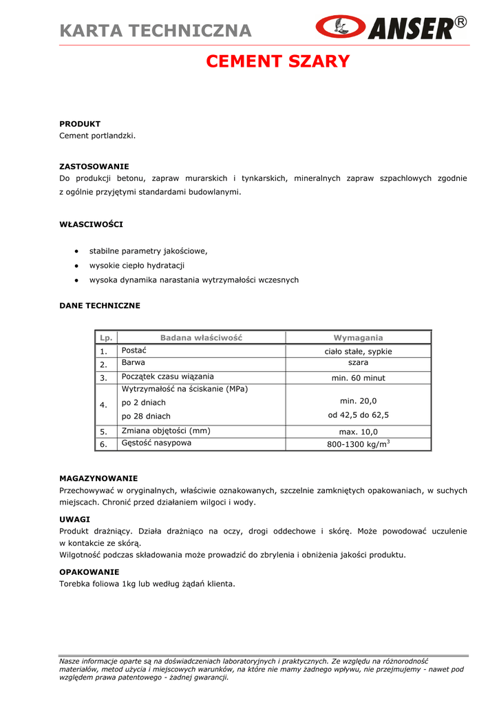 KARTA TECHNICZNA CEMENT SZARY PRODUKT Cement portlandzki. ZASTOSOWANIE Do produkcji betonu, zapraw murarskich i tynkarskich, mineralnych zapraw szpachlowych zgodnie z ogólnie przyjętymi standardami budowlanymi. WŁASCIWOŚCI stabilne parametry jakościowe, wysokie ciepło hydratacji wysoka dynamika narastania wytrzymałości wczesnych DANE TECHNICZNE Lp. Badana właściwość 1. Postać 2. Barwa 3. Początek czasu wiązania Wymagania ciało stałe, sypkie szara min. 60 minut Wytrzymałość na ściskanie (MPa) 4. po 2 dniach po 28 dniach 5. Zmiana objętości (mm) 6. Gęstość nasypowa min. 20,0 od 42,5 do 62,5 max. 10,0 800-1300 kg/m3 MAGAZYNOWANIE Przechowywać w oryginalnych, właściwie oznakowanych, szczelnie zamkniętych opakowaniach, w suchych miejscach. Chronić przed działaniem wilgoci i wody. UWAGI Produkt drażniący. Działa drażniąco na oczy, drogi oddechowe i skórę. Może powodować uczulenie w kontakcie ze skórą. Wilgotność podczas składowania może prowadzić do zbrylenia i obniżenia jakości produktu. OPAKOWANIE Torebka foliowa 1kg lub według żądań klienta. Nasze informacje oparte są na doświadczeniach laboratoryjnych i praktycznych. Ze względu na różnorodność materiałów, metod użycia i miejscowych warunków, na które nie mamy żadnego wpływu, nie przejmujemy - nawet pod względem prawa patentowego - żadnej gwarancji.