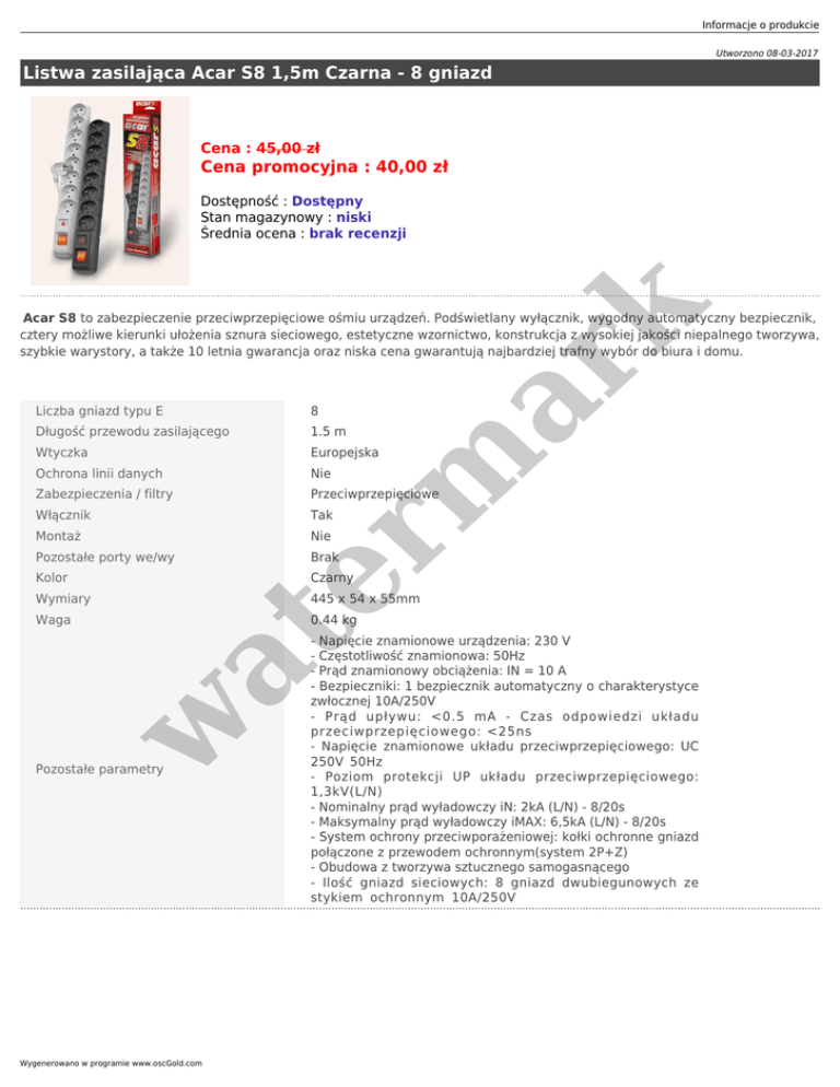 Informacje o produkcie Utworzono 08-03-2017 Listwa zasilająca Acar S8 1,5m Czarna - 8 gniazd Cena : 45,00 zł Cena promocyjna : 40,00 zł er m ar k Dostępność : Dostępny Stan magazynowy : niski Średnia ocena : brak recenzji Acar S8 to zabezpieczenie przeciwprzepięciowe ośmiu urządzeń. Podświetlany wyłącznik, wygodny automatyczny bezpiecznik, cztery możliwe kierunki ułożenia sznura sieciowego, estetyczne wzornictwo, konstrukcja z wysokiej jakości niepalnego tworzywa, szybkie warystory, a także 10 letnia gwarancja oraz niska cena gwarantują najbardziej trafny wybór do biura i domu. Liczba gniazd typu E Długość przewodu zasilającego Wtyczka 1.5 m Europejska Ochrona linii danych Zabezpieczenia / filtry Włącznik Nie Przeciwprzepięciowe Tak Montaż Nie Pozostałe porty we/wy Kolor Brak Czarny 445 x 54 x 55mm 0.44 kg w at Wymiary Waga 8 Pozostałe parametry Wygenerowano w programie www.oscGold.com - Napięcie znamionowe urządzenia: 230 V - Częstotliwość znamionowa: 50Hz - Prąd znamionowy obciążenia: IN = 10 A - Bezpieczniki: 1 bezpiecznik automatyczny o charakterystyce zwłocznej 10A/250V - Prąd upływu: <0.5 mA - Czas odpowiedzi układu przeciwprzepięciowego: <25ns - Napięcie znamionowe układu przeciwprzepięciowego: UC 250V 50Hz - Poziom protekcji UP układu przeciwprzepięciowego: 1,3kV(L/N) - Nominalny prąd wyładowczy iN: 2kA (L/N) - 8/20s - Maksymalny prąd wyładowczy iMAX: 6,5kA (L/N) - 8/20s - System ochrony przeciwporażeniowej: kołki ochronne gniazd połączone z przewodem ochronnym(system 2P+Z) - Obudowa z tworzywa sztucznego samogasnącego - Ilość gniazd sieciowych: 8 gniazd dwubiegunowych ze stykiem ochronnym 10A/250V