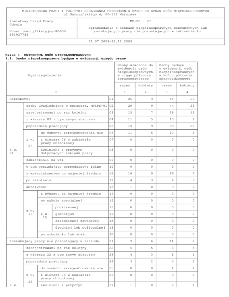 MINISTERSTWO PRACY I POLITYKI SPOŁECZNEJ PEŁNOMOCNIK RZ DU DO SPRAW OSÓB NIEPEŁNOSPRAWNYCH ul.Gałczy skiego 4, 00-362 Warszawa Powiatowy Urz d Pracy Gdynia MPiPS - 07 Numer identyfikacyjny-REGON 191927734 Sprawozdanie o osobach niepełnosprawnych bezrobotnych lub poszukuj cych pracy nie pozostaj cych w zatrudnieniu 01.07.2003-31.12.2003 Dział 1. EWIDENCJA OSÓB NIEPEŁNOSPRAWNYCH 1.1. Osoby niepełnosprawne b d ce w ewidencji urz du pracy Osoby wł czone do ewidencji osób niepełnosprawnych w ci gu półrocza sprawozdawczego Wyszczególnienie 0 Bezrobotni Osoby b d ce w ewidencji osób niepełnosprawnych w ko cu półrocza sprawozdawczego razem kobiety razem kobiety 1 2 3 4 01 25 9 44 23 osoby uwzgl dnione w sprawozd. MPiPS-01 02 20 9 44 23 zarejestrowani po raz kolejny 03 15 7 26 12 z wiersza 03 z tym samym statusem 04 11 5 13 7 poprzednio pracuj cy 05 19 9 39 20 do momentu zarejestrowania si 06 11 5 12 8 z wiersza 06 w zakładzie pracy chronionej 07 0 0 0 0 zwolnieni z przyczyn dotycz cych zakładu pracy 08 0 0 0 0 zamieszkali na wsi 09 0 0 0 0 w tym posiadaj cy gospodarstwo rolne 10 0 0 0 0 z wykształceniem co najmniej 11 14 9 16 7 po szkoleniu 12 4 3 4 3 absolwenci 13 1 0 0 0 14 0 0 0 0 15 0 0 0 0 podstawowej 16 0 0 0 0 gimnazjum 17 0 0 0 0 zasadniczej zawodowej 18 0 0 0 0 19 0 0 0 0 20 0 0 0 0 Poszukuj cy pracy nie pozostaj cy w zatrudn. 21 9 6 11 7 zarejestrowani po raz kolejny 22 6 5 3 3 z wiersza 22 z tym samym statusem 23 4 3 1 1 poprzednio pracuj cy 24 3 2 4 3 do momentu zarejestrowania si 25 0 0 1 1 z wiersza 25 w zakładzie pracy chronionej 26 0 0 0 0 zwolnieni z przyczyn 27 1 0 2 1 Z w. 05 Z w. 01 z wykszt. co najmniej rednim rednim po szkole specjalnej z w. 13 z w. 15 redniej lub policealnej po szkoleniu lub sta u Z w. 24 Z w. 20 dotycz cych zakładu pracy zamieszkali na wsi 28 0 0 0 0 w tym posiadaj cy gospodarstwo rolne 29 0 0 0 0 z wykształceniem co najmniej 30 6 4 10 7 po szkoleniu 31 1 1 1 1 pobieraj cy wiadczenie rentowe z tytułu niezdolno ci do pracy 32 7 4 5 3 pobieraj cy rent 33 1 1 1 1 34 0 0 1 0 35 0 0 1 0 36 0 0 0 0 podstawowej 37 0 0 0 0 gimnazjum 38 0 0 0 0 zasadniczej zawodowej 39 0 0 0 0 40 0 0 0 0 41 0 0 0 0 rednim socjaln zarejestrowani w okresie 12 miesi cy po uko czeniu szkoły z wykszt. co najmniej rednim po szkole specjalnej z w. 34 z w. 36 redniej lub policealnej po szkoleniu lub sta u
