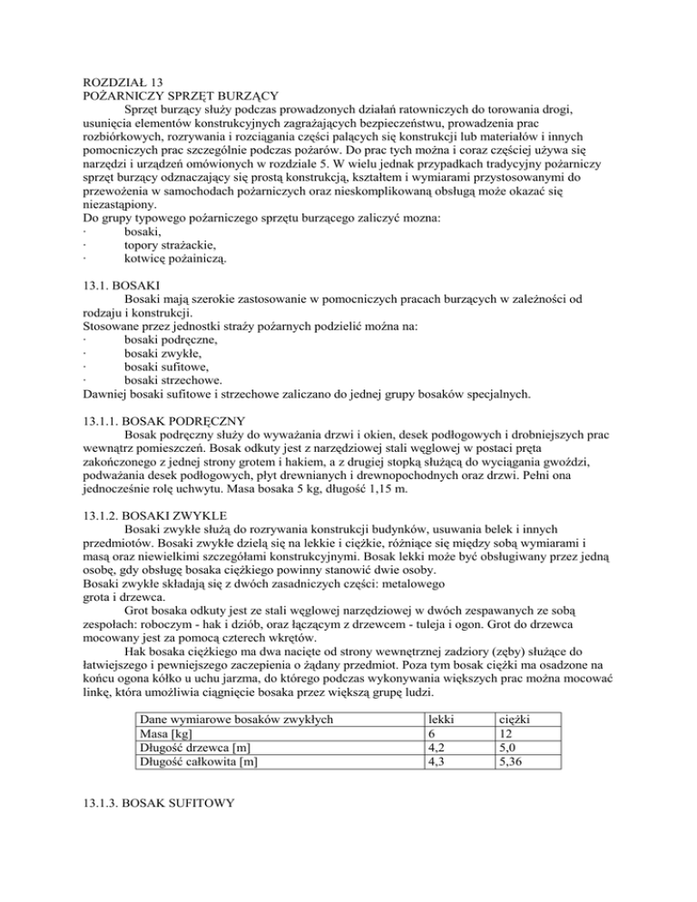 ROZDZIAŁ 13 POŻARNICZY SPRZĘT BURZĄCY Sprzęt burzący służy podczas prowadzonych działań ratowniczych do torowania drogi, usunięcia elementów konstrukcyjnych zagrażających bezpieczeństwu, prowadzenia prac rozbiórkowych, rozrywania i rozciągania części palących się konstrukcji lub materiałów i innych pomocniczych prac szczególnie podczas pożarów. Do prac tych można i coraz częściej używa się narzędzi i urządzeń omówionych w rozdziale 5. W wielu jednak przypadkach tradycyjny pożarniczy sprzęt burzący odznaczający się prostą konstrukcją, kształtem i wymiarami przystosowanymi do przewożenia w samochodach pożarniczych oraz nieskomplikowaną obsługą może okazać się niezastąpiony. Do grupy typowego poźarniczego sprzętu burzącego zaliczyć mozna: · bosaki, · topory strażackie, · kotwicę pożainiczą. 13.1. BOSAKI Bosaki mają szerokie zastosowanie w pomocniczych pracach burzących w zależności od rodzaju i konstrukcji. Stosowane przez jednostki straźy poźarnych podzielić moźna na: · bosaki podręczne, · bosaki zwykłe, · bosaki sufitowe, · bosaki strzechowe. Dawniej bosaki sufitowe i strzechowe zaliczano do jednej grupy bosaków specjalnych. 13.1.1. BOSAK PODRĘCZNY Bosak podręczny służy do wyważania drzwi i okien, desek podłogowych i drobniejszych prac wewnątrz pomieszczeń. Bosak odkuty jest z narzędziowej stali węglowej w postaci pręta zakończonego z jednej strony grotem i hakiem, a z drugiej stopką służącą do wyciągania gwoździ, podważania desek podłogowych, płyt drewnianych i drewnopochodnych oraz drzwi. Pełni ona jednocześnie rolę uchwytu. Masa bosaka 5 kg, długość 1,15 m. 13.1.2. BOSAKI ZWYKLE Bosaki zwykłe służą do rozrywania konstrukcji budynków, usuwania belek i innych przedmiotów. Bosaki zwykłe dzielą się na lekkie i ciężkie, różniące się między sobą wymiarami i masą oraz niewielkimi szczegółami konstrukcyjnymi. Bosak lekki może być obsługiwany przez jedną osobę, gdy obsługę bosaka ciężkiego powinny stanowić dwie osoby. Bosaki zwykłe składają się z dwóch zasadniczych części: metalowego grota i drzewca. Grot bosaka odkuty jest ze stali węglowej narzędziowej w dwóch zespawanych ze sobą zespołach: roboczym - hak i dziób, oraz łączącym z drzewcem - tuleja i ogon. Grot do drzewca mocowany jest za pomocą czterech wkrętów. Hak bosaka ciężkiego ma dwa nacięte od strony wewnętrznej zadziory (zęby) służące do łatwiejszego i pewniejszego zaczepienia o żądany przedmiot. Poza tym bosak ciężki ma osadzone na końcu ogona kółko u uchu jarzma, do którego podczas wykonywania większych prac można mocować linkę, która umożliwia ciągnięcie bosaka przez większą grupę ludzi. Dane wymiarowe bosaków zwykłych Masa [kg] Długość drzewca [m] Długość całkowita [m] 13.1.3. BOSAK SUFITOWY lekki 6 4,2 4,3 ciężki 12 5,0 5,36 Bosak sufitowy służy do prac wewnątrz budynku, jak odbijanie tynków, zrywanie podsufitki i stropów podwieszonych, zrywanie przewodów itp. Podobnie jak bosaki zwykłe składa się z dwóch części - grota osadzonego na drzewcu. Grot bosaka sufitowego ma dwa przeciwległe haki, jeden ostry, a drugi o kształcie łopatki kilofa. Zamiast dzioba grot ma spłaszczony przecinak. Masa bosaka wynosi 6 kg, długość 2,61 m, rozpiętość haka 0,24 m, szerokość 38 mm. Obsługa bosaka jedna osoba. 13.1.4. BOSAK STRZECHOWY Bosak strzechowy służy do rozrywania strzech (dachów krytych słomą), stogów słomy i siana, rozciągania materiałów włóknistych, strzępiastych itp. Grot bosaka wykonany w postaci trójzębnego haka osadzony jest na drzewcu. Masa bosaka wynosi 8 kg, długość 5 m, obsługiwany powinien być przez dwie osoby. 13.2. TOPORY STRAŻACKIE Topory strażackie w działaniach ratowniczych służą do wyrąbywania belek, podłóg, drzwi, wyważania zamków i innych podobnych prac. Dla potrzeb straży pożarnych produkowane były dwa rodzaje toporów: · topór strażacki ciężki, · inopur (pisownia według producenta inop - ur). Topór strażacki ciężki, zwany dawniej saganem, składa się ze stalowego obucha osadzonego na drewnianym toporzysku. Masa topora 3,3 kg, długość całkowita 0,9 m. Inopur pomyślany i skonstruowany został jako urządzenie, które oprócz funkcji topora umożliwiać będzie prowadzenie ratownictwa drogowego. Składa się z dwóch zasadniczych części: topora tj. obucha osadzonego na trzonie z rury stalowej oraz raka osadzonego na drągu. Urządzenie noszone jest w stanie złożonym po wsunięciu drąga do wnętrza trzonu i zablokowanie zamka, na pasie nośnym wokół pasa lub przez ramię. Topór i rak mogą być używane osobno lub jako układ dźwigni. Wykonane w tym celu otwory w toporze pozwalają na zastosowanie kilku takich połączeń. Trzon topora pokryty jest wykładziną wykonaną ze specjalnie dobranego tworzywa amortyzującego uderzenia i dającego pewność uchwytu. Rak jest przyrządem służącym głównie do rozerwania blach nadwozia samochodowego. Ponadto umożliwia otwieranie lub odrywanie z zawiasów zablokowanych drzwi samochodów, przesuwanie zaklinowanych foteli lub innych elementów pojazdów, wybijanie sworzni, śrub itp. Dodatkowe możliwości daje pas nośny, który można używać do zaczepiania o niektóre elementy pojazdu np. dźwignie i pedały gazu, kierownic, sprzęgła itp. Ponadto można dodatkowo wykorzystać do podniesienhi masy do 1500 kg., lub np. do zaczepiania samochodu i odholowania na niewi'ęlką odległość w przypadku braku linki holowniczej. 13.3. KOTWICA POŻARNICZA Kotwica służy do wykonywania ciężkich prac wyburzeniowych, jak przewracanie grożących zawaleniem ścian i kominów, rozrywanie konstrukcji budynków, wyciąganie ciężkich przedmiotów i elementów konstrukcyjnych. Wykonana jest z płaskowników stalowych w kształcie dwuzębnego hak zakończonego zadziorami (zębami). Do kotwicy dołączony jest łańcu