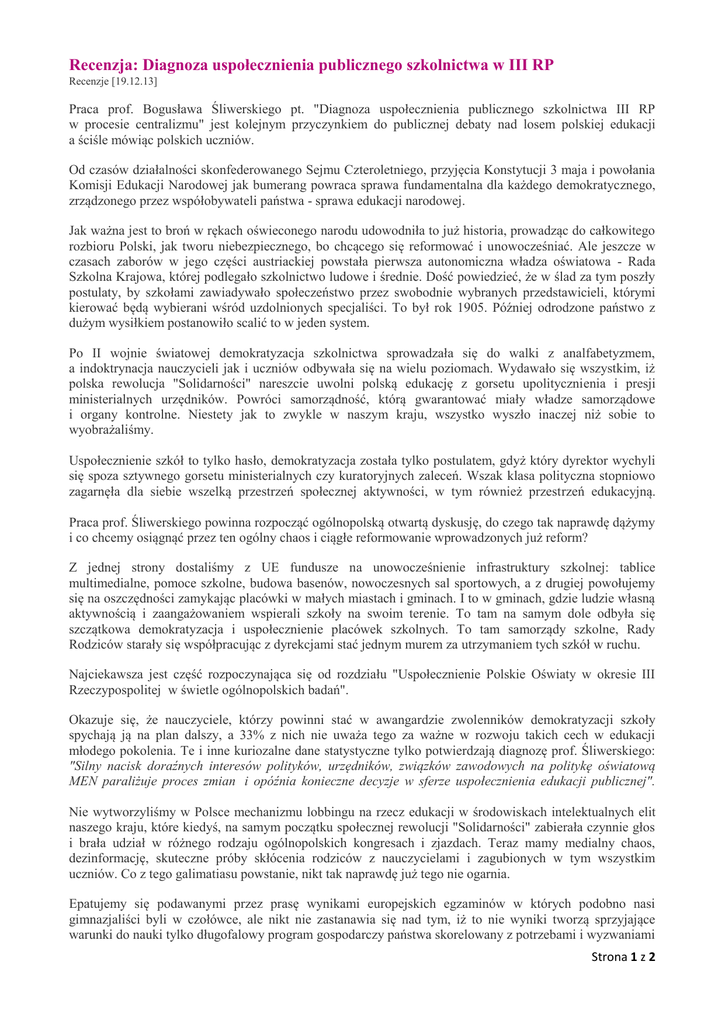Recenzja: Diagnoza uspołecznienia publicznego szkolnictwa w III RP