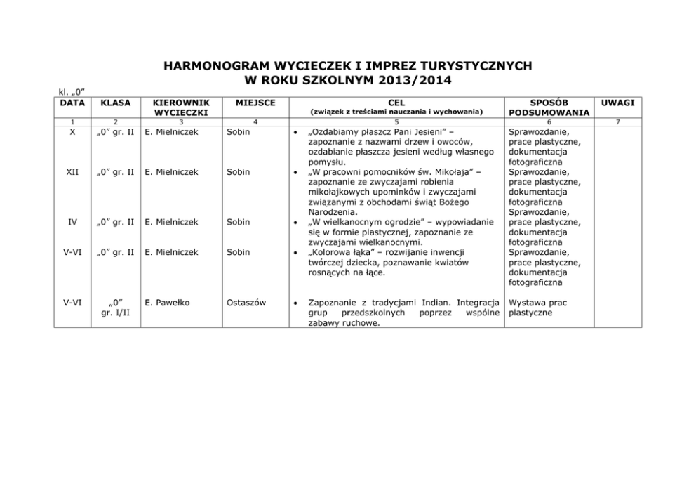 HARMONOGRAM WYCIECZEK I IMPREZ TURYSTYCZNYCH W ROKU SZKOLNYM 2013/2014 kl. „0” DATA KLASA KIEROWNIK WYCIECZKI MIEJSCE CEL (związek z treściami nauczania i wychowania) 1 2 X „0” gr. II E. Mielniczek 3 Sobin 4 5 XII „0” gr. II E. Mielniczek Sobin IV „0” gr. II E. Mielniczek Sobin V-VI „0” gr. II E. Mielniczek Sobin V-VI „0” gr. I/II E. Pawełko Ostaszów SPOSÓB PODSUMOWANIA UWAGI 6 7 „Ozdabiamy płaszcz Pani Jesieni” – zapoznanie z nazwami drzew i owoców, ozdabianie płaszcza jesieni według własnego pomysłu. „W pracowni pomocników św. Mikołaja” – zapoznanie ze zwyczajami robienia mikołajkowych upominków i zwyczajami związanymi z obchodami świąt Bożego Narodzenia. „W wielkanocnym ogrodzie” – wypowiadanie się w formie plastycznej, zapoznanie ze zwyczajami wielkanocnymi. „Kolorowa łąka” – rozwijanie inwencji twórczej dziecka, poznawanie kwiatów rosnących na łące. Sprawozdanie, prace plastyczne, dokumentacja fotograficzna Sprawozdanie, prace plastyczne, dokumentacja fotograficzna Sprawozdanie, prace plastyczne, dokumentacja fotograficzna Sprawozdanie, prace plastyczne, dokumentacja fotograficzna Zapoznanie z tradycjami Indian. Integracja grup przedszkolnych poprzez wspólne zabawy ruchowe. Wystawa prac plastyczne kl. I DATA KLASA KIEROWNIK WYCIECZKI 3 MIEJSCE CEL (związek z treściami nauczania i wychowania) 4 5 SPOSÓB 1 2 IX I b, I c A. Mikołajczyk Przemków Uwrażliwienie na piękno przyrody. Poznanie zmian zachodzących w przyrodzie jesienią. Integracja zespołów klasowych. 6 X I a, I d K. Adamczewska - Popów Borówki Zapoznanie dzieci z przyprawami i ziołami wykorzystywanymi w kuchni oraz warunkami niezbędnymi do życia roślin. IV I a, I b J. Szpunar Wrocław Poznanie nieznanej dziedziny sztuki – opera. Kulturalne zachowanie się w miejscach publicznych. Poznanie innych sposobów spędzanie wolnego czasu. Wystawa prac plastycznych, sprawozdanie V I c, I d K. Adamczewska - Popów Legnica Kulturalne zachowanie się w publicznych. Poznanie innych spędzanie wolnego czasu. Wystawa prac plastycznych, sprawozdanie V – VI I a, b, c, d K. Gregorowicz Wrocław/ Sobótka Poznanie historii i legend związanych z miastem Wrocław. Wdrażanie do obcowania z przyrodą, ochrona zwierząt – zwiedzanie ZOO, kształtowanie świadomości ekologicznej. Wdrażanie do aktywnego wypoczynku. miejscach sposobów UWAGI PODSUMOWANIA Wystawa prac plastycznych – w ramach projektu „Na ekologicznych ścieżkach” Wystawa prac plastycznych, sprawozdanie Dokumentacja fotograficzna, prace plastyczne, sprawozdanie 7 kl. II DATA KLASA KIEROWNIK WYCIECZKI MIEJSCE 3 4 CEL SPOSÓB (związek z treściami nauczania i wychowania) PODSUMOWANIA 1 2 IX II a R. Janczak Przemków Wdrażanie do zachowań proekologicznych. Aktywne obcowanie z przyrodą. 5 Wykonanie kącika „darów jesieni” 6 IX II a, II b R. Janczak Krepa Kształtowanie świadomości warsztaty w pasiece. ekologicznej – Pogadanka prace plastyczne - w ramach projektu „Na ekologicznych ścieżkach” X II c, II d A. Jantos Krępa Kształtowanie świadomości warsztaty w pasiece. ekologicznej – Pogadanka prace plastyczne - w ramach projektu „Na ekologicznych ścieżkach” XI II a, II b B. Mazurek Sobin „Moje miejsce w środowisku lokalnym” – zwiedzanie Stacji Ratownictwa Górniczego. Wystawa zdjęć III II d H. Partyka Karpacz/ Sosnówka Ukazanie alternatywnych sposobów spędzania czasu wolnego z naciskiem na ruch i sport. Wystawa zdjęć V II a, II b R. Janczak Wrocław Wdrażanie do obcowania z przyrodą, ochrona zwierząt – zwiedzanie ZOO. Wystawa prac plastycznych VI II c, II d H. Partyka Wrocław Wizyta w Humanitarium – poznanie świata przez doświadczenie. Wystawa zdjęć UWAGI 7 kl. III DATA KLASA KIEROWNIK WYCIECZKI MIEJSCE 3 4 CEL SOPSÓB (związek z treściami nauczania i wychowania) PODSUMOWANIA 1 2 X III a, b, c, d E. Puchalska Ochla Poznanie tradycji i historii sztuki ludowej. Kształtowanie postawy poszanowania przyrody. 5 Praca plastyczna w ramach projektu „Na ekologicznych ścieżkach” 6 III III a J. Szpocińska Przemków Przemkowski Park Krajobrazowy – przyroda wiosną – warsztaty. Prace plastycze IV-VI III a J. Szpocińska Wrocław Zapoznanie uczniów z operą. Świat teatru – rozwijanie i rozbudzanie zainteresowań. Sprawozdanie IV III c, d S. Minta Wrocław Poznanie nowej dziedziny sztuki – opera. Kulturalne zachowanie w miejscach publicznych. Sprawozdanie, notatka do kroniki UWAGI 7 kl. IV DATA KLASA KIEROWNIK WYCIECZKI MIEJSCE 3 4 CEL SPOSÓB (związek z treściami nauczania i wychowania) PODSUMOWANIA 1 2 IX IV a K. Pieńko Wrocław Zapoznanie uczniów ze światem teatru. Kształtowanie umiejętności zachowania się w miejscu publicznym. Nabywanie doświadczeń związanych ze świadomym odbiorem kultury. 5 Sprawozdanie 6 XI IV b, c A. Bobeła Wrocław Teatr Lalek Podniesienie kompetencji kulturalnych w zakresie odbioru sztuki i zachowania w teatrze, krzewienie kultury i estetyki żywego słowa. Sprawozdanie III IV b A. Bobeła Czocha, Świecie, Rajsko Poznanie budowli i historii zamków, utrwalenie nawyków kulturalnego zachowania się w miejscach publicznych. Sprawozdanie III IV c D. Paszkiewicz Długopole Zdrój Wykorzystanie wiedzy z j. angielskiego w praktyce – pokonywanie bariery językowej, zapoznanie z historią, tradycjami i zwyczajami krajów wolontariuszy. Sprawozdanie IV IV a K. Pieńko Przemków Zapoznanie uczniów ze światem przyrody i kultury. Kształtowanie umiejętności współpracy w grupie. Sprawozdanie, prace pisemne VI IV b, c A. Bobeła Milicz Wspieranie rozwoju dziecka poprzez historię, przyrodę i sztukę – działania zespołowe stymulowanie wyobraźni, budowanie tożsamości lokalnej mieszkańców Dolnego Śląska. Sprawozdanie UWAGI 7 kl. V DATA KLASA KIEROWNIK WYCIECZKI MIEJSCE 3 4 CEL SPOSÓB (związek z treściami nauczania i wychowania) PODSUMOWANIA 1 2 X Vd K. Wesołek Przemków Poznanie w
