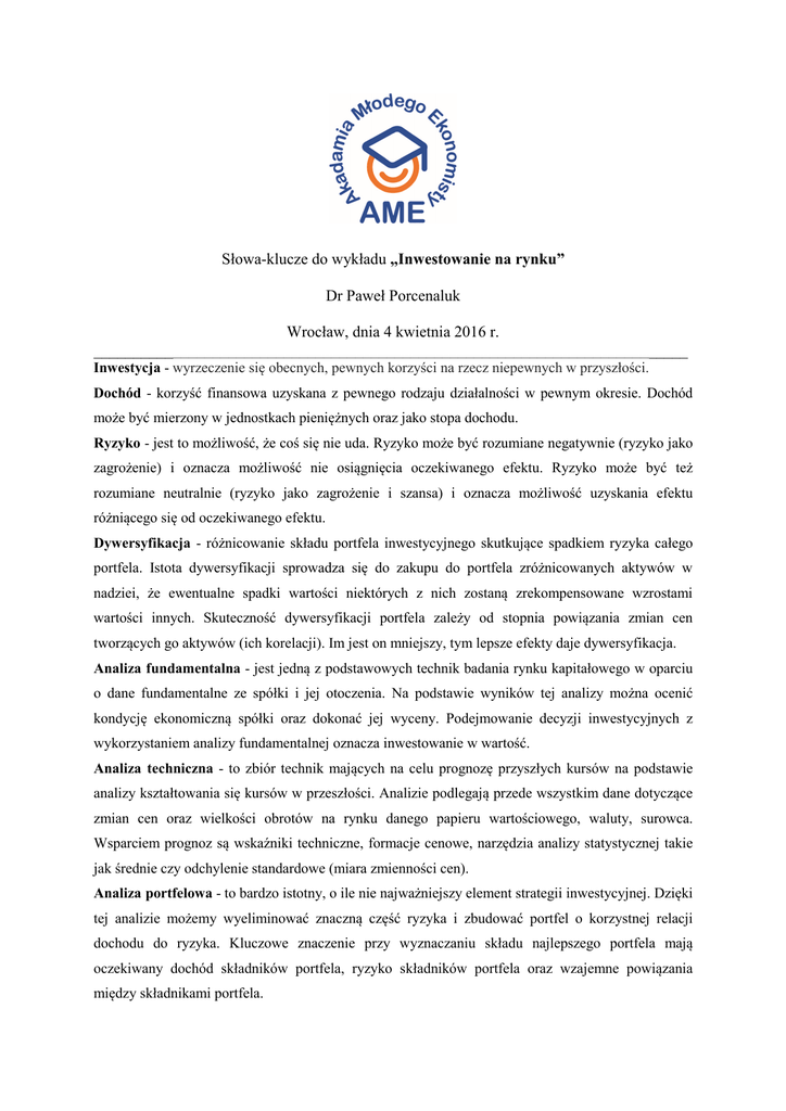 Słowa-klucze do wykładu „Inwestowanie na rynku” Dr Paweł Porcenaluk Wrocław, dnia 4 kwietnia 2016 r. ___________________________________________________________________________ Inwestycja - wyrzeczenie się obecnych, pewnych korzyści na rzecz niepewnych w przyszłości. Dochód - korzyść finansowa uzyskana z pewnego rodzaju działalności w pewnym okresie. Dochód może być mierzony w jednostkach pieniężnych oraz jako stopa dochodu. Ryzyko - jest to możliwość, że coś się nie uda. Ryzyko może być rozumiane negatywnie (ryzyko jako zagrożenie) i oznacza możliwość nie osiągnięcia oczekiwanego efektu. Ryzyko może być też rozumiane neutralnie (ryzyko jako zagrożenie i szansa) i oznacza możliwość uzyskania efektu różniącego się od oczekiwanego efektu. Dywersyfikacja - różnicowanie składu portfela inwestycyjnego skutkujące spadkiem ryzyka całego portfela. Istota dywersyfikacji sprowadza się do zakupu do portfela zróżnicowanych aktywów w nadziei, że ewentualne spadki wartości niektórych z nich zostaną zrekompensowane wzrostami wartości innych. Skuteczność dywersyfikacji portfela zależy od stopnia powiązania zmian cen tworzących go aktywów (ich korelacji). Im jest on mniejszy, tym lepsze efekty daje dywersyfikacja. Analiza fundamentalna - jest jedną z podstawowych technik badania rynku kapitałowego w oparciu o dane fundamentalne ze spółki i jej otoczenia. Na podstawie wyników tej analizy można ocenić kondycję ekonomiczną spółki oraz dokonać jej wyceny. Podejmowanie decyzji inwestycyjnych z wykorzystaniem analizy fundamentalnej oznacza inwestowanie w wartość. Analiza techniczna - to zbiór technik mających na celu prognozę przyszłych kursów na podstawie analizy kształtowania się kursów w przeszłości. Analizie podlegają przede wszystkim dane dotyczące zmian cen oraz wielkości obrotów na rynku danego papieru wartościowego, waluty, surowca. Wsparciem prognoz są wskaźniki techniczne, formacje cenowe, narzędzia analizy statystycznej takie jak średnie czy odchylenie standardowe (miara zmienności cen). Analiza portfelowa - to bardzo istotny, o ile nie najważniejszy element strategii inwestycyjnej. Dzięki tej analizie możemy wyeliminować znaczną część ryzyka i zbudować portfel o korzystnej relacji dochodu do ryzyka. Kluczowe znaczenie przy wyznaczaniu składu najlepszego portfela mają oczekiwany dochód składników portfela, ryzyko składników portfela oraz wzajemne powiązania między składnikami portfela.