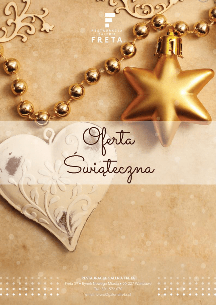 T RESTAURACJA GALERIA FRETA Freta 39 Rynek Nowego Miasta 00-227 Warszawa Tel.: 501 572 070 email: [email protected] PRZYKŁADOWE MENU I Przystawka zimna /do wyboru - 7 dni przed przyjęciem/ Faszerowany sandacz z polskich jezior z dodatkiem winiaku i cytrusową pianką lub Rostbef pieczony w kruszonym pieprzu podany na mieszanych sałatach z owocami granatu i dresingiem truskawkowym Zupa /do wyboru - 7 dni przed przyjęciem/ Zupa grzybowa z suszonych borowików podana z chmurką kwaśnej śmietany i łazankami lub Tradycyjny żur polski na zakwasie z białą kiełbasą, tartym chrzanem i jajkiem Danie główne /do wyboru - 7 dni przed przyjęciem/ Halibut w sosie z mazurskich raków z ryżem jaśminowym i smażonym groszkiem cukrowym na maśle klarowanym lub Pieczona kaczka z jabłkiem i pomarańczą podana z sałatką z polskich wiśni i buraczków z sosem żurawinowym i ziemniakami po staropolsku. Deser Tort makowy z bakaliami aromatyzowany koniakiem Napoje Kompot z suszonych owoców RESTAURACJA GALERIA FRETA Freta 39 Rynek Nowego Miasta 00-227 Warszawa Tel.: 501 572 070 email: [email protected] PRZYKŁADOWE MENU II Przystawki zimne podane w stół Wybór mięs pieczonych podawanych z domowymi marynatami i sosem tatarskim /schab, karkówka z majerankiem, boczek rolowany z czosnkiem/ Pasztet z kaczki pieczony w plastrach boczku podawany z sosem żurawinowym Matias marynowany podany na smażonych rydzach z chrupiącą cebulką Sandacz faszerowany z dodatkiem winiaku w cytrynowej galarecie Mieszane sałaty z grillowanym łososiem, cykorią, kaparami, rzodkiewką i świeżym ogórkiem skropione dressingiem cytrynowym Tradycyjna sałatka jarzynowa Pieczywo, masło Przystawka ciepła podana w stół Wigilijne pierogi z kapustą i grzybami Zupa /do wyboru - 7 dni przed przyjęciem/ Zupa grzybowa z suszonych borowików podana z chmurką kwaśnej śmietany i łazankami lub Malinowy barszcz czerwony z pasztecikiem nadziewanym leśnymi grzybami Danie główne /do wyboru - 7 dni przed przyjęciem/ Filet sandacza zapiekany ze świeżą bazylią, podany z sosem grzybowym, kalafiorem romanesco i maślanymi ziemniakami lub Eskalopki wieprzowe w kremowym sosie musztardowo-miodowym z ziemniakami opiekanymi, czosnkiem i tymiankiem RESTAURACJA GALERIA FRETA Freta 39 Rynek Nowego Miasta 00-227 Warszawa Tel.: 501 572 070 email: [email protected] Patery deserów Tradycyjny sernik krakowski z rodzynkami i skórką pomarańczową Piernik staropolski przekładany domowymi powidłami śliwkowymi Świąteczny makowiec z miodem i bakaliami Napoje Kompot z suszonych owoców. RESTAURACJA GALERIA FRETA Freta 39 Rynek Nowego Miasta 00-227 Warszawa Tel.: 501 572 070 email: [email protected]