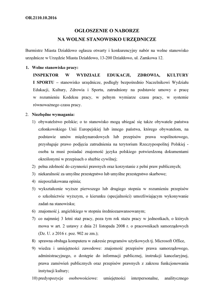 OR.2110.10.2016 OGŁOSZENIE O NABORZE NA WOLNE STANOWISKO URZĘDNICZE Burmistrz Miasta Działdowo ogłasza otwarty i konkurencyjny nabór na wolne stanowisko urzędnicze w Urzędzie Miasta Działdowo, 13-200 Działdowo, ul. Zamkowa 12. 1. Wolne stanowisko pracy: INSPEKTOR W WYDZIALE EDUKACJI, ZDROWIA, KULTURY I SPORTU – stanowisko urzędnicze, podległy bezpośrednio Naczelnikowi Wydziału Edukacji, Kultury, Zdrowia i Sportu, zatrudniony na podstawie umowy o pracę w rozumieniu Kodeksu pracy, w pełnym wymiarze czasu pracy, w systemie równoważnego czasu pracy. 2. Niezbędne wymagania: 1) obywatelstwo polskie; o to stanowisko mogą ubiegać się także obywatele państwa członkowskiego Unii Europejskiej lub innego państwa, którego obywatelom, na podstawie umów międzynarodowych lub przepisów prawa wspólnotowego, przysługuje prawo podjęcia zatrudnienia na terytorium Rzeczypospolitej Polskiej osoba ta musi posiadać znajomość języka polskiego potwierdzoną dokumentami określonymi w przepisach o służbie cywilnej; 2) pełna zdolność do czynności prawnych oraz korzystanie z pełni praw publicznych; 3) niekaralność za umyślne przestępstwo lub umyślne przestępstwo skarbowe; 4) nieposzlakowana opinia; 5) wykształcenie wyższe pierwszego lub drugiego stopnia w rozumieniu przepisów o szkolnictwie wyższym, o kierunku (specjalności) umożliwiającym wykonywanie zadań na stanowisku; 6) znajomość j. angielskiego w stopniu średniozaawansowanym; 7) co najmniej 3 letni staż pracy, poza tym rok stażu pracy w jednostkach, o których mowa w art. 2 ustawy z dnia 21 listopada 2008 r. o pracownikach samorządowych (Dz. U. z 2016 r. poz. 902 ze zm.); 8) sprawna obsługa komputera w zakresie programów użytkowych tj. Microsoft Office, 9) wiedza i umiejętności zawodowe: znajomość przepisów prawa samorządowego, administracyjnego, o dostępie do informacji publicznej, instrukcji kancelaryjnej, prawa zamówień publicznych oraz przepisów prawnych z zakresu funkcjonowania instytucji kultury; 10) predyspozycje osobowościowe: umiejętności interpersonalne, analitycznego i syntetycznego myślenia, komunikatywność, konsekwencja, odpowiedzialność, odporność na stres. 3. Wymagania dodatkowe: 1) wykształcenie w kierunku: − dziennikarstwo − komunikacja społeczna − medioznawstwo − edytorstwo tekstów − grafika komputerowa; 2) doświadczenie w pracy na stanowisku kierowniczym; 3) wiedza z zakresu praktycznego stosowania prawa na zajmowanym stanowisku; 4) doświadczenie w zakresie obsługi klienta; 5) zdolności organizatorskie. 4. Zadania wykonywane na stanowisku: Do głównych zadań pracownika ubiegającego się o stanowisko w niniejszym naborze należy: 1) doradztwo w kształtowaniu i koordynacja polityki miasta w zakresie kultury, promocji i współpracy z zagranicą; 2) propagowanie działalności sportowej i turystycznej; 3) inspirowanie organizacji imprez i przedsięwzięć kulturalnych; 4) wspieranie i promocja inicjatyw (mieszkańców, organizacji pozarządowych i innych animatorów) z zakresu kultury w formie finansowej lub pozafinansowej; 5) opracowywanie preliminarzy wydatków budżetu miasta w zakresie właściwym dla tej części zadań; 6) współpraca z instytucjami, szkołami, stowarzyszeniami w zakresie organizacji imprez kulturalnych i promujących miasto oraz koordynowanie i nadzorowanie ich realizcji, a także finansowanie zadań uznanych za proirytetowe dla miasta; 7) nadzór i ocena działalności merytorycznej miejskich instytucji kultury: Miejskiego Domu Kultury, Miejskiej Biblioteki Publicznej, Interaktywnego Muzeum Państwa Krzyżackiego; 8) pozyskiwanie środków finansowych na działalność w zakresie kultury, w tym na rozwój bazy; 9) opracowywanie przy współudziale miejskich instytucji kultury kalendarzy imprez kulturalnych; 10) współdziałanie z Wydziałem Gospodarki Przestrzennej i Planowania Inwestycji w zakresie ochrony dóbr kultury; 11) inicjowanie i organizowanie przedsięwzięć i projektów we współdziałaniu z Referatem Zamówień Publicznych i Projektów Europejskich, ukierunkowanych na pozyskiwanie środków z funduszy Unii Europejskich na ochronę i rewitalizację dóbr kultury; 12) przygotowywanie informacji dla potrzeb wydawniczych (katalogi, foldery, informatory, biuletyny itp.) w zakresie kultury; 13) zbieranie i archiwizowanie materiałów, w tym fotograficznych, związanych z historią miasta oraz ważniejszymi imprezami kulturalnymi w mieście; 14) prowadzenie spraw związanych z nadawaniem przez Radę Honorowego Obywatelstwa Miasta Działdowo; 15) współdziałanie w sprawach budowy i remontów obietków kultury na terenie miasta; 16) kreowanie wizerunku i promocja miasta w kontaktach wewnętrznych i zagranicznych, w tym nawiązanie trwalszej współpracy z innymi samorządami na poziomie regionalnym i krajowym; 17) dysponowanie budżetem promocji miasta; 18) inicjowanie zamierzeń promocyjnych miasta, ze szczególnym uwzględnieniem celów określonych w Strategii Rozwoju Gminy-Miasto Działdowo; 19) opracowywanie i współudział w opracowywaniu koncepcji materialów promocyjnych i informacyjnych o mieście, zlecanie i nadzór ich wykonania lub ich zakup oraz dystrybucja; 20) współpraca z podmiotami gospodarczymi miasta w zakresie redagowania oferty inwestycyjnej miasta oraz pozyskiwania nowych inwestorów i partnerów gospodarczych; 21) uczestnictwo w targach, wystawach i innych imprezach o charakterze promocyjnym w celu promocji gospodarczych atutów miasta, jako miejsca potencjalnego inwestowania oraz upowszechniania wiedzy o możliwości wykorzystania jego walorów, jako bazy rekreacyjno – turystycznej; 22) uzgadnianie, współpraca i monitoring planów imprez, przedsięwzięć i innych działań promujących miasta realizowanych przez miejskie jednostki organizacyjne oraz proponowanych przez niezależnych organizatorów; 23) ocena skuteczności promocji miasta i kreowania jego wizerunku; 24) pro