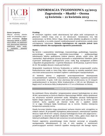INFORMACJA TYGODNIOWA 13/2013 Zagrożenia – Skutki – Ocena 15 kwietnia – 21 kwietnia 2013 22 kwietnia 2013 WYDZIAŁ ANALIZ SYTUACJA METEOROLOGICZNO-HYDROLOGICZNA Ocena i prognoza: Obecne wzrosty stanów wody nie powodują zagrożenia powodzią. Według informacji IMGW w najbliższych dniach, na większości rzek obserwować będziemy stabilizację stanu wody, a następnie powolne opadanie. Przebieg: W minionym tygodniu nadal obserwowany był spływ wód roztopowych na głównych rzekach kraju oraz w ich dorzeczach. Zanotowano trzy fale wezbraniowe: na Wiśle, Odrze i Bugu. Stany wody układały się głównie w strefie wody wysokiej, a na wielu stacjach wodowskazowych przekroczone zostały stany ostrzegawcze i alarmowe. Sytuacja hydrologiczna nie zagrażała jednak życiu i zdrowiu ludności. Nie występowało zagrożenie powodziowe. Skutki: Na terenie i województw: lubelskiego, mazowieckiego, podlaskiego, kujawskopomorskiego, pomorskiego, warmińsko-mazurskiego i podkarpackiego odnotowano lokalne podtopienia (zalane piwnice, garaże, użytki rolne, łąki i pastwiska). Najtrudniejsza sytuacja panowała w województwie lubelskim, gdzie w gminach dotkniętych podtopieniami przez rzekę Bug występował problem z dojazdem do gospodarstw – w gminie Sławatycze do 83 posesji, w gminie Hanna do 32. Nie podjęto decyzji o ewakuacji ludności. Wojewódzki Inspektorat Ochrony Środowiska w Lublinie przeprowadził analizy fizykochemiczne wody w rzece Bug, które wskazują na wysoką zawartość tlenu oraz brak zanieczyszczenia metalami ciężkimi i substancjami ropopochodnymi. 22 kwietnia alarmy i pogotowia przeciwpowodziowe obowiązywały w województwach: lubelskim, mazowieckim, dolnośląskim, kujawsko-pomorskim oraz pomorskim. O godz. 5.00 stan alarmowy był przekroczony na 13 stacjach wodowskazowych w dorzeczu Wisły (maksymalnie o 118 cm we Włodawie na Bugu) oraz 5 w dorzeczu Odry (maksymalnie o 17 cm w Nietkowie na Odrze). PROGNOZA 30-DNIOWA Na podstawie Oceny aktualnej i prognozowanej sytuacji hydrologicznej na okres 30 dni, opracowanej w Centrum Nadzoru Operacyjnego IMGW, należy spodziewać się utrzymania wysokich poziomów wody. Następnie sytuacja hydrologiczna będzie ulegać poprawie, a poziom wód powinien obniżyć się do strefy stanów średnich. Suma opadów jak również liczba dni z opadem (około 11 w ciągu miesiąca) będą kształtować się w normie. Średnia miesięczna temperatura powyżej normy. Opady burzowe lokalnie mogą powodować wahania stanów wód, szczególnie na małych ciekach. W przypadku wystąpienia jednorazowych, intensywnych opadów deszczu rzędu 40-50 mm i więcej, sytuacja hydrologiczna może ulec pogorszeniu szczególnie w zlewniach górskich dopływów Wisły i Odry, gdzie może dojść do lokalnych podtopień. Obecnie taki scenariusz nie jest przewidywany. Poziom zagrożenia powodziowego może również wzrosnąć w przypadku występowania kilkudobowych (3 lub 4 dni) opadów o wartościach przekraczających wartości średnich opadów miesięcznych dla danego rejonu. INFORMACJA TYGODNIOWA 15.4 – 21.4. 2013 Wówczas może wystąpić intensywny spływ wód opadowych do rzek zarówno na obszarach górskich jak i nizinnych. OST ZAGROŻENIA POŻAROWEGO W LASACH I ZWIĘKSZONA LICZBA INTERWENCJI STRAŻY POŻARNEJ W ZWIĄZKU Z WYPALANIEM TRAW Ocena i prognoza: Wraz ze wzrostem temperatur i zanikiem opadów, zagrożenie pożarowe w lasach będzie wzrastać. W RCB rozpoczęto monitorowanie tego zjawiska. Przebieg: Według Instytutu Badawczego Leśnictwa w lasach na terenie większości województw w ciągu tygodnia utrzymywał się 3. (duży), w skali 3-stopniowej, stopień zagrożenia pożarowego. Skutki: Względnie suche powietrze oraz stosunkowo nieduże opady, przyczyniły się do wzrostu zagrożenia pożarowego do stopnia najwyższego. Stwarza to ryzyko występowania pożarów w lasach. Równie niebezpieczne jest nagminne o tej porze roku wypalanie traw. Taka sytuacja miała miejsce m.in. 18 bm. na terenie jednej z warszawskich dzielnic, co doprowadziło do dużego zadymienia obszaru. Tego samego dnia w woj. podkarpackim odnotowano pierwszą śmiertelną ofiarę wypalania trawy. Ministerstwo Straw Wewnętrznych i Państwowa Straż Pożarna we wspólnym komunikacie zaapelowały o zaprzestanie tego procederu. KOLEJKI CIĘŻARÓWEK NA DROGOWYCH PRZEJŚCIACH GRANICZNYCH Ocena i prognoza: Podobna sytuacja miała miejsce w grudniu ubiegłego roku przed okresem świątecznym. Największe problemy odnotowano wówczas w województwie podlaskim. Wydłużone czasy oczekiwania przyczyniają się do powstawania korków na drogach prowadzących do przejść granicznych i zatrzymywania ciężarówek na jezdniach. Powoduje to zagrożenie dla bezpieczeństwa w ruchu drogowym. Problemem są również braki w infrastrukturze higienicznosanitarnej. Sytuacja ta stanowi utrudnienie dla mieszkańców okolicznych miejscowości i może przyczynić się do wystąpienia protestów społecznych. Przebieg: Od początku ubiegłego tygodnia na granicznych przejściach drogowych z Białorusią i Ukrainą odnotowywano wydłużone czasy oczekiwania na odprawę dla samochodów ciężarowych. Według przedstawicieli Straży Granicznej i Izby Celnej, przyczyną jest wzmożony ruch związany ze zbliżającym się długim weekendem oraz prawosławnymi Świętami Wielkanocnymi. Skutki: W ciągu tygodnia kierowcy ciężarówek w oczekiwaniu na kontrolę graniczną musieli spędzić od 4 do nawet 42 godzin. Służba Celna zachęca przewoźników dokonujących przewozów międzynarodowych do bieżącego śledzenia sytuacji na przejściach i wybieranie, w miarę możliwości tych mniej obciążonych. DRÓB Z SALMONELLĄ TRAFIŁ ZE SŁOWACJI DO POLSKI Ocena i prognoza: Salmonella enteritidis to bakteria powodująca zapalenie jelita cienkiego i grubego. Wywołuje zatrucia pokarmowe z objawami w postaci gorączki, biegunki i nudności. Przebieg: 18 bm. Główny Lekarz Weterynarii (GLW