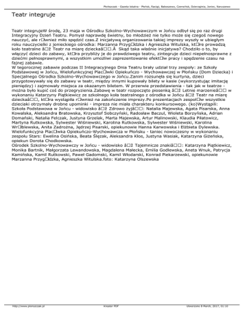 Płońszczak - Gazeta lokalna - Płońsk, Raciąż, Baboszewo, Czerwińsk, Dzierzążnia, Joniec, Naruszewo Teatr integruje Teatr integrujeW środę, 23 maja w Ośrodku Szkolno-Wychowawczym w Jońcu odbył się po raz drugi Integracyjny Dzień Teatru. Pomysł naprawdę świetny, bo młodzież nie tylko może się czegoś nowego nauczyć, ale rÃłwnież miło spędzić czas.Z inicjatywą organizowania takiej imprezy wyszły w ubiegłym roku nauczycielki z jonieckiego ośrodka: Marzanna PrzygÃłdzka i Agnieszka Witulska, ktÃłre prowadzą koło teatralne „Teatr na miarę dziecka―. Skąd taka właśnie inicjatywa? Chodziło o to, by włączyć dzieci do zabawy, ktÃłra przybliży je do prawdziwego teatru, zintegruje dzieci niepełnosprawne z dziećmi pełnosprawnymi, a wszystkim umożliwi zaprezentowanie efektÃłw pracy i spędzenie czasu na fajnej zabawie. W tegorocznej zabawie podczas II Integracyjnego Dnia Teatru brały udział trzy zespoły: ze Szkoły Podstawowej w Jońcu, Wielofunkcyjnej PlacÃłwki Opiekuńczo - Wychowawczej w Płońsku (Dom Dziecka) i Specjalnego Ośrodka Szkolno-Wychowawczego w Jońcu.Zanim rozsunęła się kurtyna, dzieci przygotowywały się do zabawy w teatr, między innymi kupowały bilety w kasie (wykorzystując imitację pieniędzy) i zajmowały miejsca za okazanym biletem. W przerwie przedstawienia - tak jak w teatrze można było kupić coś do przegryzienia.Zabawę w teatr rozpoczęto piosenką „Letnie marzenie― w wykonaniu Katarzyny Piątkiewicz ze szkolnego koła teatralnego z ośrodka w Jońcu „Teatr na miarę dziecka―, ktÃłra wystąpiła rÃłwnież na zakończenie imprezy.Po prezentacjach zespołÃłw wszystkie dzieciaki otrzymały drobne upominki - impreza nie miała charakteru konkursowego. (ko)Wystąpili: Szkoła Podstawowa w Jońcu - widowisko „Zdrowo żyj―: Natalia Majewska, Agata Pisarska, Anna Kowalska, Aleksandra Bratowska, Krzysztof Sobczyński, Radosław Baczul, Wioleta Borzyńska, Adrian Domański, Natalia Felczak, Justyna Grzelak, Marta Majewska, Artur Malinowski, Klaudia Piłatowicz, Martyna Rutkowska, Sylwester Wiśniewski, Karolina Rutkowska, Sylwester Wiśniewski, Karolina WrÃłblewska, Anita Zadrożna, Jędrzej Pisarski, opiekunowie Hanna Karwowska i Elżbieta Dylewska. Wielofunkcyjna PlacÃłwka Opiekuńczo-Wychowawcza w Płońsku - taniec nowoczesny w wykonaniu zespołu Stars: Ewelina Osińska, Beata Ślęzak, Aleksandra Kłos, Justyna Wasiak, Katarzyna Giżeńska, opiekun Dorota Chodkowska. Ośrodek Szkolno-Wychowawczy w Jońcu - widowisko „Tajemnicze znaki―: Katarzyna Piątkiewicz, Monika Bartnik, Małgorzata Lewandowska, Magdalena Małecka, Emilia Godlewska, Aneta Wnuk, Patrycja Kamińska, Kamil Rutkowski, Paweł Gadomski, Kamil Włodarski, Konrad Piekarzewski, opiekunowie Marzanna PrzygÃłdzka, Agnieszka Witulska.foto: Katarzyna Olszewska http://www.plonszczak.pl Kreator PDF Utworzono 8 March, 2017, 01:10
