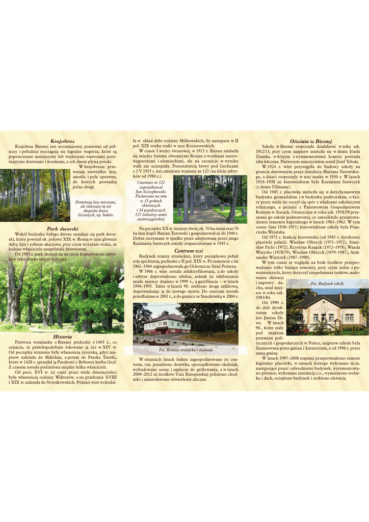Krajobraz Krajobraz Biesnej jest urozmaicony, ponieważ od północy i południa rozciągają się łagodne wzgórza, które są poprzecinane mniejszymi lub większymi wąwozami porośniętymi drzewami i krzakami, a ich dnem płyną potoki. W krajobrazie przeważają niewielkie lasy, zarośla i pola uprawne, do których prowadzą polne drogi. Dominują lasy mieszane, ale zdarzają się też skupiska drzew liściastych, np. buków Park dworski Wokół budynku byłego dworu znajduje się park dworski, który powstał ok. połowy XIX w. Rosną w nim głównie dęby, lipy i robinie akacjowe, przy czym wyraźnie widać, że kolejni właściciele uzupełniali drzewostan. Od 1985 r. park znalazł się na liście konserwatora zabytków jako obiekt objęty ochroną. ła w skład dóbr rodziny Miłkowskich, by następnie w II poł. XIX wieku trafić w ręce Koziorowskich. W czasie I wojny światowej, w 1915 r. Biesna znalazła się między liniami obronnymi Rosjan a wojskami austrowęgierskimi i niemieckimi, ale na szczęście w wyniku walk nie ucierpiała. Pozostałością bitwy pod Gorlicami z 2 V 1915 r. jest cmentarz wojenny nr 121 (na liście zabytków od 1988 r.). Cmentarz nr 121 zaprojektował Jan Szczepkowski. Pochowano na nim w 15 grobach zbiorowych i 34 pojedynczych 137 żołnierzy armii austrowęgierskiej Na początku XX w. tutejszy dwór, ok. 70 ha ziemi oraz 70 ha lasu kupił Marian Turowski i gospodarował aż do 1940 r. Dobra otrzymane w spadku przez adoptowaną przez niego Kazimierę Szewczyk zostały rozparcelowane w 1945 r. Centrum wsi Budynek remizy strażackiej, który początkowo pełnił rolę spichlerza, pochodzi z II poł. XIX w. Po remoncie z lat 1961–1964 zagospodarowała go Ochotnicza Straż Pożarna. W 1966 r. wieś została zelektryfikowana, a do szkoły i sołtysa doprowadzono telefon, jednak jej telefonizacja miała miejsce dopiero w 1999 r., a gazyfikacja – w latach 1994–1995. Także w latach 90. zrobiono drogę asfaltową, doprowadzając ją do nowego mostu. Do centrum została przedłużona w 2001 r., a do granicy ze Staszkówką w 2004 r. Historia Pierwsza wzmianka o Biesnej pochodzi z 1403 r., co oznacza, że prawdopodobnie lokowano ją już w XIV w. Od początku istnienia była własnością rycerską, gdyż najpierw należała do Mikołaja, a potem do Paszka Trestki, który w 1428 r. sprzedał ją Paszkowi z Bobowej herbu Gryf. Z czasem została podzielona między kilku właścicieli. Od pocz. XVI w. jej część przez wiele dziesięcioleci była własnością rodziny Wiktorów, a na przełomie XVIII i XIX w. należała do Nowakowskich. Później wieś wchodzi- Fot. Remiza strażacka i skalniak W ostatnich latach ładnie zagospodarowano jej centrum, tzn. posadzono drzewka, uporządkowano skalniak, wybudowano scenę i zaplecze do grillowania, a w latach 2009–2012 ze środków Unii Europejskiej położono chodniki i zainstalowano oświetlenie uliczne. Oświata w Biesnej Szkoła w Biesnej rozpoczęła działalność w roku szk. 1912/13, przy czym najpierw mieściła się w domu Józefa Ziomka, w którym z wyremontowanej komory powstała izba lekcyjna. Pierwszym nauczycielem został Józef Tobola. W 1924 r. wieś przystąpiła do budowy szkoły na gruncie darowanym przez dziedzica Mariana Turowskiego, a dzieci rozpoczęły w niej naukę w 1930 r. W latach 1924–1938 jej kierownikiem była Kazimiera Szewczyk (z domu Ullmann). Od 1945 r. placówka mieściła się w dotychczasowym budynku gromadzkim i w budynku podworskim, o który przez wiele lat toczył się spór z władzami szkolnictwa rolniczego, a później z Państwowym Gospodarstwem Rolnym w Siarach. Ostatecznie w roku szk. 1958/59 przyznano go szkole podstawowej, co umożliwiło przeprowadzenie remontu kapitalnego w latach 1961–1962. W tym czasie (lata 1938–1971) kierownikiem szkoły była Franciszka Wrońska. Od 1971 r. funkcję kierownika (od 1985 r. dyrektora) placówki pełnili: Wiesław Olbrych (1971–1972), Stanisław Firlit (1972), Krystyna Knapik (1972–1978), Wanda Worytko (1978/79), Wiesław Olbrych (1979–1987), Aleksander Wietrzyk (1987–1990). W tym czasie ze względu na brak środków przeprowadzano tylko bieżące remonty, przy czym jeden z poważniejszych, który dotyczył uzupełnienia tynków, malowania elewacji i naprawy daFot. Budynek szkoły chu, miał miejsce w roku szk. 1983/84. Od 1990 r. do dziś dyrektorem szkoły jest Janina Śliwa. W latach 90., które stały pod znakiem przemian politycznych i gospodarczych w Polsce, najpierw szkoła była finansowana przez gminę i kuratorium, a od 1996 r. przez samą gminę. W latach 1997–2008 etapami przeprowadzono remont kapitalny placówki, w ramach którego wykonano m.in. następujące prace: odwodniono budynek, wyremontowano piwnice, wykonano instalację c.o., wymieniono stolarkę i dach, ocieplono budynek i zrobiono elewację.
