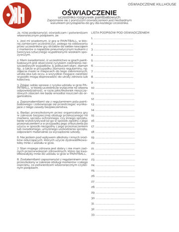 OŚWIADCZENIE KILLHOUSE OŚWIADCZENIE uczestnika rozgrywek paintballowych. Zapoznanie się z poniższym oświadczeniem jest niezbędnym warunkiem przystąpienia do gry dla każdego Uczestnika. Ja, niżej podpisany(a), oświadczam i potwierdzam własnoręcznym podpisem, że: 1. Jest mi wiadomym, iż gra w PAINTBALL, w której zamierzam uczestniczyć, polega na oddawaniu przez uczestników gry strzałów do siebie nawzajem z markerów o napędzie pneumatycznym kulkami z tworzywa sztucznego wypełnionymi woskiem spożywczym, 2. Mam świadomość, iż uczestnictwo w grach paintballowych jest obarczone ryzykiem zaistnienia nieszczęśliwych wypadków, tj. potłuczeń otarć, złamań itp., a także w przypadku złamania regulaminu, np. zdjęcia maski w miejscach do tego zabronionych, utratą oka lub oczu, a wszystkie mogące zaistnieć wypadki mogą doprowadzić do utraty zdrowia lub kalectwa, 3. Zdając sobie sprawę z ryzyka udziału w grze PAINTBALL, w której uczestniczę wyłącznie na własną odpowiedzialność, w razie jakichkolwiek nieszczęśliwych zdarzeń nie będę wnosił(a) roszczeń do organizatora, 4. Zapoznałem(łam) się z regulaminem pola paintballowego i zobowiązuję się przestrzegać wynikające z niego zasady bezpieczeństwa, 5. Będąc przeszkolonym przez organizatora gry w zakresie bezpiecznej obsługi przekazanego mi markera, sprzętu ochronnego, czy innego sprzętu, będę wykorzystywał (a) go w sposób zgodny z jego przeznaczeniem a w przypadku jego zniszczenia po użyciu w sposób niezgodny z jego przeznaczeniem lub świadomego, umyślnego uszkodzenia sprzętu, odpowiem materialnie za wyrządzone szkody, LISTA PODPISÓW POD OŚWIADCZENIEM 1. ..................................................................... 2. ..................................................................... 3. ..................................................................... 4. ..................................................................... 5. ..................................................................... 6. ..................................................................... 7. ..................................................................... 8. ..................................................................... 9. ..................................................................... 10. ..................................................................... 11. ..................................................................... 12. ..................................................................... 13. ..................................................................... 14. ..................................................................... 15. ..................................................................... 16. ..................................................................... 17. ..................................................................... 18. ..................................................................... 6. Nie jestem pod wpływem alkoholu i innych środków odurzających, których użycie dyskwalifikowałoby mnie z udziału w grze, 19. ..................................................................... 7. Stan mojego zdrowia jest dobry i nie mam żadnych przeciwwskazań zdrowotnych, które nie kwalifikowałyby mnie do udziału w grze w PAINTBALL, 21. ..................................................................... 8. Zostałem(łam) zapoznany(a) z regulaminem oraz przeszkolony w zakresie obsługi markerów i całego osprzętu, co potwierdzam własnoręcznym czytelnym podpisem. 23. ..................................................................... 20. ..................................................................... 22. ..................................................................... 24. ..................................................................... 25. ..................................................................... 26. ..................................................................... 27. ..................................................................... 28. ..................................................................... 29. ..................................................................... 30. ..................................................................... 31. ..................................................................... 32. ..................................................................... 33. .....................................................................