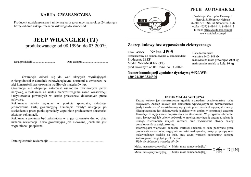 PPUH AUTO-HAK S.J. KARTA GWARANCYJNA Produkcja Zaczepów Kulowych Henryk & Zbigniew Nejman 76-200 SŁUPSK ul. Słoneczna 16K tel/fax (059) 8-414-414; 8-414-413 E-mail: [email protected] www.autohak.com.pl Producent udziela gwarancji niniejszą kartą gwarancyjną na okres 24 miesięcy licząc od dnia zakupu zaczepu kulowego do samochodu: JEEP WRANGLER (TJ) produkowanego od 08.1996r. do 03.2007r. Zaczep kulowy bez wyposaŜenia elektrycznego JP05 Klasa: A50-X Nr kat. Przeznaczony do zamontowania w samochodzie: Data produkcji .............................. Data zakupu................................... Gwarancja odnosi się do wad ukrytych wynikających z niezgodności z aktualnie zobowiązującymi normami a zwłaszcza ze złej konstrukcji, zastosowania wadliwych materiałów itp. Gwarancja nie obejmuje natomiast uszkodzeń zawinionych przez nabywcę, a zwłaszcza na skutek nieprzestrzegania zasad konserwacji i uŜytkowania powstałych w czasie przewozów dokonanych przez nabywcę. Reklamacje naleŜy zgłaszać w punkcie sprzedaŜy, składając jednocześnie kartę gwarancyjną. Usunięcie "wady" następuje po stwierdzeniu przez punkt sprzedaŜy wspólnie z producentem słuszności złoŜonej reklamacji. Reklamacja powinna być załatwiona w ciągu czternastu dni od dnia uznania reklamacji. Karta gwarancyjna jest niewaŜna, jeŜeli nie jest wypełniona i podpisana. Data zgłoszenia reklamacji: ................................................................... Producent: JEEP Model: WRANGLER (TJ) produkowanym od 08.1996r. do 03.2007r. Dane techniczne: wartość siły D: 9,8 kN maksymalna masa przyczepy: 2000 kg maksymalny nacisk na kulę: 80 kg Numer homologacji zgodnie z dyrektywą 94/20/WE: e20*94/20*0334*00 INFORMACJA WSTĘPNA Zaczep kulowy jest skonstruowany zgodnie z zasadami bezpieczeństwa ruchu drogowego. Zaczep kulowy jest elementem wpływającym na bezpieczeństwo jazdy i moŜe zostać zainstalowany wyłącznie przez personel wyspecjalizowany. Niedopuszczalne jest dokonywanie jakichkolwiek zmian w konstrukcji zaczepu. Powoduje to wygaśniecie dopuszczenia do stosowania. W przypadku obecności masy izolacyjnej lub osłony podwozia w miejscu przylegania zaczepu, naleŜy ją usunąć. Nieosłonięte miejsca karoserii oraz wywiercone otwory naleŜy pomalować farbą antykorozyjną. Informacjami wiąŜącymi odnośnie wartości obciąŜeń są dane podawane przez producenta samochodu, względnie wartości maksymalnej masy przyczepy oraz maksymalnego nacisku na kulę, przy czym wartości parametrów zaczepu kulowego nie mogą być przekroczone. Wzór do obliczania wartości siły D: Maks. masa przyczepy [kg] x Maks. masa samochodu [kg] Maks. masa przyczepy [kg] + Maks. masa samochodu [kg] X 9,81 = 1000 D [kN] INSTRUKCJA MontaŜu i eksploatacji zaczepu kulowego Oznaczenie zacisku wg ISO PN 1 L 2 + 3 31 4 R 5 58R 6 54 7 58L M10x40 1 D C Kolejność czynności przy montaŜu Łączenie przewodów Kierunkowskazy lewe Tylne światła przeciwmgłowe Masa Kierunkowskazy prawe Światła pozycyjne prawe Światła hamowania Światła pozycyjne lewe 1998>>M12x40 <<1998 7/16˝x2.5˝ UNC D 1998>>M12x40 <<1998 7/16˝x2.5˝ UNC 1 1. Od lewej podłuŜnicy odkręć fabryczne ucho do holowania, zaś od prawej odkręć śrubę mocującą zderzak. Następnie w te miejsca przykręć elementy zaczepu (poz. C) śrubami jak pokazano na rysunku. 2. PrzyłoŜyć belkę zaczepu (poz. A) do podłuŜnicy, tak aby otwory (poz. 1) pokryły się z fabrycznymi otworami i skręć z nakrętkami zespolonymi (poz. D). 3. Przykręcić część kulistą zaczepu (poz. B) śrubami M12 x 75mm. 4. Dokręcić wszystkie śruby z momentem, jak pokazano w tabeli. 5. Podłączyć przewody z gniazdka 7 – bieg. do instalacji elektrycznej zgodnie z instrukcją fabryczną samochodu (zaleca się wykonanie w ASO). 6. Uzupełnić ewentualne ubytki powłoki malarskiej zaczepu powstałe w trakcie montaŜu. Zalecany moment skręcający dla śrub i nakrętek 8,8: M10x40 M12x75 B M 8 25 Nm M 12 85 Nm M 10 55 Nm M 14 135 Nm M10x30 A C Zaczep kulowy przeznaczony jest do zamontowania w samochodzie JEEP WRANGLER (TJ), produkowanym od 08.1996r. do 03.2007r., nr katalogowy JP 05 i słuŜy do ciągnięcia przyczep o masie całkowitej do 2000 kg i nacisku na kulę max 80 kg. INFORMACJA WSTĘPNA Zaczep kulowy jest skonstruowany zgodnie z zasadami bezpieczeństwa ruchu drogowego a jego niezawodność została potwierdzona licznymi testami. JednakŜe niezawodność zaczepów kulowych jest zaleŜna równieŜ od prawidłowego montaŜu oraz prawidłowej eksploatacji. Z tego powodu prosimy Państwa o staranne przeczytanie niniejszej instrukcji montaŜu oraz przestrzeganie właściwych wskazówek. Zaczep naleŜy zamontować w miejscach do tego celu przeznaczonych przez producenta samochodu. UWAGA Po zamontowaniu zaczepu kulowego naleŜy uzyskać wpis w dowodzie rejestracyjnym pojazdu na „stacji kontroli pojazdów” właściwej dla miejsca zamieszkania. Samochód powinien być wyposaŜony w : -kierunkowskazy boczne -lusterka boczne o rozstawie, co najmniej szerokości przyczepy. Sprawdzać śruby mocujące zaczepu kulowego po około 1 000 km przebiegu eksploatacji. Kula zaczepu musi być utrzymana w czystości i konserwowana smarem stałym