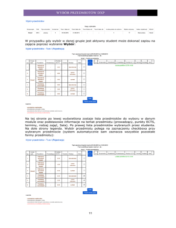 WYBÓR PRZEDMIOTÓW DXP W przypadku gdy wybór w danej grupie jest aktywny student może dokonać zapisu na zajęcia poprzez wybranie Wybór: Na tej stronie po lewej wyświetlona zostaje lista przedmiotów do wyboru w danym module oraz podstawowe informacje na temat przedmiotu (prowadzący, punkty ECTS, terminy, rodzaj zajęć, Sala). Po prawej lista przedmiotów wybranych przez studenta. Na dole strony legenda. Wybór przedmiotu polega na zaznaczeniu checkboxa przy wybranym przedmiocie (system automatycznie sam zaznacza wszystkie pozostałe formy przedmiotu): 11 WYBÓR PRZEDMIOTÓW DXP Następnie za pomocą strzałek przenosimy na prawo przedmioty wybrane. Na tym etapie student może dokonywać samodzielnych modyfikacji. W celu zapisu dokonanego wyboru należy wybrać przycisk Dalej: W tym miejscu znajduje się podsumowanie dokonanej rejestracji. Przycisk Akcpetuj kończy wybór studenta: Tak dokonany wybór studenta widoczny jest w Dziekanacie XP na zakładce Oceny -> Przedmioty wybieralne: 12