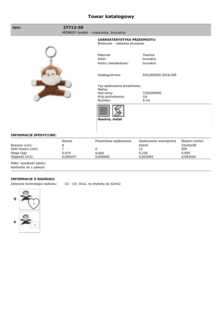 Towar katalogowy Opis: 27712-50 MONKEY brelok - maskotka, brunatny CHARAKTERYSTYKA PRZEDMIOTU: Breloczek – zabawka pluszowa. Materiał: Kolor: Kolory standardowe: Tkanina brunatny brunatny Katalog/strona: EXCURSION 2016/205 Typ opakowania przedmiotu: Marka: Kod celny: 7326200090 Kraj pochodzenia: CN Rozmiar: 8 cm tkanina, metal INFORMACJE SPEDYCYJNE: Rozmiar (cm): Ilość towaru (szt): Waga (kg): Objętość (m3): Sztuka 8 1 0,019 0,000167 Prezentowe opakowanie 0 0,000 0,000000 Maks. wysokość palety: Kartonów na 1 palecie: INFORMACJE O NADRUKU: Zalecona technologia nadruku: Q R U3 - U3: Druk. na etykiety do 62cm2 Opakowanie wewnętrzne 0x0x0 12 0,228 0,002004 Eksport karton 32x45x58 500 9,500 0,083520