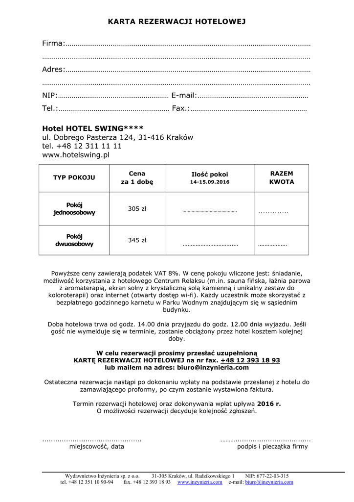 KARTA REZERWACJI HOTELOWEJ Firma:……………………………………………………………………………………………………………… ………………………………………………………………………………………………………………………… Adres:……………………………………………………………………………………………………………… ………………………………………………………………………………………………………………………… NIP:………………………………………………… E-mail:………………………………………………… Tel.:………………………………………………… Fax.:…………………………………………………… Hotel HOTEL SWING**** ul. Dobrego Pasterza 124, 31-416 Kraków tel. +48 12 311 11 11 www.hotelswing.pl TYP POKOJU Cena za 1 dobę 14-15.09.2016 Pokój jednoosobowy 305 zł …………………………………… …………. Pokój dwuosobowy 345 zł ………………………….… ……………… Ilość pokoi RAZEM KWOTA Powyższe ceny zawierają podatek VAT 8%. W cenę pokoju wliczone jest: śniadanie, możliwość korzystania z hotelowego Centrum Relaksu (m.in. sauna fińska, łaźnia parowa z aromaterapią, ekran solny z krystaliczną solą kamienną i unikalny zestaw do koloroterapii) oraz internet (otwarty dostęp wi-fi). Każdy uczestnik może skorzystać z bezpłatnego godzinnego karnetu w Parku Wodnym znajdującym się w sąsiednim budynku. Doba hotelowa trwa od godz. 14.00 dnia przyjazdu do godz. 12.00 dnia wyjazdu. Jeśli gość nie wymelduje się w terminie, zostanie obciążony przez hotel kosztem kolejnej doby. W celu rezerwacji prosimy przesłać uzupełnioną KARTĘ REZERWACJI HOTELOWEJ na nr fax. +48 12 393 18 93 lub mailem na adres: [email protected] Ostateczna rezerwacja nastąpi po dokonaniu wpłaty na podstawie przesłanej z hotelu do zamawiającego proformy, po czym zostanie wystawiona faktura. Termin rezerwacji hotelowej oraz dokonywania wpłat upływa 2016 r. O możliwości rezerwacji decyduje kolejność zgłoszeń. .............................................. miejscowość, data ………................................... podpis i pieczątka firmy Wydawnictwo Inżynieria sp. z o.o. 31-305 Kraków, ul. Radzikowskiego 1 NIP: 677-22-03-315 tel. +48 12 351 10 90-94 fax. +48 12 393 18 93 www.inzynieria.com e-mail: [email protected]