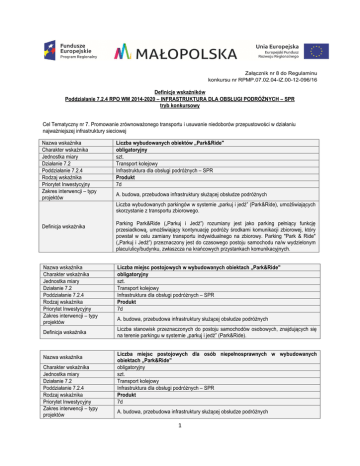 Załącznik nr 8 do Regulaminu konkursu nr RPMP.07.02.04-IZ.00-12-096/16 Definicje wskaźników Poddziałanie 7.2.4 RPO WM 2014-2020 – INFRASTRUKTURA DLA OBSŁUGI PODRÓŻNYCH – SPR tryb konkursowy Cel Tematyczny nr 7. Promowanie zrównoważonego transportu i usuwanie niedoborów przepustowości w działaniu najważniejszej infrastruktury sieciowej Nazwa wskaźnika Charakter wskaźnika Jednostka miary Działanie 7.2 Poddziałanie 7.2.4 Rodzaj wskaźnika Priorytet Inwestycyjny Zakres interwencji – typy projektów Liczba wybudowanych obiektów „Park&Ride" obligatoryjny szt. Transport kolejowy Infrastruktura dla obsługi podróżnych – SPR Produkt 7d A. budowa, przebudowa infrastruktury służącej obsłudze podróżnych Liczba wybudowanych parkingów w systemie „parkuj i jedź” (Park&Ride), umożliwiających skorzystanie z transportu zbiorowego. Definicja wskaźnika Nazwa wskaźnika Charakter wskaźnika Jednostka miary Działanie 7.2 Poddziałanie 7.2.4 Rodzaj wskaźnika Priorytet Inwestycyjny Zakres interwencji – typy projektów Definicja wskaźnika Nazwa wskaźnika Charakter wskaźnika Jednostka miary Działanie 7.2 Poddziałanie 7.2.4 Rodzaj wskaźnika Priorytet Inwestycyjny Zakres interwencji – typy projektów Parking Park&Ride („Parkuj i Jedź”) rozumiany jest jako parking pełniący funkcję przesiadkową, umożliwiający kontynuację podróży środkami komunikacji zbiorowej, który powstał w celu zamiany transportu indywidualnego na zbiorowy. Parking "Park & Ride" („Parkuj i Jedź”) przeznaczony jest do czasowego postoju samochodu na/w wydzielonym placu/ulicy/budynku, zwłaszcza na krańcowych przystankach komunikacyjnych. Liczba miejsc postojowych w wybudowanych obiektach „Park&Ride" obligatoryjny szt. Transport kolejowy Infrastruktura dla obsługi podróżnych – SPR Produkt 7d A. budowa, przebudowa infrastruktury służącej obsłudze podróżnych Liczba stanowisk przeznaczonych do postoju samochodów osobowych, znajdujących się na terenie parkingu w systemie „parkuj i jedź” (Park&Ride). Liczba miejsc postojowych dla osób niepełnosprawnych w wybudowanych obiektach „Park&Ride" obligatoryjny szt. Transport kolejowy Infrastruktura dla obsługi podróżnych – SPR Produkt 7d A. budowa, przebudowa infrastruktury służącej obsłudze podróżnych 1 Liczba stanowisk dla osób niepełnosprawnych przeznaczonych do postoju samochodów osobowych, znajdujących się na terenie parkingu w systemie „parkuj i jedź” (Park&Ride) Definicja wskaźnika Wartość wskaźnika jest bezpośrednio związana z wartością wskaźnika Liczba miejsc postojowych w wybudowanych obiektach „parkuj i jedź”. Należy je rozpatrywać łącznie jako odsetek miejsc dla osób niepełnosprawnych w liczbie miejsc ogółem w nowo wybudowanych obiektach „parkuj i jedź”. Nazwa wskaźnika Charakter wskaźnika Jednostka miary Działanie 7.2 Poddziałanie 7.2.4 Rodzaj wskaźnika Priorytet Inwestycyjny Zakres interwencji – typy projektów Liczba wybudowanych obiektów „Bike&Ride” obligatoryjny szt. Transport kolejowy Infrastruktura dla obsługi podróżnych – SPR Produkt 7d Definicja wskaźnika Nazwa wskaźnika Charakter wskaźnika Jednostka miary Działanie 7.2 Poddziałanie 7.2.4 Rodzaj wskaźnika Priorytet Inwestycyjny Zakres interwencji – typy projektów Definicja wskaźnika Nazwa wskaźnika Charakter wskaźnika Jednostka miary Działanie 7.2 Poddziałanie 7.2.4 Rodzaj wskaźnika Priorytet Inwestycyjny Zakres interwencji – typy projektów A. budowa, przebudowa infrastruktury służącej obsłudze podróżnych Liczba wybudowanych parkingów przeznaczonych umożliwiających skorzystanie z transportu zbiorowego. do pozostawiania rowerów, Liczba stanowisk postojowych w wybudowanych obiektach „Bike&Ride” obligatoryjny szt. Transport kolejowy Infrastruktura dla obsługi podróżnych – SPR Produkt 7d A. budowa, przebudowa infrastruktury służącej obsłudze podróżnych Liczba stanowisk przeznaczonych do przyczepienia ramy roweru, znajdujących się na terenie parkingu przeznaczonego do pozostawiania rowerów. Liczba przebudowanych / odnowionych dworców kolejowych obligatoryjny szt. Transport kolejowy Infrastruktura dla obsługi podróżnych – SPR Produkt 7d A. budowa, przebudowa infrastruktury służącej obsłudze podróżnych Liczba wybudowanych, przebudowanych lub zmodernizowanych obiektów budowlanych (łącznie z przystankami osobowymi/kolejowymi) lub zespołów obiektów budowlanych usytuowanych na obszarze kolejowym do obsługi podróżnych lub usług towarzyszących tej obsłudze, który może również obejmować urządzenia do wykonywania czynności związanych z prowadzeniem ruchu pociągów. Definicja wskaźnika W przypadku objęcia interwencją kilku obiektów budowlanych składających się na dworzec, należy zliczyć jako jeden zespół budynków. Podstawa prawna – Def. dworca kolejowego - Ustawa o transporcie kolejowym (Dz.U. 2003 Nr 86 poz. 789 z poz. zm.) z dnia 28 marca 2003 r., art. 4 pkt 2 ustawy. 2 Nazwa wskaźnika Charakter wskaźników Jednostka miary Działanie 7.2 Poddziałanie 7.2.4 Rodzaj wskaźnika Priorytet Inwestycyjny Zakres interwencji – typy projektów Liczba samochodów korzystających z miejsc postojowych w wybudowanych obiektach „parkuj i jedź” obligatoryjny szt. Transport kolejowy Infrastruktura dla obsługi podróżnych – SPR Rezultat bezpośredni 7d A. budowa, przebudowa infrastruktury służącej obsłudze podróżnych Liczba samochodów, które skorzystały z miejsc postojowych na terenie parkingu w systemie „parkuj i jedź” („Park&Ride”) w ciągu pełnego roku od zakończenia realizacji projektu. Definicja wskaźnika Nazwa wskaźnika Charakter wskaźnika Jednostka miary Działanie 7.2 Poddziałanie 7.2.4 Rodzaj wskaźnika Priorytet Inwestycyjny Zakres interwencji – typy projektów Definicja wskaźnika Nazwa wskaźnika Charakter wskaźnika Jednostka miary Działanie 7.2 Poddziałanie 7.2