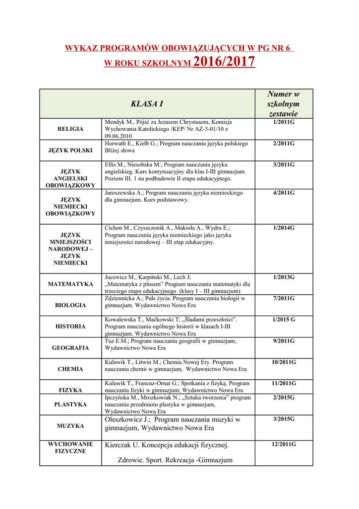 WYKAZ PROGRAMÓW OBOWIĄZUJĄCYCH W PG NR 6 W ROKU SZKOLNYM 2016/2017 KLASA I RELIGIA JĘZYK POLSKI JĘZYK ANGIELSKI OBOWIĄZKOWY JĘZYK NIEMIECKI OBOWIĄZKOWY JĘZYK MNIEJSZOŚCI NARODOWEJ – JĘZYK NIEMIECKI MATEMATYKA BIOLOGIA HISTORIA GEOGRAFIA CHEMIA FIZYKA PLASTYKA MUZYKA WYCHOWANIE FIZYCZNE Numer w szkolnym zestawie Mendyk M., Pójść za Jezusem Chrystusem, Komisja Wychowania Katolickiego /KEP/ Nr AZ-3-01/10 z 09.06.2010 Horwath E., Kiełb G.; Program nauczania języka polskiego Bliżej słowa 1/2011G Ellis M., Niesobska M.; Program nauczania języka angielskieg. Kurs kontynuacyjny dla klas I-III gimnazjum. Poziom III. 1 na podbudowie II etapu edukacyjnego. 3/2011G Jaroszewska A.; Program nauczania języka niemieckiego dla gimnazjum. Kurs podstawowy. 4/2011G Cichon M., Czyszczonik A., Makiola A., Wydra E.; Program nauczania języka niemieckiego jako języka mniejszości narodowej – III etap edukacyjny. 1/2014G Jucewicz M., Karpiński M., Lech J; „Matematyka z plusem” Program nauczania matematyki dla trzeciego etapu edukacyjnego (klasy I – III gimnazjum) Zdziennicka A.; Puls życia. Program nauczania biologii w gimnazjum. Wydawnictwo Nowa Era 1/2013G Kowalewska T., Maćkowski T; „Śladami przeszłości”. Program nauczania ogólnego historii w klasach I-III gimnazjum. Wydawnictwo Nowa Era Tuz E.M.; Program nauczania geografii w gimnazjum, Wydawnictwo Nowa Era 1/2015 G Kulawik T., Litwin M.; Chemia Nowej Ery. Program nauczania chemii w gimnazjum, Wydawnictwo Nowa Era 10/2011G Kulawik T., Francuz-Ornat G.; Spotkania z fizyką. Program nauczania fizyki w gimnazjum; Wydawnictwo Nowa Era Ipczyńska M., Mrozkowiak N.; „Sztuka tworzenia” program nauczania przedmiotu plastyka w gimnazjum, Wydawnictwo Nowa Era 11/2011G Oleszkowicz J.; Program nauczania muzyki w gimnazjum, Wydawnictwo Nowa Era 3/2015G Kierczak U. Koncepcja edukacji fizycznej. 12/2011G Zdrowie. Sport. Rekreacja -Gimnazjum 2/2011G 7/2011G 9/2011G 2/2015G ZAJĘCIA ARTYSTYCZNE Walczak J, Autorski program nauczania zajęć artystycznych w gimnazjum. 2/2014G KLASA II RELIGIA JĘZYK POLSKI JĘZYK ANGIELSKI OBOWIĄZKOWY JĘZYK NIEMIECKI OBOWIĄZKOWY JĘZYK MNIEJSZOŚCI NARODOWEJ – JĘZYK NIEMIECKI MATEMATYKA BIOLOGIA HISTORIA GEOGRAFIA CHEMIA FIZYKA WYCHOWANIE FIZYCZNE Numer w szkolnym zestawie Mendyk M., Pójść za Jezusem Chrystusem, Komisja Wychowania Katolickiego /KEP/ Nr AZ-3-01/10 z 09.06.2010 Horwath E., Kiełb G.; Program nauczania języka polskiego Bliżej słowa 1/2011G Ellis M., Niesobska M.; Program nauczania języka angielskieg. Kurs kontynuacyjny dla klas I-III gimnazjum. Poziom III. 1 na podbudowie II etapu edukacyjnego. 3/2011G Jaroszewska A.; Program nauczania języka niemieckiego dla gimnazjum. Kurs podstawowy. 4/2011G Cichon M., Czyszczonik A., Makiola A., Wydra E.; Program nauczania języka niemieckiego jako języka mniejszości narodowej – III etap edukacyjny. 1/2014G Jucewicz M., Karpiński M., Lech J; „Matematyka z plusem” Program nauczania matematyki dla trzeciego etapu edukacyjnego (klasy I – III gimnazjum) Zdziennicka A.; Puls życia. Program nauczania biologii w gimnazjum. Wydawnictwo Nowa Era 1/2013G Kowalewska T., Maćkowski T; „Śladami przeszłości”. Program nauczania ogólnego historii w klasach I-III gimnazjum. Wydawnictwo Nowa Era Tuz E.M.; Program nauczania geografii w gimnazjum, Wydawnictwo Nowa Era 1/2015 G Kulawik T., Litwin M.; Chemia Nowej Ery. Program nauczania chemii w gimnazjum, Wydawnictwo Nowa Era 10/2011G Kulawik T., Francuz-Ornat G.; Spotkania z fizyką. Program nauczania fizyki w gimnazjum; Wydawnictwo Nowa Era 11/2011G Kierczak U. Koncepcja edukacji fizycznej. 12/2011G 2/2011G 7/2011G 9/2011G Zdrowie. Sport. Rekreacja -Gimnazjum ZAJĘCIA ARTYSTYCZNE INFORMATYKA HISTORIA I KULTURA NIEMIEC Walczak J, Autorski program nauczania zajęć artystycznych w gimnazjum. 2/2014G Koba G.; Program nauczania informatyki dla gimnazjum 13/2011G Cichon M.; Historia i kultura Niemiec 4/2013G KLASA III Numer w szkolnym zestawie Mendyk M., Pójść za Chrystusem, Komisja Wychowania Katolickiego /KEP/ Nr AZ-3-01/10 z 09.06.2010 Horwath E., Kiełb G.; Program nauczania języka polskiego Bliżej słowa Ellis M., Niesobska M.; Program nauczania języka angielskieg. Kurs kontynuacyjny dla klas I-III gimnazjum. Poziom III. 1 na podbudowie II etapu edukacyjnego. Jaroszewska A.; Program nauczania języka niemieckiego dla gimnazjum. Kurs podstawowy. 1/2011G Jucewicz M., Karpiński M., Lech J; „Matematyka z plusem” Program nauczania matematyki dla trzeciego etapu edukacyjnego (klasy I – III gimnazjum) 1/2013G Zdziennicka A.; Puls życia. Program nauczania biologii w gimnazjum. Wydawnictwo Nowa Era 7/2011G BIOLOGIA Kowal A.; Historia. Program nauczania w gimnazjum, Wydawnictwo Szkolne PWN 8/2011G HISTORIA Tuz E.M.; Program nauczania geografii w gimnazjum, Wydawnictwo Nowa Era 9/2011G GEOGRAFIA Kulawik T., Litwin M.; Chemia Nowej Ery. Program nauczania chemii w gimnazjum, Wydawnictwo Nowa Era 10/2011G CHEMIA Kulawik T., Francuz-Ornat G.; Spotkania z fizyką. Program nauczania fizyki w gimnazjum; Wydawnictwo Nowa Era 11/2011G FIZYKA RELIGIA JĘZYK POLSKI JĘZYK ANGIELSKI OBOWIĄZKOWY JĘZYK NIEMIECKI OBOWIĄZKOWY MATEMATYKA WYCHOWANIE FIZYCZNE Kierczak U. Koncepcja edukacji fizycznej. 2/2011G 3/2011G 4/2011G 12/2011G Zdrowie. Sport. Rekreacja -Gimnazjum TECHNIKA INFORMATYKA WOS EDUKACJA DLA BEZPIECZEŃSTWA Białka U,; Zajęcia techniczne. Program nauczania dla gimnazjum 3/2013G Koba G.; Program nauczania informatyki dla gimnazjum 13/2011G Janicka I., Kucia A., Maćkowski T., Dziś i jutro. Program nauczania dla gimnazjum. Część 1 Janicka I., Janicki A., Kucia A., Maćkowski T., Dziś i jutro. Program nauczania dla gimnazjum. Część 2 „Program nauczania z rozkładem materiału do edukacji dla bezpieczeństwa w gimnazjach” autorstwa Mieczysława Borowieckiego, Zbigniewa Pytasza i Edwarda Rygały 8/2013G 9/2013G