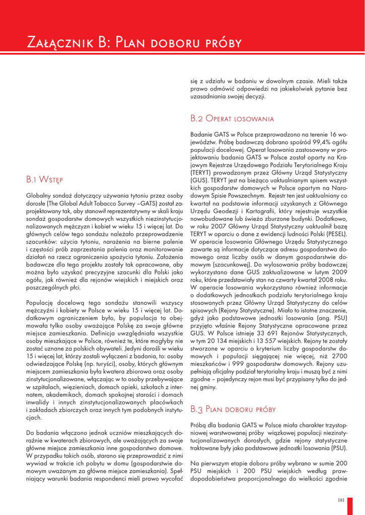 Załącznik B: Plan doboru próby się z udziału w badaniu w dowolnym czasie. Mieli także prawo odmówić odpowiedzi na jakiekolwiek pytanie bez uzasadniania swojej decyzji. B.2 Operat losowania B.1 Wstęp Globalny sondaż dotyczący używania tytoniu przez osoby dorosłe (The Global Adult Tobacco Survey –GATS) został zaprojektowany tak, aby stanowił reprezentatywny w skali kraju sondaż gospodarstw domowych wszystkich niezinstytucjonalizowanych mężczyzn i kobiet w wieku 15 i więcej lat. Do głównych celów tego sondażu należało przeprowadzenie szacunków: użycia tytoniu, narażenia na bierne palenie i częstości prób zaprzestania palenia oraz monitorowanie działań na rzecz ograniczenia spożycia tytoniu. Założenia badawcze dla tego projektu zostały tak opracowane, aby można było uzyskać precyzyjne szacunki dla Polski jako ogółu, jak również dla rejonów wiejskich i miejskich oraz poszczególnych płci. Populację docelową tego sondażu stanowili wszyscy mężczyźni i kobiety w Polsce w wieku 15 i więcej lat. Dodatkowym ograniczeniem było, by populacja ta obejmowała tylko osoby uważające Polskę za swoje główne miejsce zamieszkania. Definicja uwzględniała wszystkie osoby mieszkające w Polsce, również te, które mogłyby nie zostać uznane za polskich obywateli. Jedyni dorośli w wieku 15 i więcej lat, którzy zostali wyłączeni z badania, to: osoby odwiedzające Polskę (np. turyści), osoby, których głównym miejscem zamieszkania była kwatera zbiorowa oraz osoby zinstytucjonalizowane, włączając w to osoby przebywające w szpitalach, więzieniach, domach opieki, szkołach z internatem, akademikach, domach spokojnej starości i domach inwalidy i innych zinstytucjonalizowanych placówkach i zakładach zbiorczych oraz innych tym podobnych instytucjach. Do badania włączono jednak uczniów mieszkających doraźnie w kwaterach zbiorowych, ale uważających za swoje główne miejsce zamieszkania inne gospodarstwo domowe. W przypadku takich osób, starano się przeprowadzić z nimi wywiad w trakcie ich pobytu w domu (gospodarstwie domowym uważanym za główne miejsce zamieszkania). Spełniający warunki badania respondenci mieli prawo wycofać Badanie GATS w Polsce przeprowadzono na terenie 16 województw. Próbę badawczą dobrano spośród 99,4% ogółu populacji docelowej. Operat losowania zastosowany w projektowaniu badania GATS w Polsce został oparty na Krajowym Rejestrze Urzędowego Podziału Terytorialnego Kraju (TERYT) prowadzonym przez Główny Urząd Statystyczny (GUS). TERYT jest na bieżąco uaktualnianym spisem wszystkich gospodarstw domowych w Polsce opartym na Narodowym Spisie Powszechnym. Rejestr ten jest uaktualniany co kwartał na podstawie informacji uzyskanych z Głównego Urzędu Geodezji i Kartografii, który rejestruje wszystkie nowobudowane lub świeżo zburzone budynki. Dodatkowo, w roku 2007 Główny Urząd Statystyczny uaktualnił bazę TERYT w oparciu o dane z ewidencji ludności Polski (PESEL). W operacie losowania Głównego Urzędu Statystycznego zawarte są informacje dotyczące adresu gospodarstwa domowego oraz liczby osób w danym gospodarstwie domowym (szacunkowej). Do wylosowania próby badawczej wykorzystano dane GUS zaktualizowane w lutym 2009 roku, które przedstawiały stan na czwarty kwartał 2008 roku. W operacie losowania wykorzystano również informacje o dodatkowych jednostkach podziału terytorialnego kraju stosowanych przez Główny Urząd Statystyczny do celów spisowych (Rejony Statystyczne). Miało to istotne znaczenie, gdyż jako podstawowe jednostki losowania (ang. PSU) przyjęto właśnie Rejony Statystyczne opracowane przez GUS. W Polsce istnieje 33 691 Rejonów Statystycznych, w tym 20 134 miejskich i 13 557 wiejskich. Rejony te zostały stworzone w oparciu o kryterium liczby gospodarstw domowych i populacji sięgającej nie więcej, niż 2700 mieszkańców i 999 gospodarstw domowych. Rejony uzupełniają oficjalny podział terytorialny kraju i muszą być z nimi zgodne – pojedynczy rejon musi być przypisany tylko do jednej gminy. B.3 Plan doboru próby Próbą dla badania GATS w Polsce miała charakter trzystopniowej warstwowanej próby wiązkowej populacji niezinstytucjonalizowanych dorosłych, gdzie rejony statystyczne traktowane były jako podstawowe jednostki losowania (PSU). Na pierwszym etapie doboru próby wybrano w sumie 200 PSU miejskich i 200 PSU wiejskich według prawdopodobieństwa proporcjonalnego do wielkości zgodnie 181 Rysunek. B.1: Polskie województwa woj. pomorskie woj. warmińskomazurskie woj. zachodniopomorskie woj. podlaskie woj. kujawskopomorskie woj. lubuskie z wymogami doboru próby GATS. W procesie doboru PSU wykorzystano procedurę podziału (stratyfikacji) na PSU miejskie i wiejskie dla każdego z województw. woj. wielkopolskie woj. łódzkie woj. dolnosląskie woj. lubelskie woj. opolskie woj. śląskie Liczba dobranych podstawowych jednostek losowania (PSU) w województwie była proporcjonalna do liczby zarejestrowanych gospodarstw domowych według podziału na wiejskie i miejskie. Informacja o liczbie zarejestrowanych gospodarstw domowych w każdym podzbiorze została zaczerpnięta z rejestru TERYT (patrz tabela B.1), używanego jako operat losowania w badaniu GATS w Polce. Przykład: województwo dolnośląskie liczy 258 922 wiejskich gospodarstw domowych i 779 445 miejskich gospodarstw domowych. Równa się to odpowiednio 6,1% ogółu wiejskich gospodarstw domowych i 8,8% ogółu miejskich gospodarstw domowych. Tak więc w województwie dolnośląskim wylosowano 12 wiejskich rejonów statystycznych (200*6,1%) i 18 miejskich rejonów statystycznych (200*8,8%). Podział na województwa został uwzględniony w procesie stratyfikacji w celu poprawienia reprezentacji geograficznej próby. Wiejskie podstawowe jednostki losowania obejmujące mniej niż 100 gospodarstw domowych zostały wyłączone z planu doboru próby w celu zapewnienia dostępności wyst