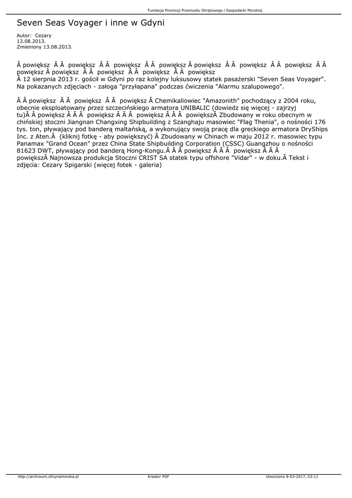 Fundacja Promocji Przemysłu Okrętowego i Gospodarki Morskiej Seven Seas Voyager i inne w Gdyni Autor: Cezary 13.08.2013. Zmieniony 13.08.2013.  powiększ   powiększ   powiększ   powiększ  powiększ   powiększ   powiększ   powiększ  powiększ   powiększ   powiększ   powiększ  12 sierpnia 2013 r. gościł w Gdyni po raz kolejny luksusowy statek pasażerski "Seven Seas Voyager". Na pokazanych zdjęciach - załoga "przyłapana" podczas ćwiczenia "Alarmu szalupowego".   powiększ   powiększ   powiększ  Chemikaliowiec "Amazonith" pochodzący z 2004 roku, obecnie eksploatowany przez szczecińskiego armatora UNIBALIC (dowiedz się więcej - zajrzyj tu)  powiększ    powiększ    powiększ    powiększ Zbudowany w roku obecnym w chińskiej stoczni Jiangnan Changxing Shipbuilding z Szanghaju masowiec "Flag Thenia", o nośności 176 tys. ton, pływający pod banderą maltańską, a wykonujący swoją pracę dla greckiego armatora DryShips Inc. z Aten. (kliknij fotkę - aby powiększyć)  Zbudowany w Chinach w maju 2012 r. masowiec typu Panamax "Grand Ocean" przez China State Shipbuilding Corporation (CSSC) Guangzhou o nośności 81623 DWT, pływający pod banderą Hong-Kongu.   powiększ    powiększ    powiększ Najnowsza produkcja Stoczni CRIST SA statek typu offshore "Vidar" - w doku. Tekst i zdjęcia: Cezary Spigarski (więcej fotek - galeria) http://archiwum.oficynamorska.pl Kreator PDF Utworzono 8-03-2017, 03:11