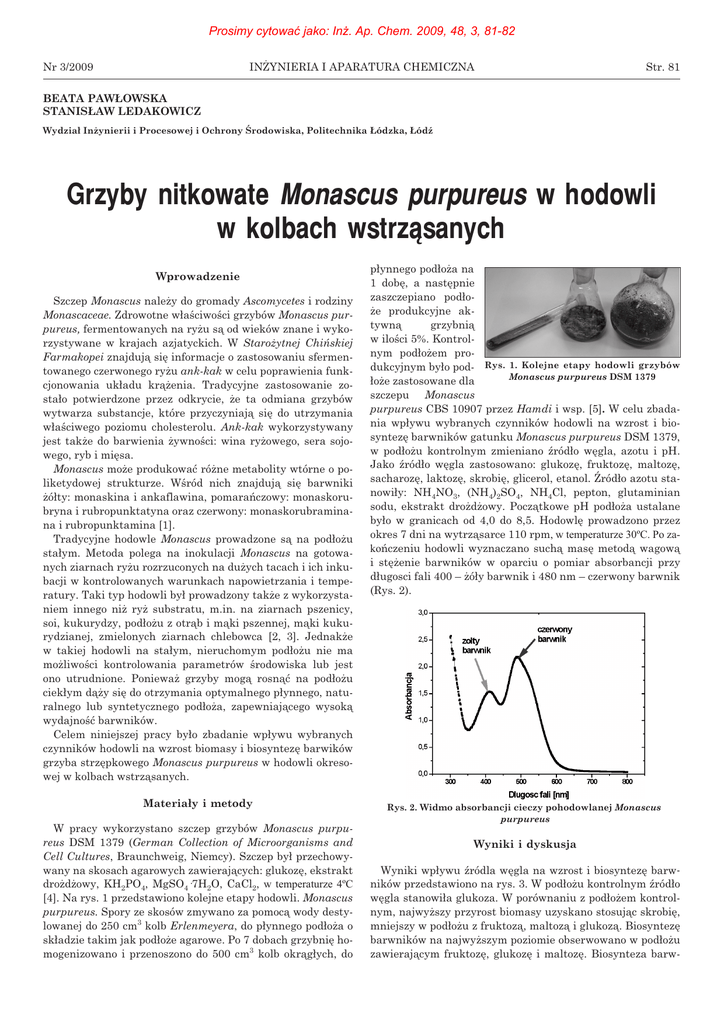 Prosimy cytować jako: Inż. Ap. Chem. 2009, 48, 3, 81-82 Nr 3/2009 IN¯YNIERIA I APARATURA CHEMICZNA Str. 81 BEATA PAW£OWSKA STANIS£AW LEDAKOWICZ Wydzia³ In¿ynierii i Procesowej i Ochrony Œrodowiska, Politechnika £ódzka, £ódŸ Grzyby nitkowate Monascus purpureus w hodowli w kolbach wstrz¹sanych Wprowadzenie Szczep Monascus nale¿y do gromady Ascomycetes i rodziny Monascaceae. Zdrowotne w³aœciwoœci grzybów Monascus purpureus, fermentowanych na ry¿u s¹ od wieków znane i wykorzystywane w krajach azjatyckich. W Staro¿ytnej Chiñskiej Farmakopei znajduj¹ siê informacje o zastosowaniu sfermentowanego czerwonego ry¿u ank-kak w celu poprawienia funkcjonowania uk³adu kr¹¿enia. Tradycyjne zastosowanie zosta³o potwierdzone przez odkrycie, ¿e ta odmiana grzybów wytwarza substancje, które przyczyniaj¹ siê do utrzymania w³aœciwego poziomu cholesterolu. Ank-kak wykorzystywany jest tak¿e do barwienia ¿ywnoœci: wina ry¿owego, sera sojowego, ryb i miêsa. Monascus mo¿e produkowaæ ró¿ne metabolity wtórne o poliketydowej strukturze. Wœród nich znajduj¹ siê barwniki ¿ó³ty: monaskina i ankaflawina, pomarañczowy: monaskorubryna i rubropunktatyna oraz czerwony: monaskorubraminana i rubropunktamina [1]. Tradycyjne hodowle Monascus prowadzone s¹ na pod³o¿u sta³ym. Metoda polega na inokulacji Monascus na gotowanych ziarnach ry¿u rozrzuconych na du¿ych tacach i ich inkubacji w kontrolowanych warunkach napowietrzania i temperatury. Taki typ hodowli by³ prowadzony tak¿e z wykorzystaniem innego ni¿ ry¿ substratu, m.in. na ziarnach pszenicy, soi, kukurydzy, pod³o¿u z otr¹b i m¹ki pszennej, m¹ki kukurydzianej, zmielonych ziarnach chlebowca [2, 3]. Jednak¿e w takiej hodowli na sta³ym, nieruchomym pod³o¿u nie ma mo¿liwoœci kontrolowania parametrów œrodowiska lub jest ono utrudnione. Poniewa¿ grzyby mog¹ rosn¹æ na pod³o¿u ciek³ym d¹¿y siê do otrzymania optymalnego p³ynnego, naturalnego lub syntetycznego pod³o¿a, zapewniaj¹cego wysok¹ wydajnoœæ barwników. Celem niniejszej pracy by³o zbadanie wp³ywu wybranych czynników hodowli na wzrost biomasy i biosyntezê barwików grzyba strzêpkowego Monascus purpureus w hodowli okresowej w kolbach wstrz¹sanych. Materia³y i metody W pracy wykorzystano szczep grzybów Monascus purpureus DSM 1379 (German Collection of Microorganisms and Cell Cultures, Braunchweig, Niemcy). Szczep by³ przechowywany na skosach agarowych zawieraj¹cych: glukozê, ekstrakt dro¿d¿owy, KH2PO4, MgSO4·7H2O, CaCl2, w temperaturze 4ºC [4]. Na rys. 1 przedstawiono kolejne etapy hodowli. Monascus purpureus. Spory ze skosów zmywano za pomoc¹ wody destylowanej do 250 cm3 kolb Erlenmeyera, do p³ynnego pod³o¿a o sk³adzie takim jak pod³o¿e agarowe. Po 7 dobach grzybniê homogenizowano i przenoszono do 500 cm3 kolb okr¹g³ych, do p³ynnego pod³o¿a na 1 dobê, a nastêpnie zaszczepiano pod³o¿e produkcyjne aktywn¹ grzybni¹ w iloœci 5%. Kontrolnym pod³o¿em produkcyjnym by³o pod- Rys. 1. Kolejne etapy hodowli grzybów Monascus purpureus DSM 1379 ³o¿e zastosowane dla szczepu Monascus purpureus CBS 10907 przez Hamdi i wsp. [5]. W celu zbadania wp³ywu wybranych czynników hodowli na wzrost i biosyntezê barwników gatunku Monascus purpureus DSM 1379, w pod³o¿u kontrolnym zmieniano Ÿród³o wêgla, azotu i pH. Jako Ÿród³o wêgla zastosowano: glukozê, fruktozê, maltozê, sacharozê, laktozê, skrobiê, glicerol, etanol. ród³o azotu stanowi³y: NH4NO3, (NH4)2SO4, NH4Cl, pepton, glutaminian sodu, ekstrakt dro¿d¿owy. Pocz¹tkowe pH pod³o¿a ustalane by³o w granicach od 4,0 do 8,5. Hodowlê prowadzono przez okres 7 dni na wytrz¹sarce 110 rpm, w temperaturze 30ºC. Po zakoñczeniu hodowli wyznaczano such¹ masê metod¹ wagow¹ i stê¿enie barwników w oparciu o pomiar absorbancji przy d³ugosci fali 400 – ¿ó³y barwnik i 480 nm – czerwony barwnik (Rys. 2). Rys. 2. Widmo absorbancji cieczy pohodowlanej Monascus purpureus Wyniki i dyskusja Wyniki wp³ywu Ÿródla wêgla na wzrost i biosyntezê barwników przedstawiono na rys. 3. W pod³o¿u kontrolnym Ÿród³o wêgla stanowi³a glukoza. W porównaniu z pod³o¿em kontrolnym, najwy¿szy przyrost biomasy uzyskano stosuj¹c skrobiê, mniejszy w pod³o¿u z fruktoz¹, maltoz¹ i glukoz¹. Biosyntezê barwników na najwy¿szym poziomie obserwowano w pod³o¿u zawieraj¹cym fruktozê, glukozê i maltozê. Biosynteza barw- Prosimy cytować jako: Inż. Ap. Chem. 2009, 48, 3, 81-82 Str. 82 IN¯YNIERIA I APARATURA CHEMICZNA Rys. 3. Wzrost i biosynteza barwników Monascus purpureus w hodowli wg³êbnej w pod³o¿u zawieraj¹cym ró¿ne Ÿród³o wêgla Rys. 4. Wzrost i biosynteza barwników Monascus purpureus w hodowli wg³êbnej w pod³o¿u zawieraj¹cym ró¿ne Ÿród³o azotu ników by³a zahamowana, gdy w pod³o¿u by³a sacharoza lub laktoza. W pracy Lee i wsp. [6] uzyskano podobne rezultaty, najwy¿szy wzrost biomasy na pod³o¿u ze skrobi¹, a wysokie stê¿enie czerwonego barwnika w pod³o¿u zawieraj¹cym glukozê, skrobiê, fruktozê i maltozê. Sacharoza i laktoza równie¿ hamowa³y wzrost i syntezê barwnika grzyba Monascus purpureus ATCC 16365 [6]. Zmiana Ÿród³a azotu nie powodowa³a du¿ych zmian we wzroœcie biomasy, ale znacz¹co wp³ywa³a na biosyntezê barwników (Rys. 4). Najwy¿sz¹ zawartoœæ czerwonego i ¿ó³tego barwnika stwierdzono w przypadku zastosowania w pod³o¿u glutaminianu sodu, mniej w przypadku peptonu i ekstraktu dro¿d¿owego. Znaczne zahamowanie biosyntezy barwników nastêpowa³o, gdy pod³oze zawiera³o nieorganiczne Ÿród³o azotu w postaci NH4NO3, (NH4)2SO4 lub NH4Cl, przy czym obserwowano wy¿sze wartoœci absorbancji przy d³ugoœci fali 400 nm, charakterystyczne dla ¿ó³tego barwnika. Podobne zale¿noœci zaobserwowali Lee i wspó³. [6] dla szczepu Monascus purpureus ATCC 16365, zmiana Ÿród³a azotu nieznacznie wp³ywa³a na wzrost biomasy, ale zmienia³a biosyntezê czerwonego barwnika, natomiast 