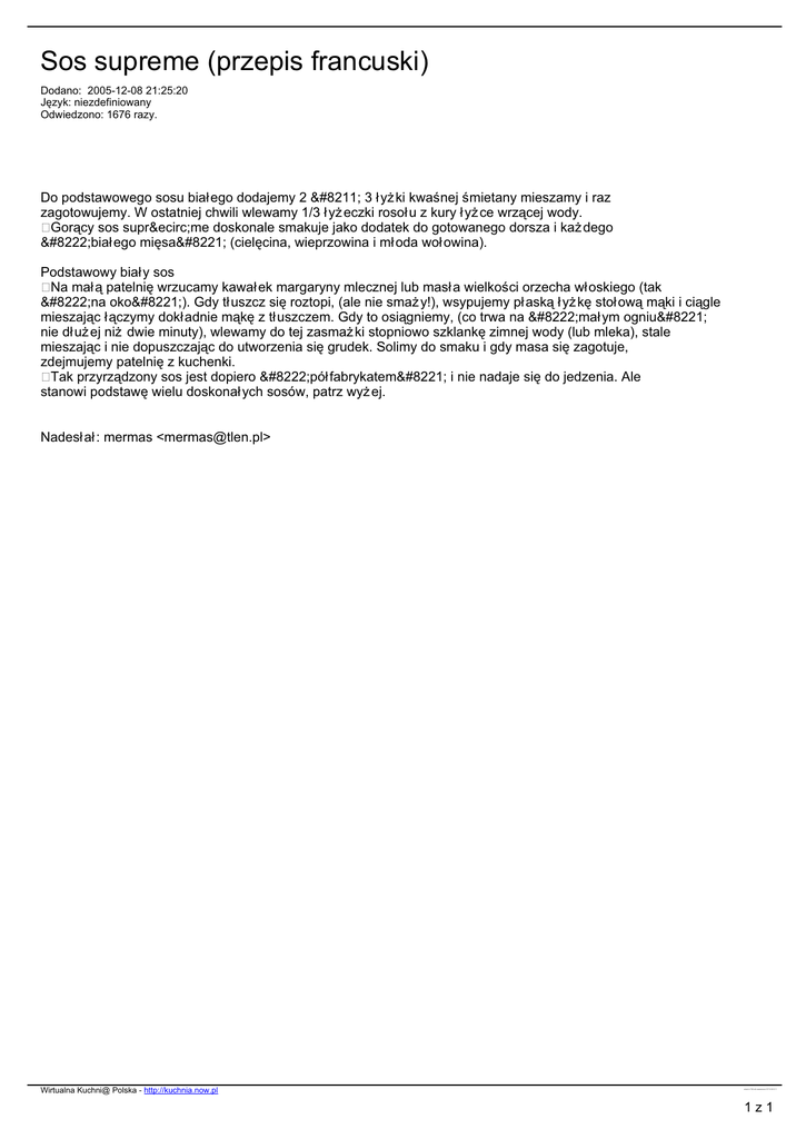 Sos supreme (przepis francuski) Dodano: 2005-12-08 21:25:20 Język: niezdefiniowany Odwiedzono: 1676 razy. Do podstawowego sosu białego dodajemy 2 – 3 łyżki kwaśnej śmietany mieszamy i raz zagotowujemy. W ostatniej chwili wlewamy 1/3 łyżeczki rosołu z kury łyżce wrzącej wody. Gorący sos suprême doskonale smakuje jako dodatek do gotowanego dorsza i każdego „białego mięsa” (cielęcina, wieprzowina i młoda wołowina). Podstawowy biały sos Na małą patelnię wrzucamy kawałek margaryny mlecznej lub masła wielkości orzecha włoskiego (tak „na oko”). Gdy tłuszcz się roztopi, (ale nie smaży!), wsypujemy płaską łyżkę stołową mąki i ciągle mieszając łączymy dokładnie mąkę z tłuszczem. Gdy to osiągniemy, (co trwa na „małym ogniu” nie dłużej niż dwie minuty), wlewamy do tej zasmażki stopniowo szklankę zimnej wody (lub mleka), stale mieszając i nie dopuszczając do utworzenia się grudek. Solimy do smaku i gdy masa się zagotuje, zdejmujemy patelnię z kuchenki. Tak przyrządzony sos jest dopiero „półfabrykatem” i nie nadaje się do jedzenia. Ale stanowi podstawę wielu doskonałych sosów, patrz wyżej. Nadesłał: mermas <[email protected]> Wirtualna Kuchni@ Polska - http://kuchnia.now.pl przepis nr 7260, plik wygenerowano 2017.03.08 03:11 1z1