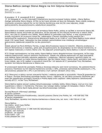 Fundacja Promocji Przemysłu Okrętowego i Gospodarki Morskiej Stena Baltica zastąpi Stena Alegra na linii Gdynia-Karlskrona Autor: Cezary 13.11.2013. Zmieniony 15.11.2013.  powiększ   powiększ    powiększ  24 listopada br. na linii Gdynia–Karlskrona zacznie kursować kolejny statek - Stena Baltica. Zastąpi jednostkę Stena Alegra, ktÃłra na tej trasie pływała od lipca do listopada. Nowy statek zwiększy możliwości przewozu ładunkÃłw na linii Gdynia-Karlskrona oraz skrÃłci czas odprawy, dzięki jednoczesnemu dwupoziomowemu załadunkowi pojazdÃłw. Stena Baltica to statek czarterowany od armatora Stena RoRo, jednej ze spÃłłek w koncernie Stena AB. Stena Baltica nazwę otrzymała po jednostce, ktÃłra pływała na linii Gdynia-Karlskrona w latach 20022011, lecz jest to zupełnie inny statek. Stena Baltica to jednostka typu RoPax, a więc przeznaczona przede wszystkim do przewozu towarÃłw, zabierająca rÃłwnież niewielką liczbę pasażerÃłw i samochodÃłw osobowych. Powierzchnia ładunkowa statku to aż 2188 m, czyli Stena Baltica może zabrać około 130 ciężarÃłwek. Jednostka ma dwa pokłady samochodowe oraz instalacje umożliwiające jednoczesny załadunek pojazdÃłw na obu poziomach.  Statek pływał we flocie Brittany Ferries, a jego dotychczasowa nazwa to Cotentin. Obecnie przebywa w Stoczni Remontowej w Gdańsku, gdzie jest przygotowywany do eksploatacji na linii Gdynia-Karlskrona, w tym będzie malowany w kolory Stena Line. Na zdjęciach prezentujemy Stena Baltica w starym malowaniu. „Dzięki wprowadzeniu na linię statku Stena Baltica mamy długoterminowe rozwiązanie, ktÃłre daje większą elastyczność naszym klientom frachtowym. Statek ma większą ładowność niż jego poprzednik oraz spełnia nasze potrzeby odnośnie załadunku i rozładunku. Obecnie notujemy ogromny popyt na przewozy frachtowe na trasie Gdynia-Karlskrona. OprÃłcz Stena Vision i Stena Spirit, potrzebny jest nam trzeci statek, aby mÃłc zadbać o wszystkich klientÃłw i ich ładunki.― powiedział Tony Michaelsen, dyrektor linii Gdynia-Karlskrona w Stena Line. W przewozach ładunkÃłw pomiędzy Polską a Szwecją widoczny jest trend wzrostowy. Do października br. przewozy frachtowe na linii Gdynia-Karlskrona wzrosły o 18%, przewozy samochodÃłw osobowych o 7%, zaś przewozy pasażerÃłw o 9% w porÃłwnaniu z tym samym okresem 2012 roku. „Wierzymy w dalszy wzrost znaczenia frachtu i większą sprzedaż w przyszłości. RozwÃłj gospodarczy w Polsce i Europie Wschodniej pozostaje bardzo mocny i sądzimy, że zarÃłwno przewozy frachtowe jak i podrÃłże pasażerskie pomiędzy Szwecją a Polską będą coraz częstsze i dalej będziemy odnotowywać wzrosty.―- mÃłwi Tony Michaelsen. Stena Baltica będzie pływać według dotychczasowego rozkładu statku Stena Alegra, czyli po trzy razy tygodniowo z Gdyni i z Karlskrony. Pierwszy rejs nowego statku nastąpi 24 listopada z Gdyni. Promy Stena Vision i Stena Spirit będą pływać wg dotychczasowego rozkładu. SzczegÃłłowych informacji udzielają: W języku polskim: Agnieszka Zembrzycka-Kwiatkowska, rzecznik prasowy Stena Line Polska, tel. +48 508 002 706 W języku angielskim: Tony Michaelsen, dyrektor linii Gdynia-Karlskrona w Stena Line, tel. kom: +46 739-42 17 48. Stena Baltica typ statku: prom typu RoPax rok budowy: 2007 powierzchnia ładunkowa: 2 188 metrÃłw ładunkowych długość: 167 metrÃłw prędkość: 24 węzłÃłw liczba kabin: 120 liczba pasażerÃłw: 210 http://archiwum.oficynamorska.pl Kreator PDF Utworzono 8-03-2017, 03:11